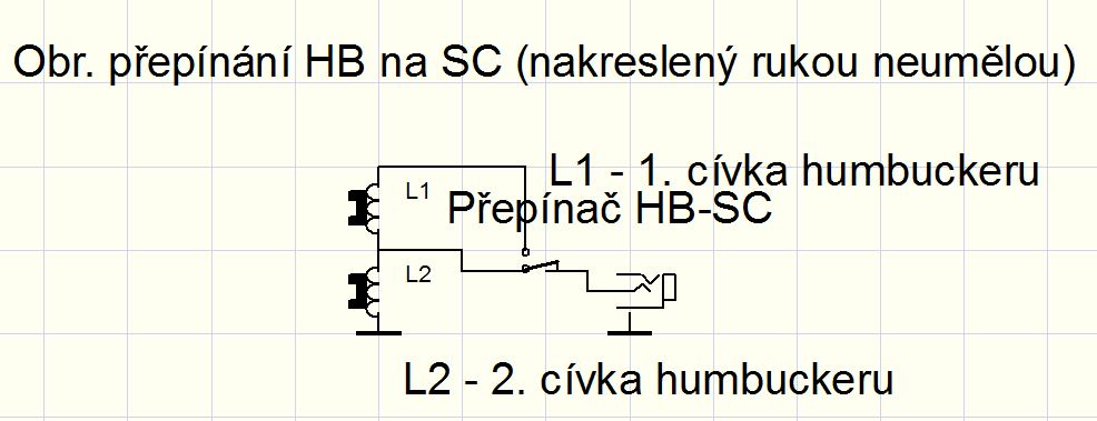 Nic se nerozpíná ani nezkratuje, zkratování by se projevilo kratším dozníváním tónu z důvodu většího tlumení struny mag. polem. Jen a pouze se přepíná, jak jsem už popsal výše, mezi signálem ze dvou cívek v serii - HB a signálem z jedné cívky - SC. Protože patřičné schema jsem nenašel, "nakreslil" jsem nějaké v editoru schemat z ProfiCadu. Za výsledek se stydím, avšak funkce by z toho spolu s předchozím textem mohla být jasná