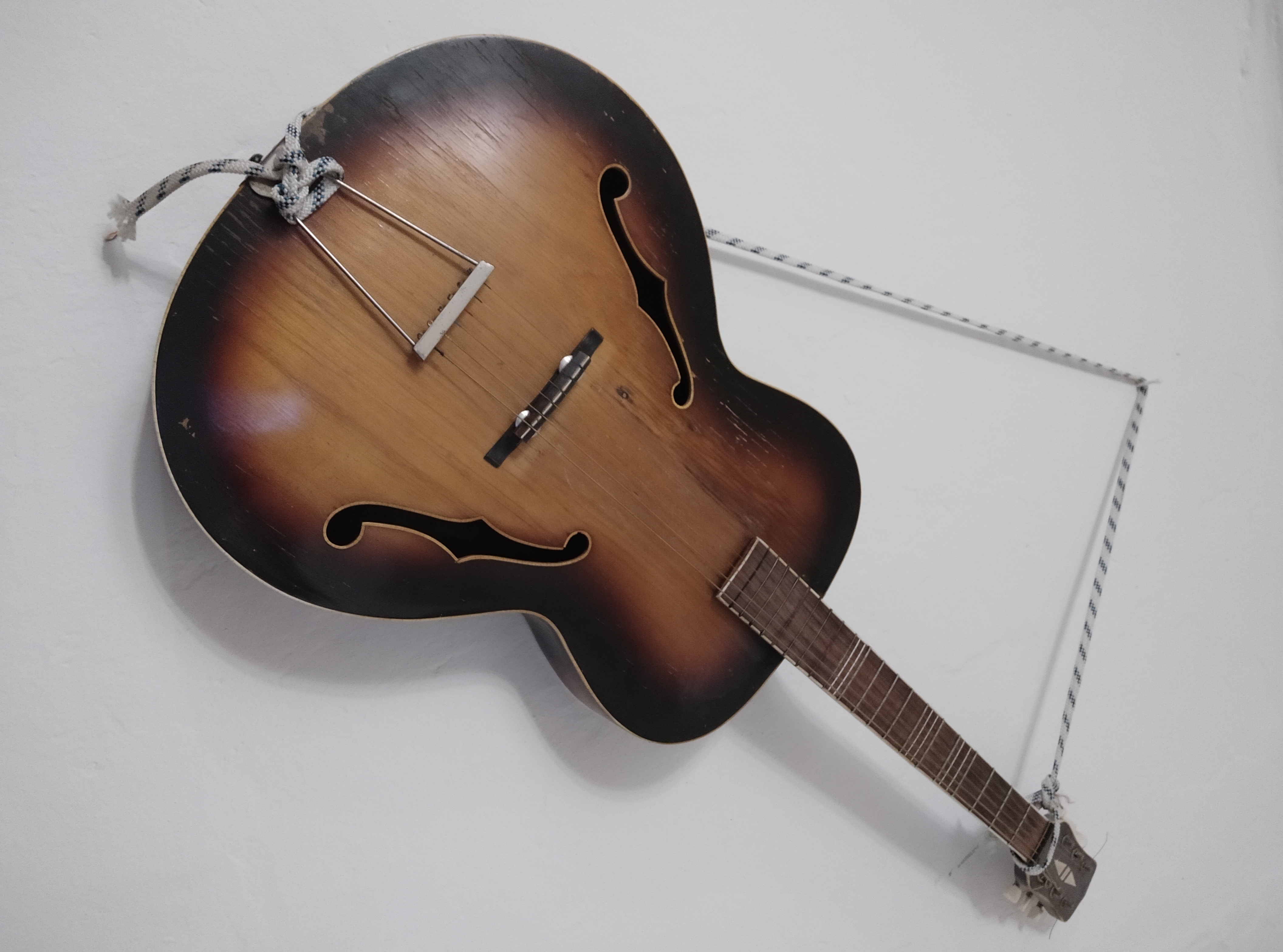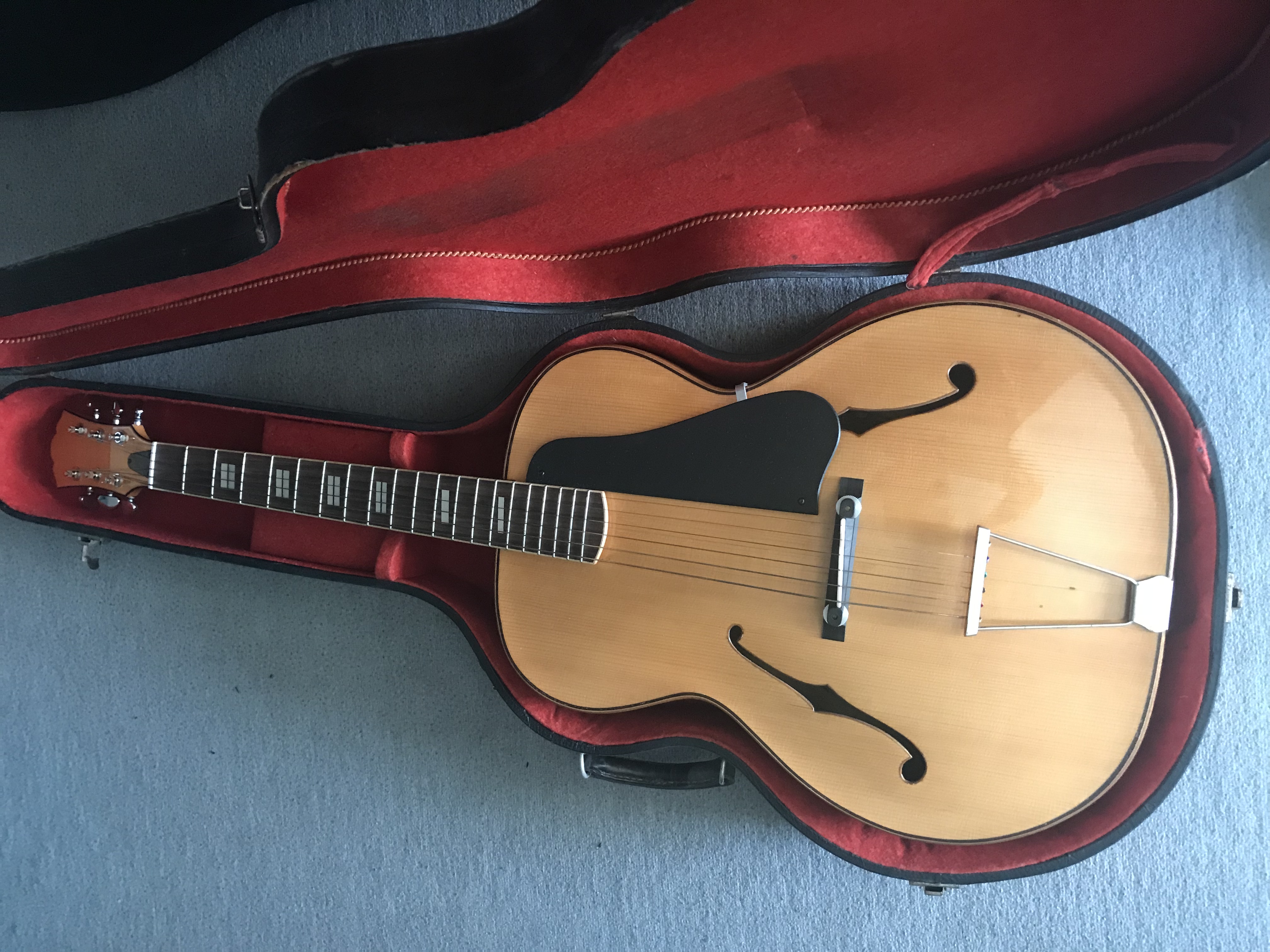 Nejedná se o vzácnou gibsonku. Jde prostě o obyčejnou překližkovou kytaru, které se později elektrifikovaly v Blatné. Ty kytary jsou velmi nepohodlné a nemají (nikdy neměly) žádný zvuk. Pověsit na zeď nebo vyhodit.
