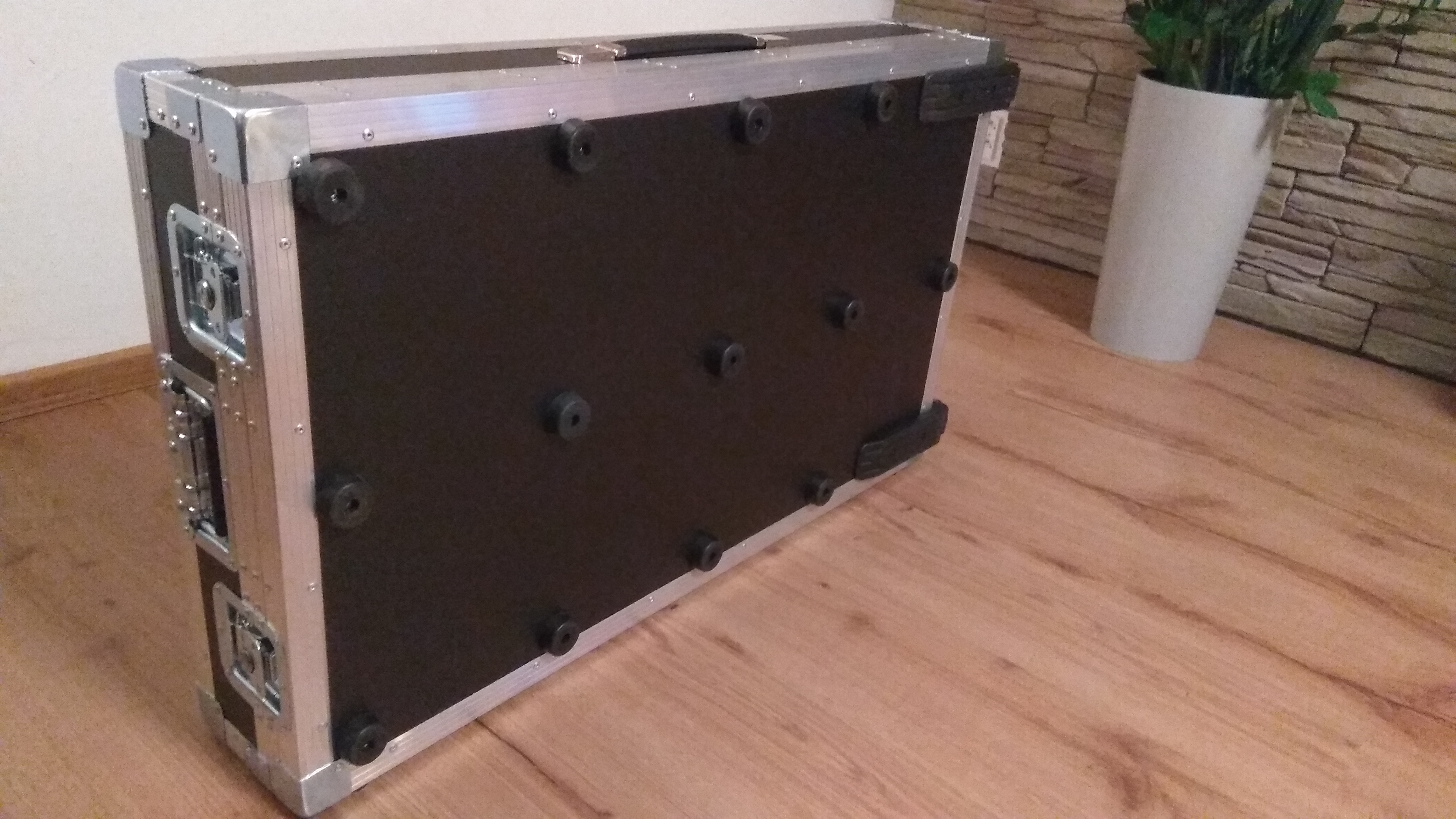 Ale třeba by to plast při těchto rozměrech nezvládl. Hmotnost je nakonec 10,5 kg (s efektama zatím 21kg) při vnitřních rozměrech 90x54cm, což je trochu víc než jsem čekal, ale není to nic strašného, rozhodně lepší než překližka. Nožek na základě přání osadili opravdu hodně, což je super. Dál jsem přidal sklopná madla na boky a kolečka. Tyhle mé výmysly mají samozřejmě taky vliv na hmotnost. Zatím jsem do něj pouze vložil svůj provizorní ikea board, ale časem to přeskládám a první řada pedálů půjde přímo na kufr. Je potažený jemným kobercem, na který se sucháč skvěle chytá. Zatím mám prostorovou rezervu, ale plánuju pedálovou expanzi