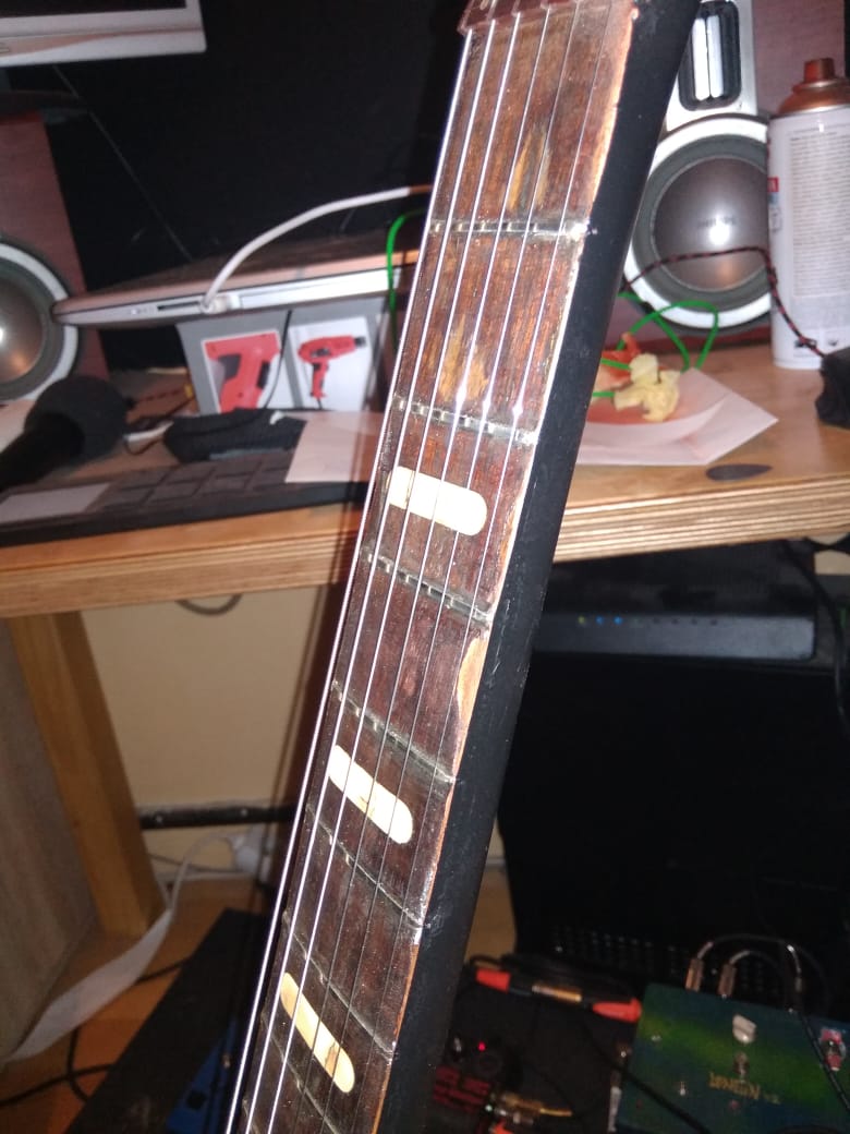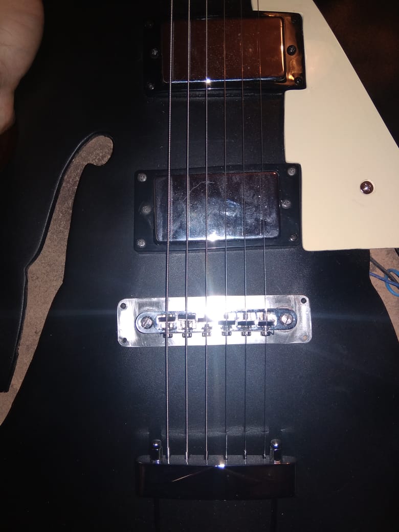 ta kytara byla pomerne v tristnim stavu a treba vzdalenosti snimacu od sebe a bridge sem musel nechat tak jak byli protoze do kytary byli vyhlodany díry presne na to a posunout to neslo, tipuju ze v tom bude problem, bylo by treba posunout bridge o par mm cely zpet, coz nejde.