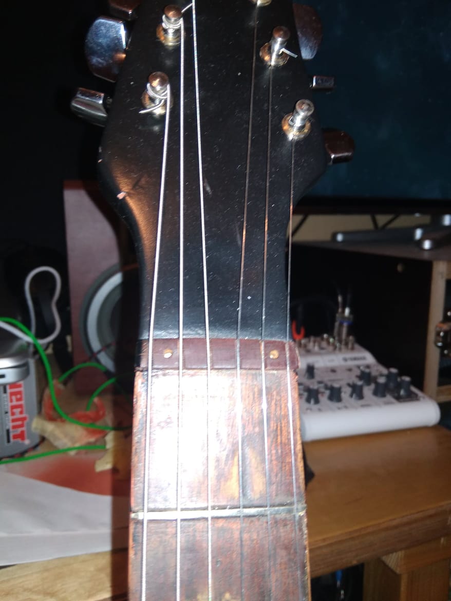 oprava hmatniku, problem je ze ta tenoucka dyha "mahagonu" se krome toho ze je cast uplne urvana i odchlíplá z hmatniku (viz obr. 2), takze E struna naprazdno hraje dobre ale pri zmacknuti na 1,2,3 prazci to chrčí protože ta odchlíplá část je výš než zbytek hmatniku.. otazka je jak to rekonstruovat? sundat celou dýhu a nahradit to novou? dá se vubec neco takovyho jako 1mm tlusta dyha mahagonu koupit? pripadne me napadlo (rozumej videl sem na ytb) to zalepit, sehnat si (opet netusim kde) piliny ze stejne tmavyho dreva a zalit ten prasek superglueckem a nasledne vybrousit..
