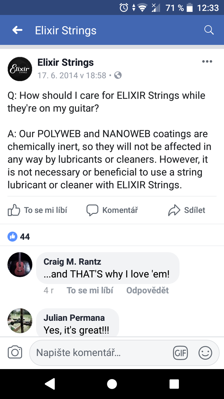 Dobře borci díky za info. Frajer mi v hudebninách řekl, že struny měnit min. každý měsíc. Takže jsem překvapen, že mi nic neřekl o elixírech, které vydrží déle než ostatní. :-O