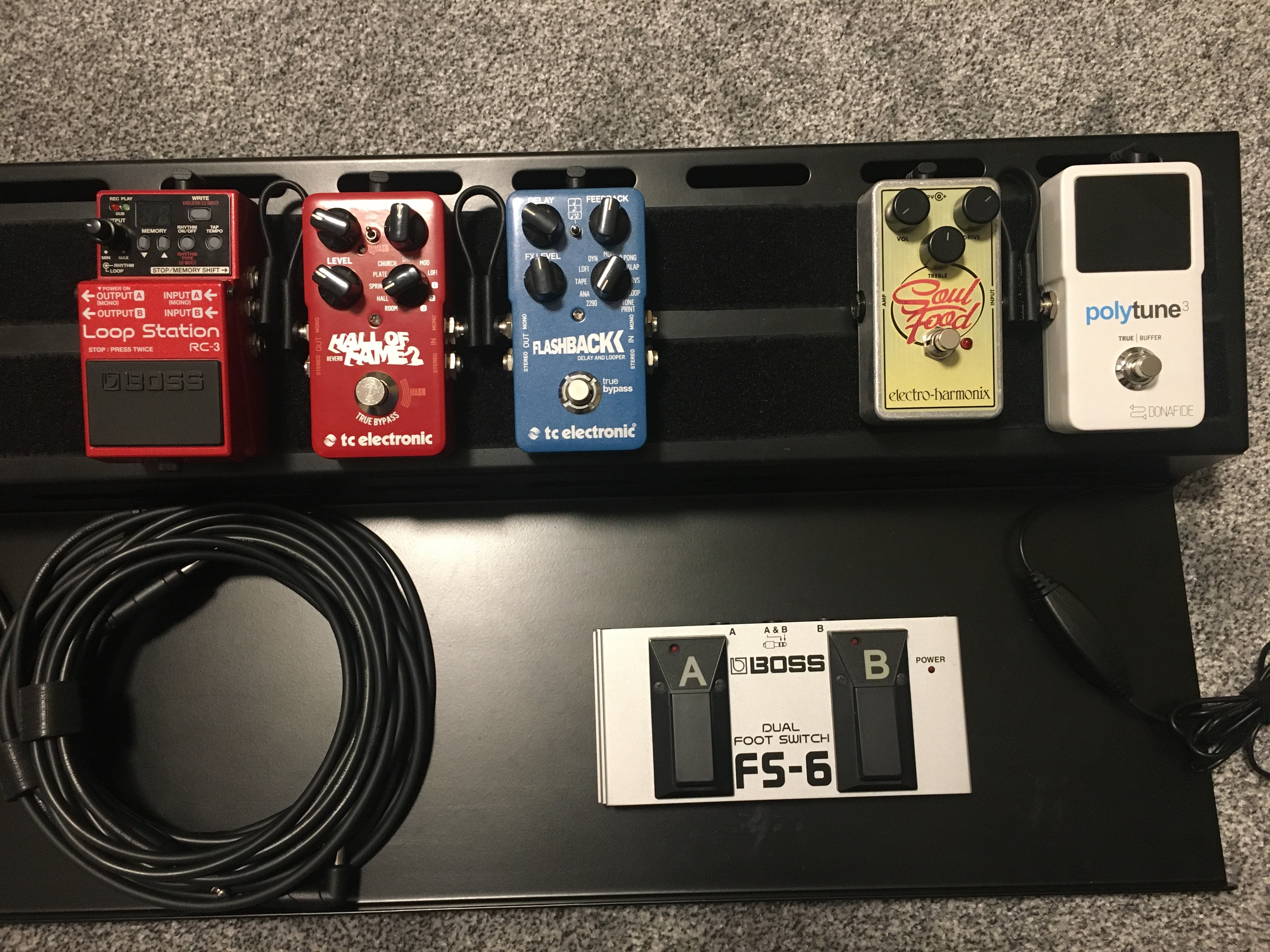 Momentálně efekty napájím přes adaptér Boss PSA 230S připojený na daisy chain. Největší problém dělá looper Boss na konci smyčky - vydává brum/šum, což bude taky nejspíše tím, že není true bypass (vyřeší se toto galvanicky odděleným zdrojem?).