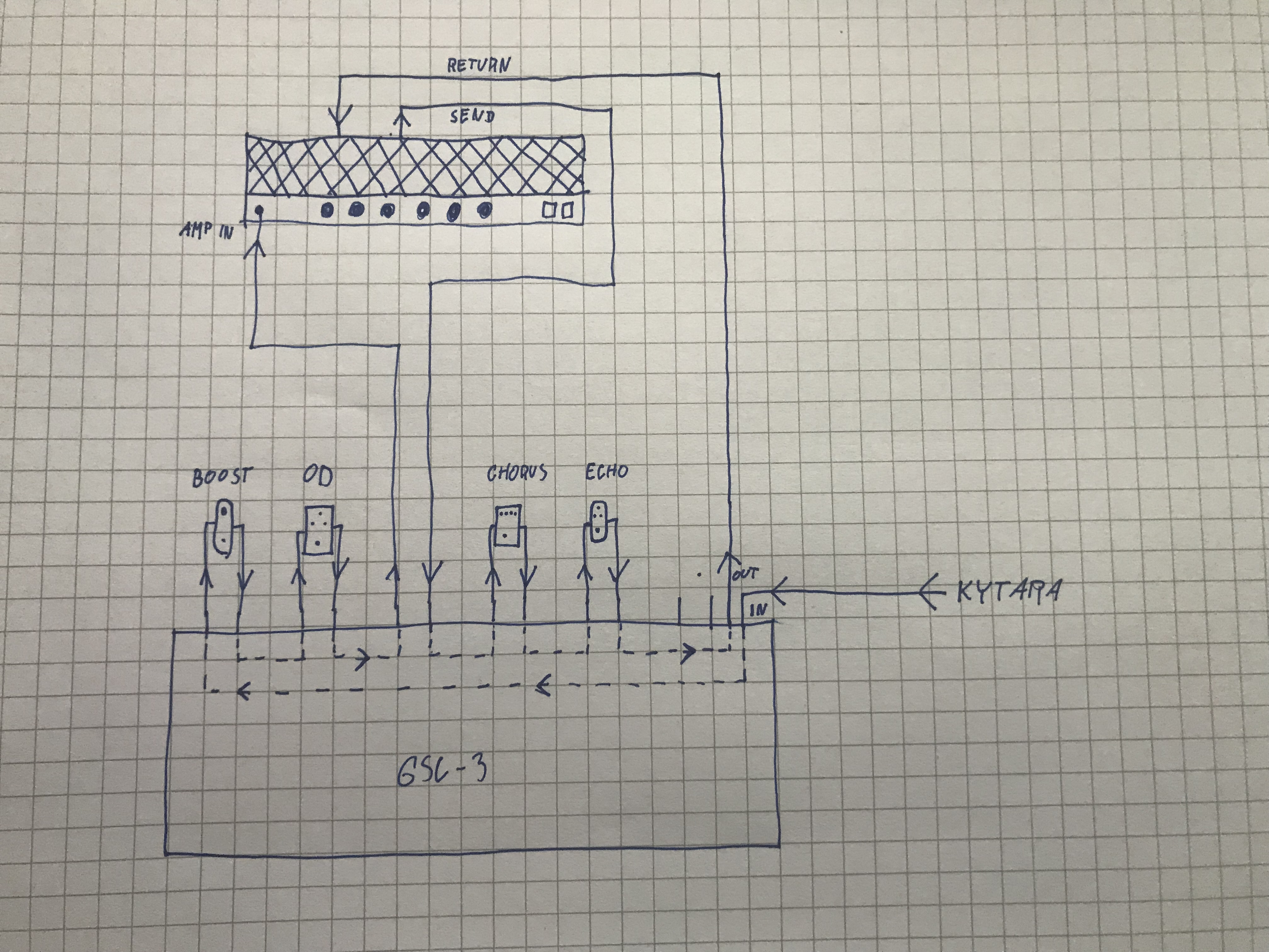 Elektrofonická kytara --> Koaxiální kabel č.1 --> Pedálová deska --> Koaxiální kabel č.2 --> Elektronkový zesilovač --> Reproduktorová skříň
