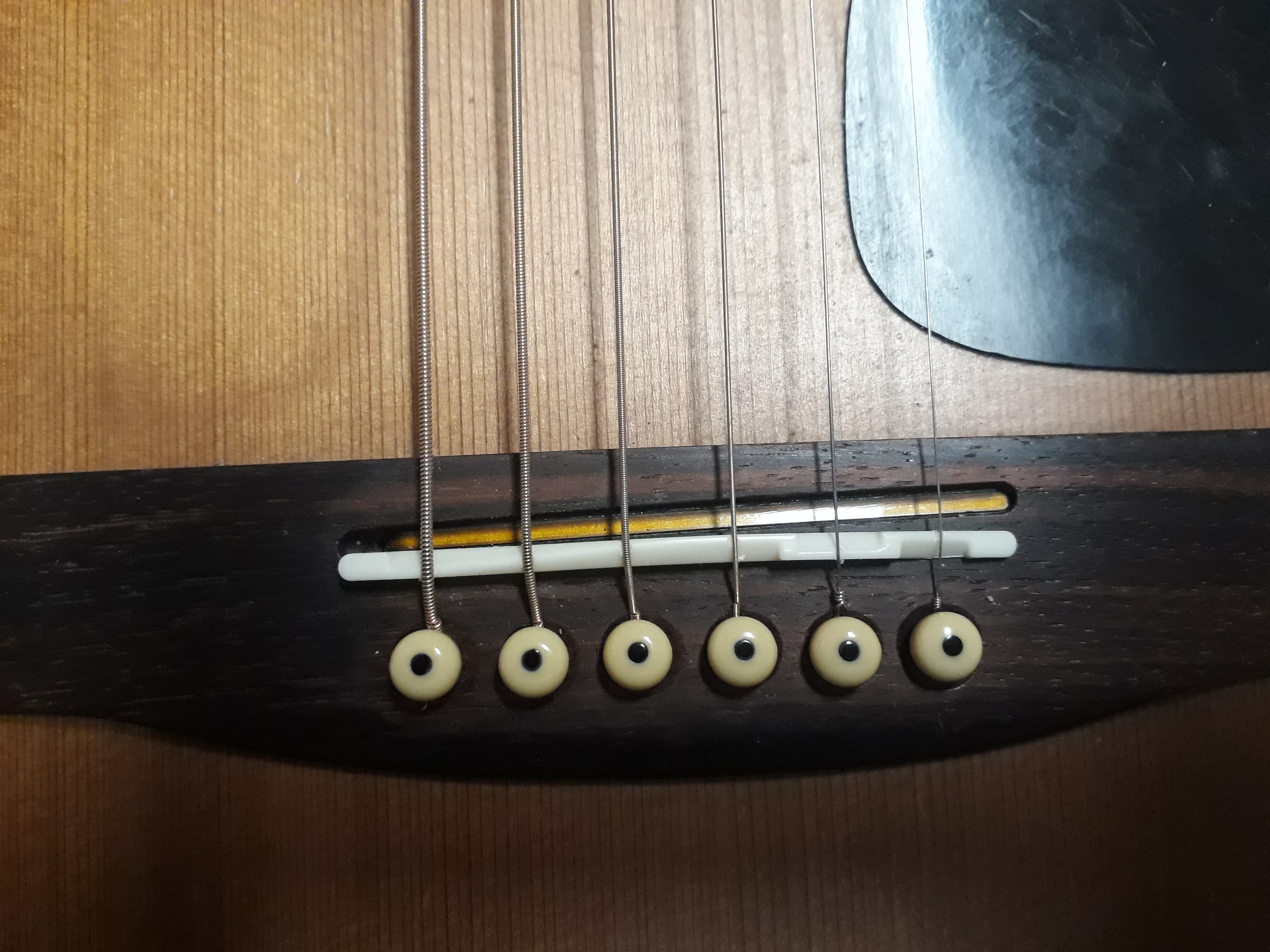 Ahoj všem zájemcům o problematiku. Děkuji pbla4024 za nápad. Dorazily mi plátky a udělal jsem nejhorší čuňárnu jako pokus: jeden z plátků jsem uřízl pokud možno rovně a na kobylku ho prostě přiložil, přidržoval a doufal, že ho struny přimáčknou víc, než ho budou poklápět. Povedlo se, vizte obrázek.