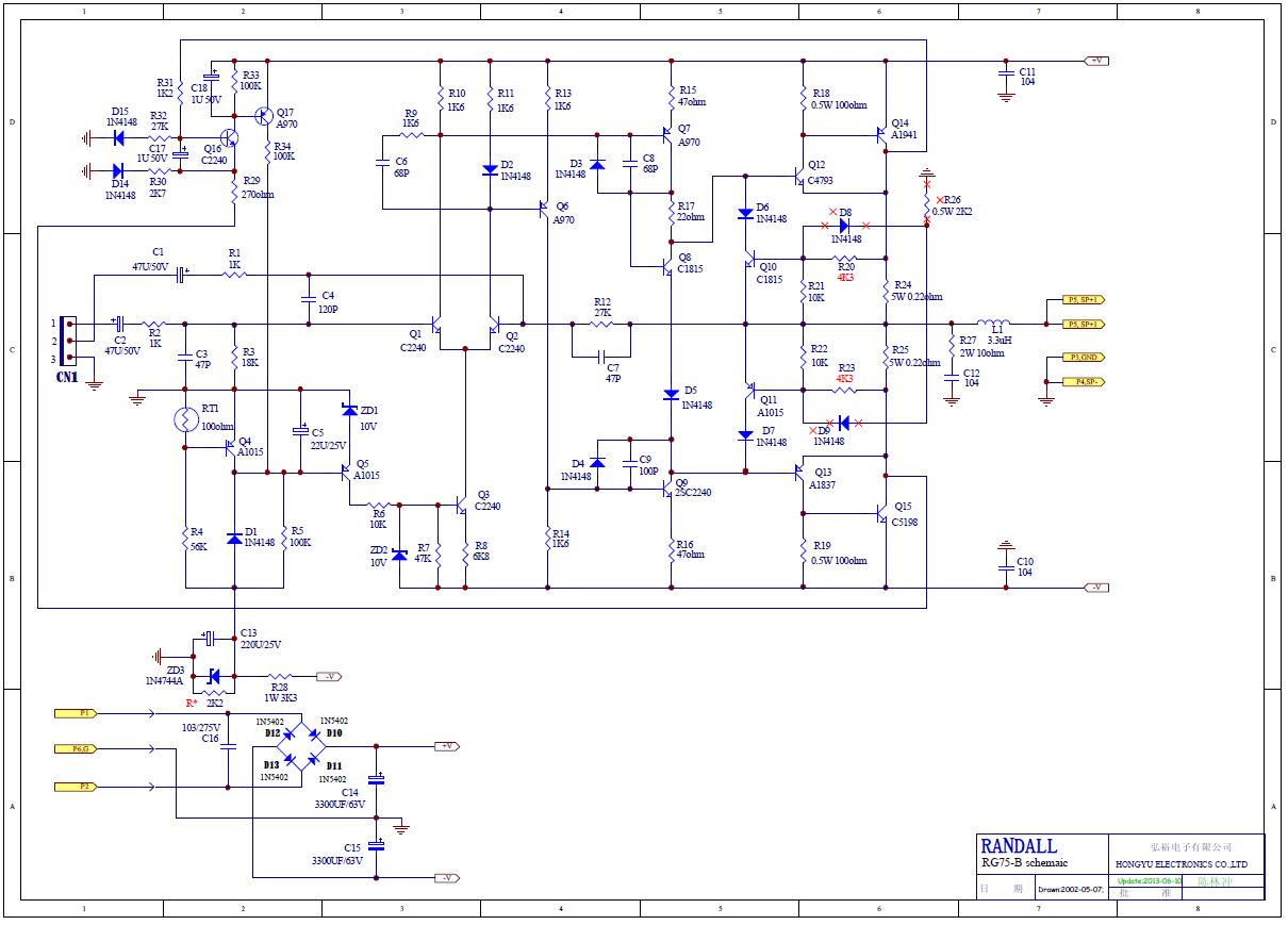 Závada by se také dala typovat v obvodech zpožděného spouštění signálu při zapnutí nebo v "hlídačích" obou větví napájecího napětí. Tedy v obvodech tranzistorů Q4,Q5, Q16,Q17. V zapojení je vidět, že je to pokusně "došmouleno" návrháři tak, aby to fungovalo.