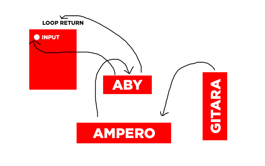 OUT z ampera do inputu ABY pedala (nie do toho loop pedala co som spominal, mam aj ABY aj LOOP pedal)