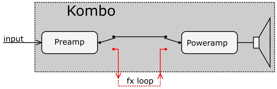 Základní vlastnost FX smyčky je ta, že když strčíš JACK to returnu (nebo většinou i sendu) tak se odpojí vnitřní propojení mezi preampem a koncákem (černá linka) a přepne se na smyčku (červená linka) a pokud nejsou send a return komba fyzicky propojený (kabelem, po cestě bývá zařazen jeden či více efektů), tak kombo nehraje, protože singál, který je posílám na SEND už nedoteče na RETURN.