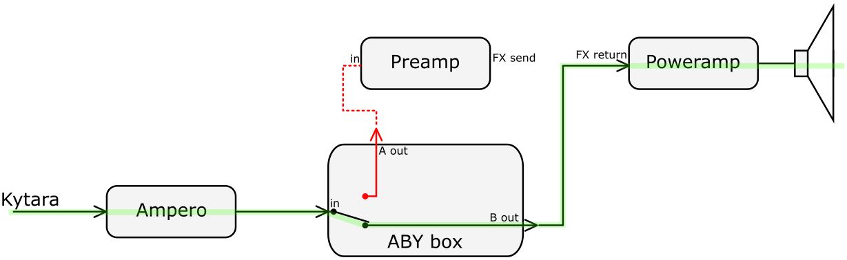 Teď jak jsi to myslel ty s tím ABY boxem: zeleně jsem naznačil tok signálu. Jak vidno,v tomto případě by vše fungovalo a signál z AMPERA jde rovnou do returnu komba a vše hraje jak má. Ale stačí přepnout ABY box: A doufám, že teď už je jasné proč by to nehrálo - signál by skončil na výstupu preampu (=sendu FX smyčky komba)