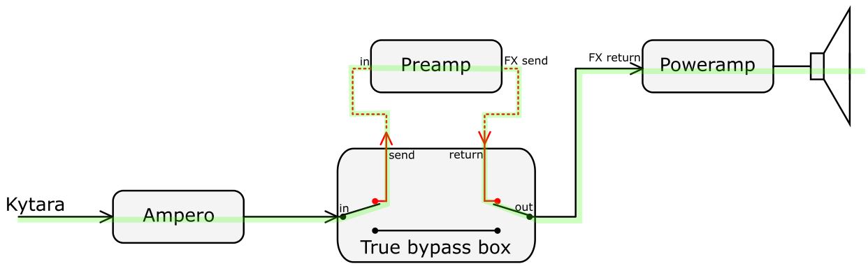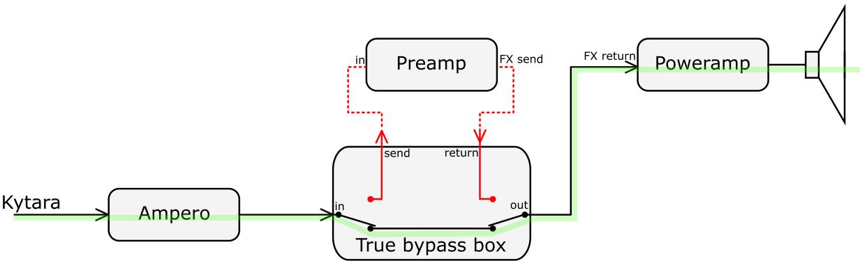 když loop sepneš, signál projde z ampera do preampu a vrátí se zpět do truebypass boxu, aby mohl pokračovat dál do returnu (=koncáku):