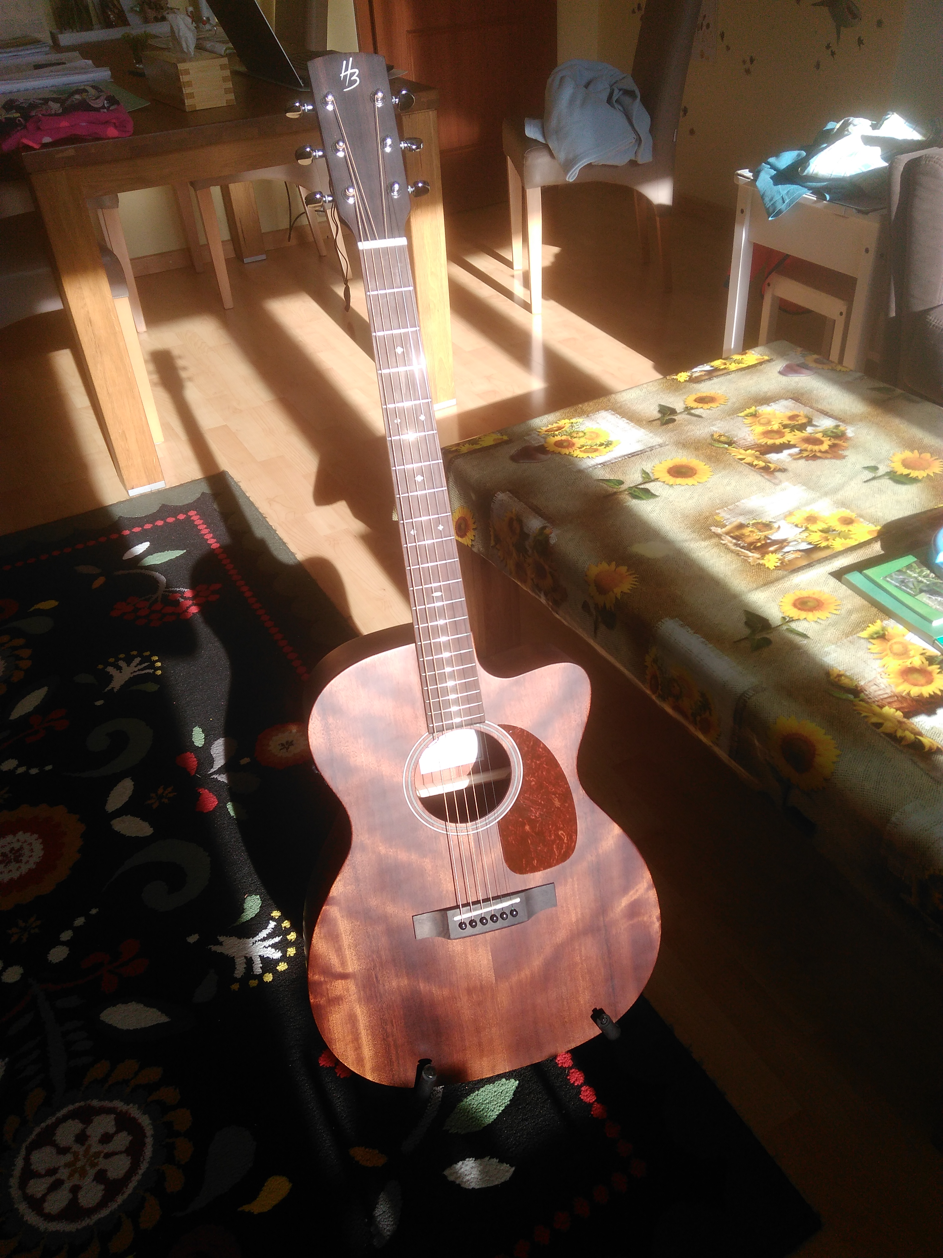 Jinak první dojem z kytary bylo možná trošku zklamání, zvuk je přece jen středovější a s novými strunami byl trochu "harsh". A já taky trochu odvykl hraní na akustiku, takže mi přišla trochu tvrdá. Ale vyhráváme se, ona i já. Nicméně dohmat by šel možná trochu snížit, zkusím si pohrát s výztuhou (ptám se na to v jiném tématu).