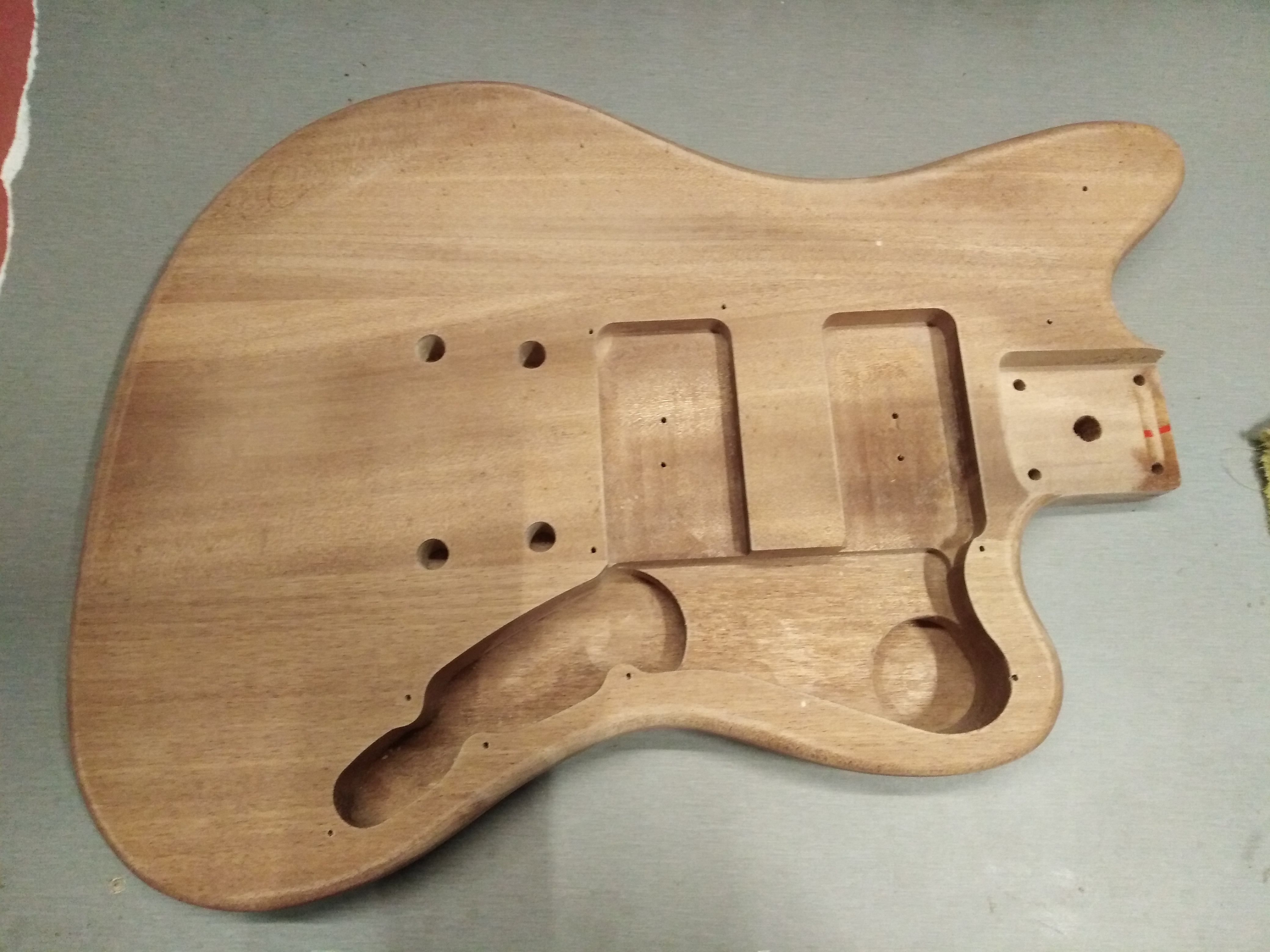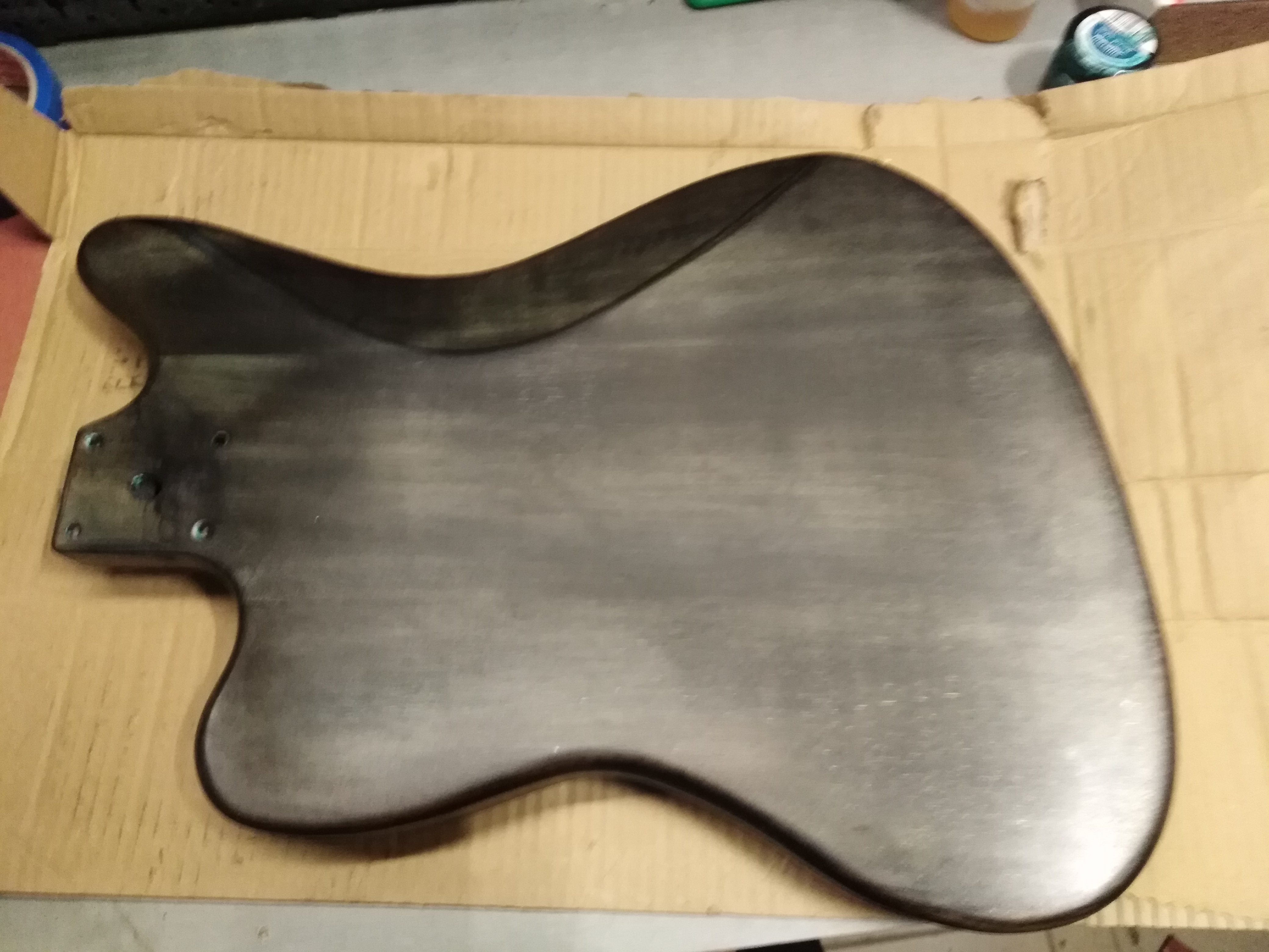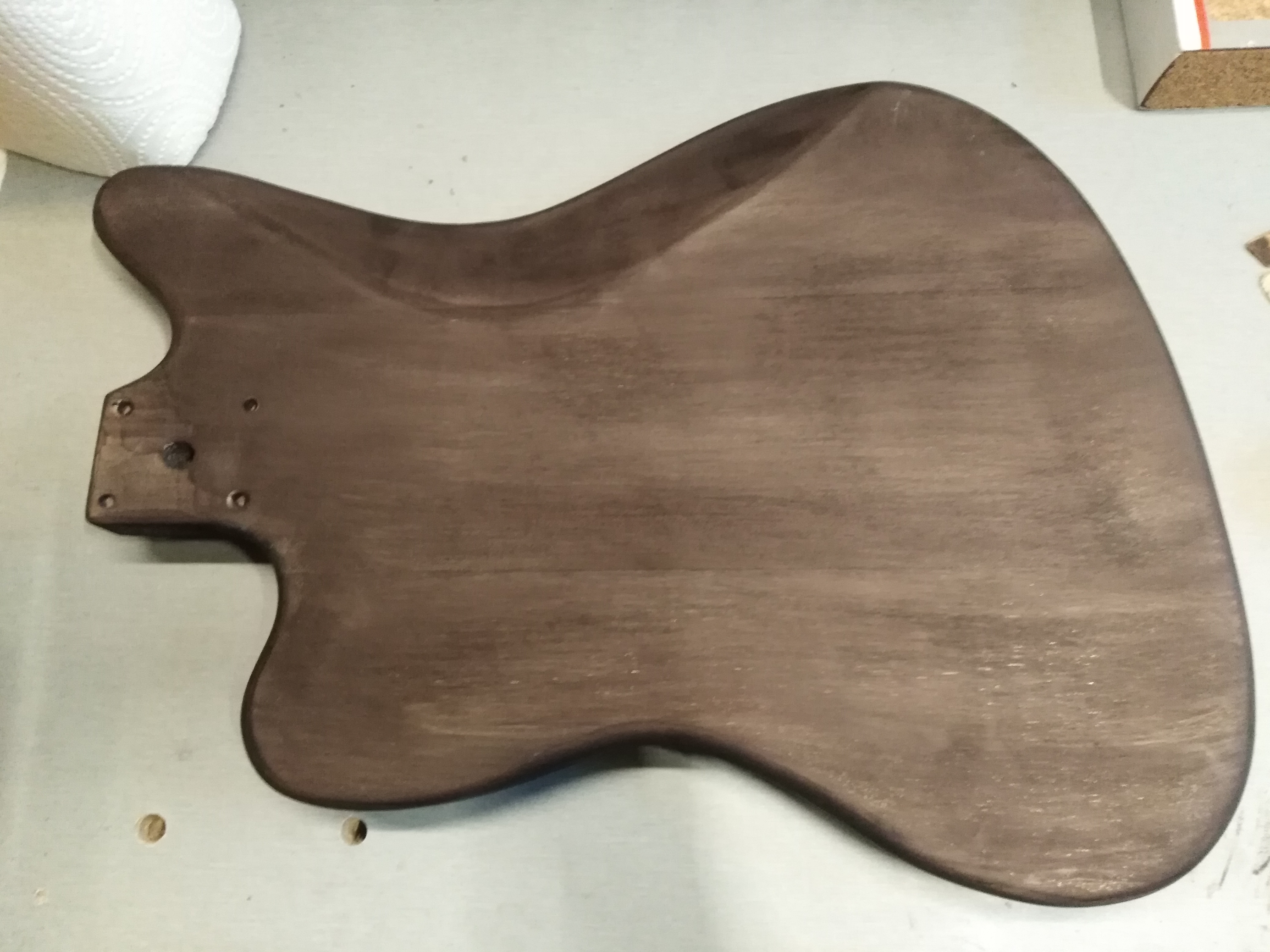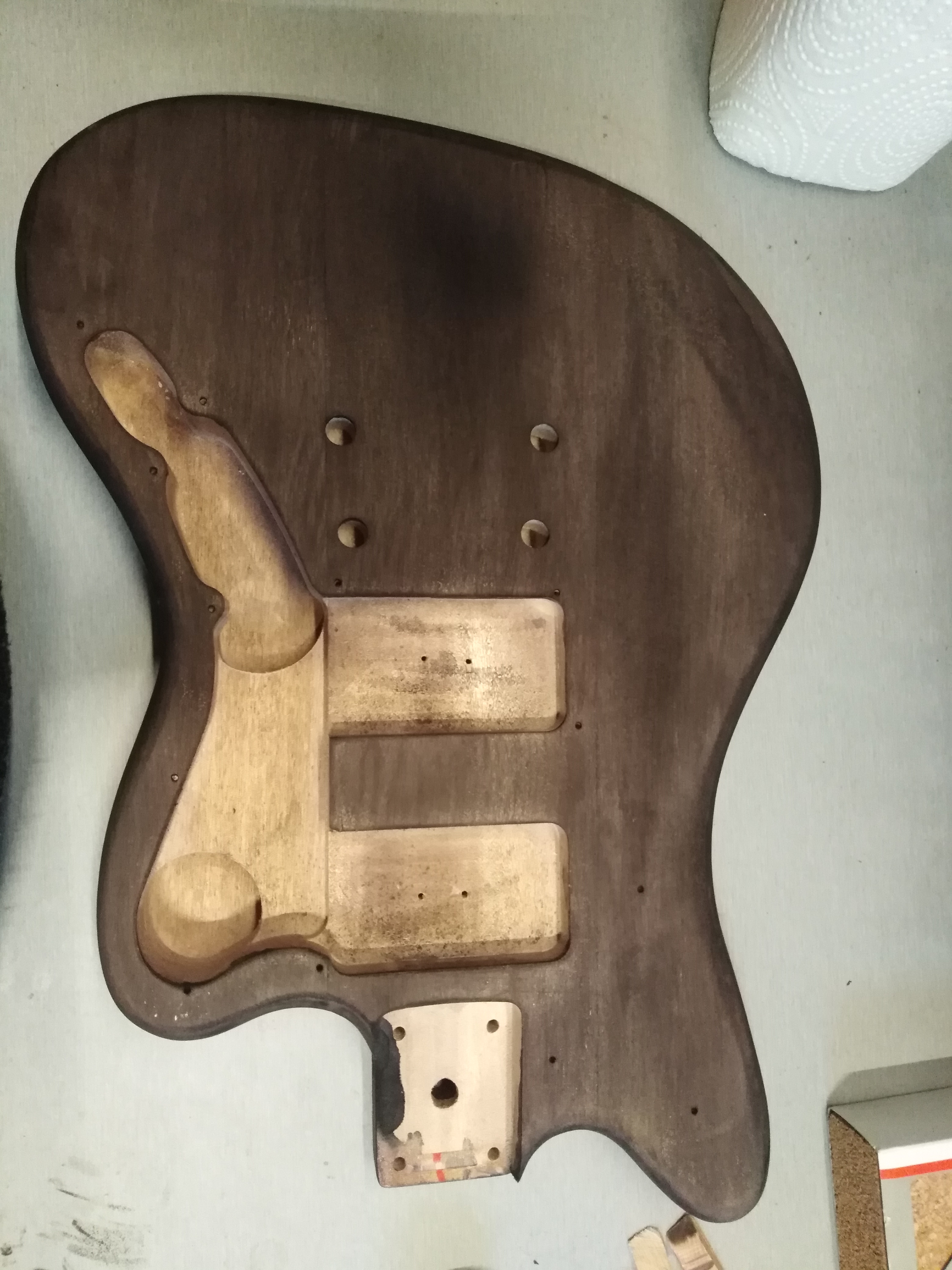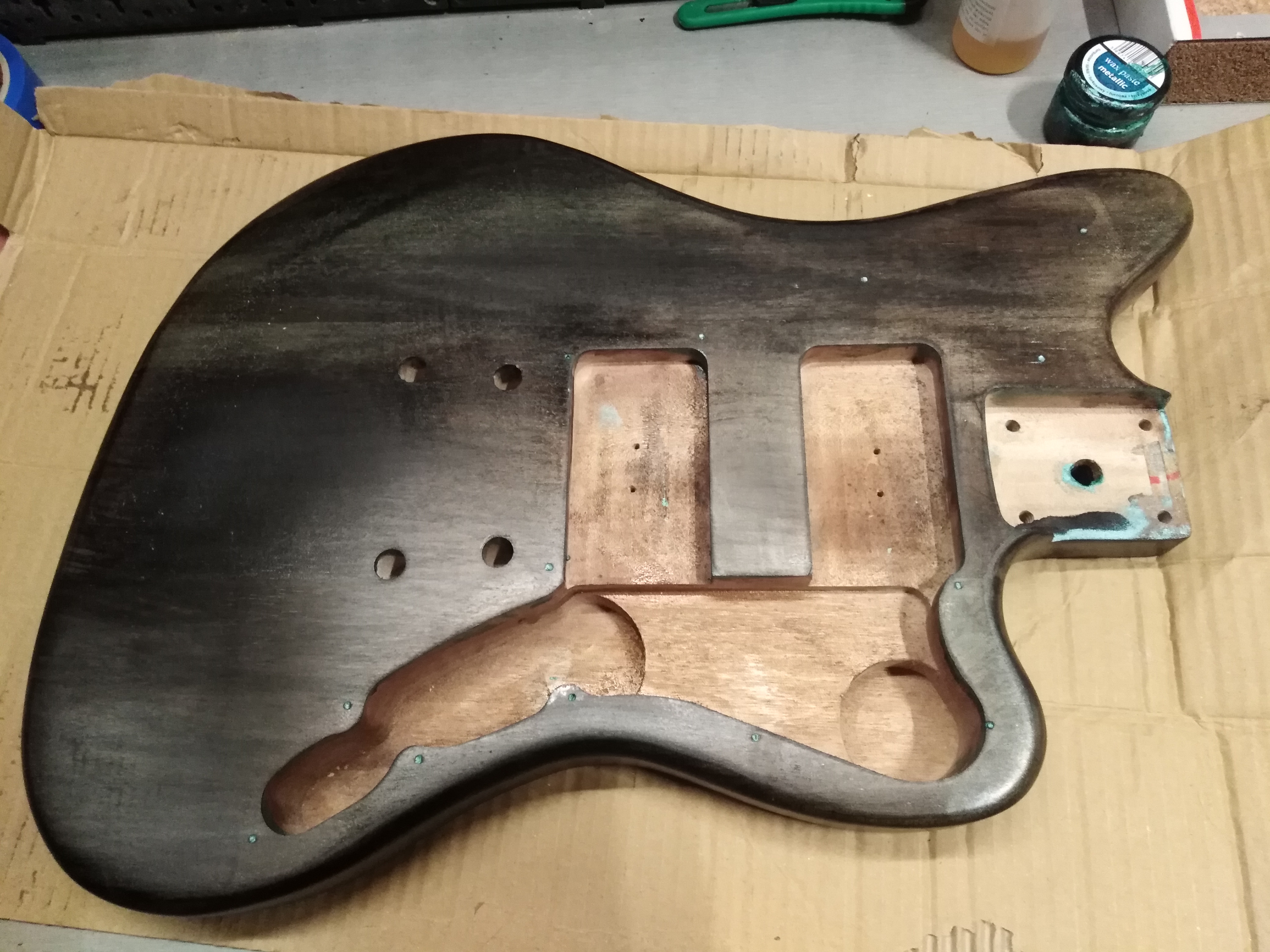 Tělo i krk s hlavou byly od výroby napuštěné plničem, takže se brousilo, nahrubo, sem tam schválně probrousit víc, udělat škrabanec. Níže uvidíte proč. Přebroušené tělo jsem 4x napustil lihovým mořidlem, odstín eben. Do namořené kytary jsem vetřel vrstvu tyrkysového metalického vosku. Po vymití tungovým olejem se ztratilo místy hnědé mořidlo a ve světlých místech a škrabancích vosk zůstal, takže tělo i hlava chytila barevný nádech. S pórovitým dřevem by to šlo lépe, ale ta probroušená místa a škrabance zafungovaly taky hezky. Poté jsem dal asi 6 vrstev vytvrzovacího oleje z manahuny, ta tyrkysová krásně zvýrazněla, celá kytara ztmavla. Hodil jsem na ní pickguard co prišel s kitem. Měl jsem koupený černý, ale ten červený se mi nějak zalíbil víc. Takže kytara hotová se vším všudy za necelé 3000 a pár hodin práce. Vzniklo z toho něco krásně nedokonalého, co může být v nejhezčích i nejošklivějších kytarách. Záleží na úhlu pohledu