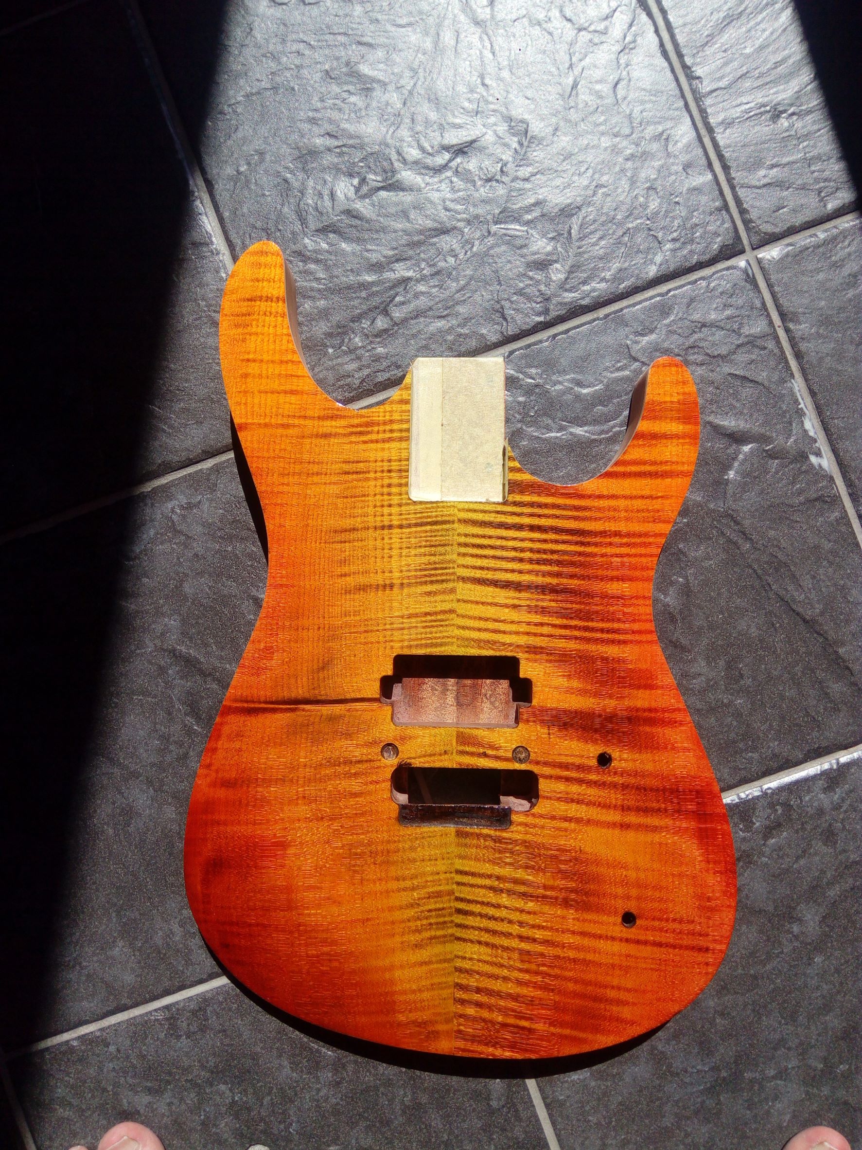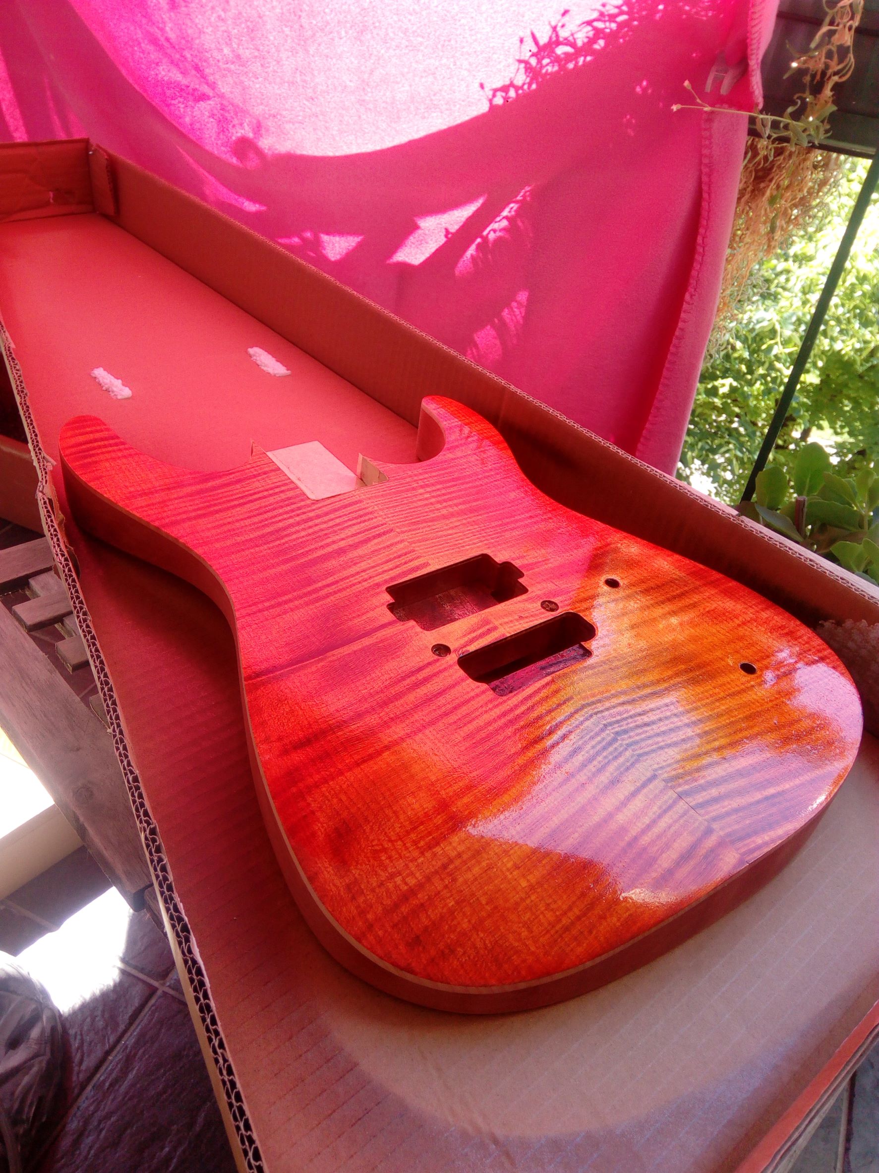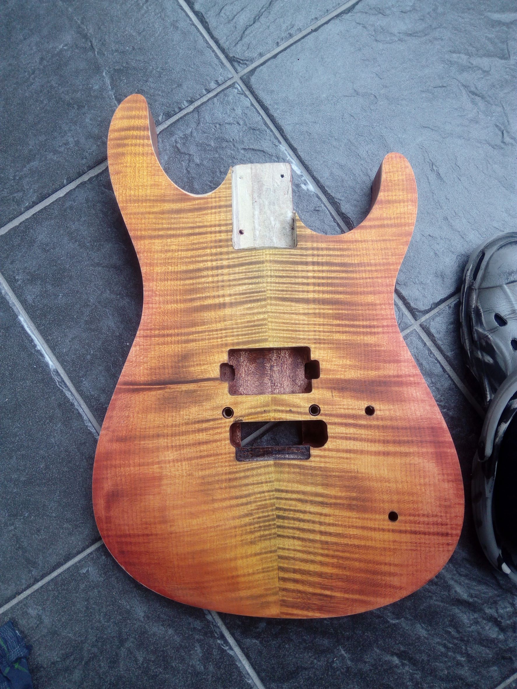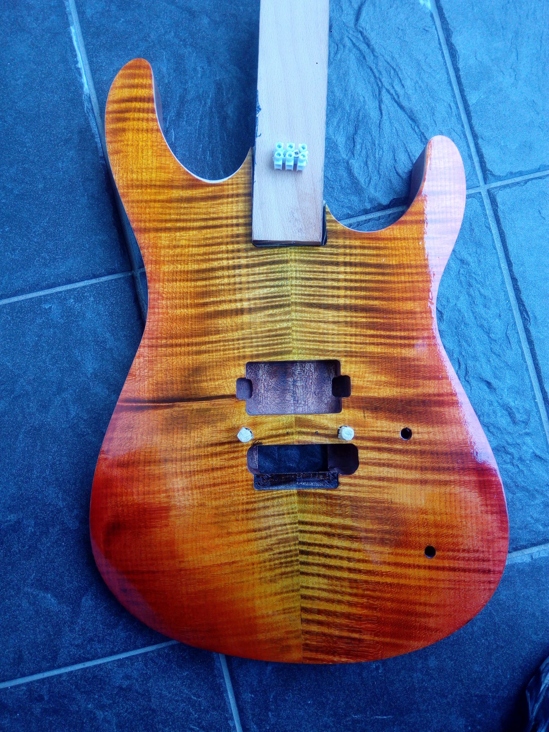 kde som místo lipového tela dal vyrobit Afro Mahagón, vrchná deska flame maple. Krk, Floyd je z Harleyky. Povrchovku som chcel čierno - bordovú, niečo takéto No, začal som morit čiernou a brúsit, aby zostali pruhy, potom som začal morit červenou a následne žltou a oranžovou a vzniklo toto