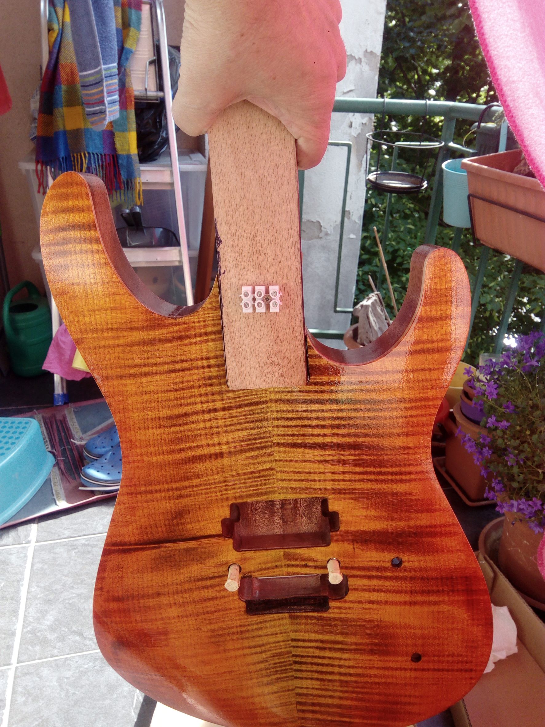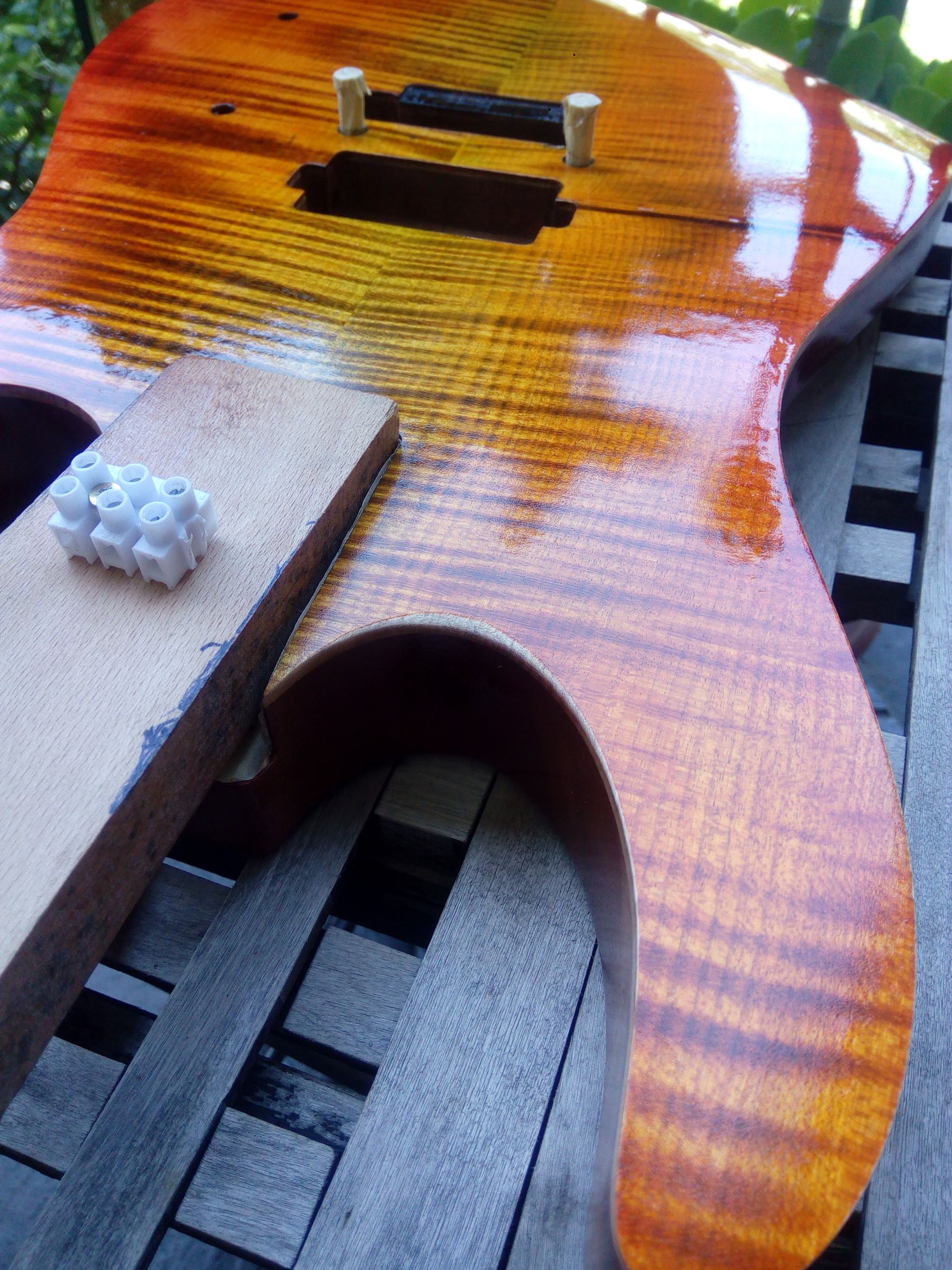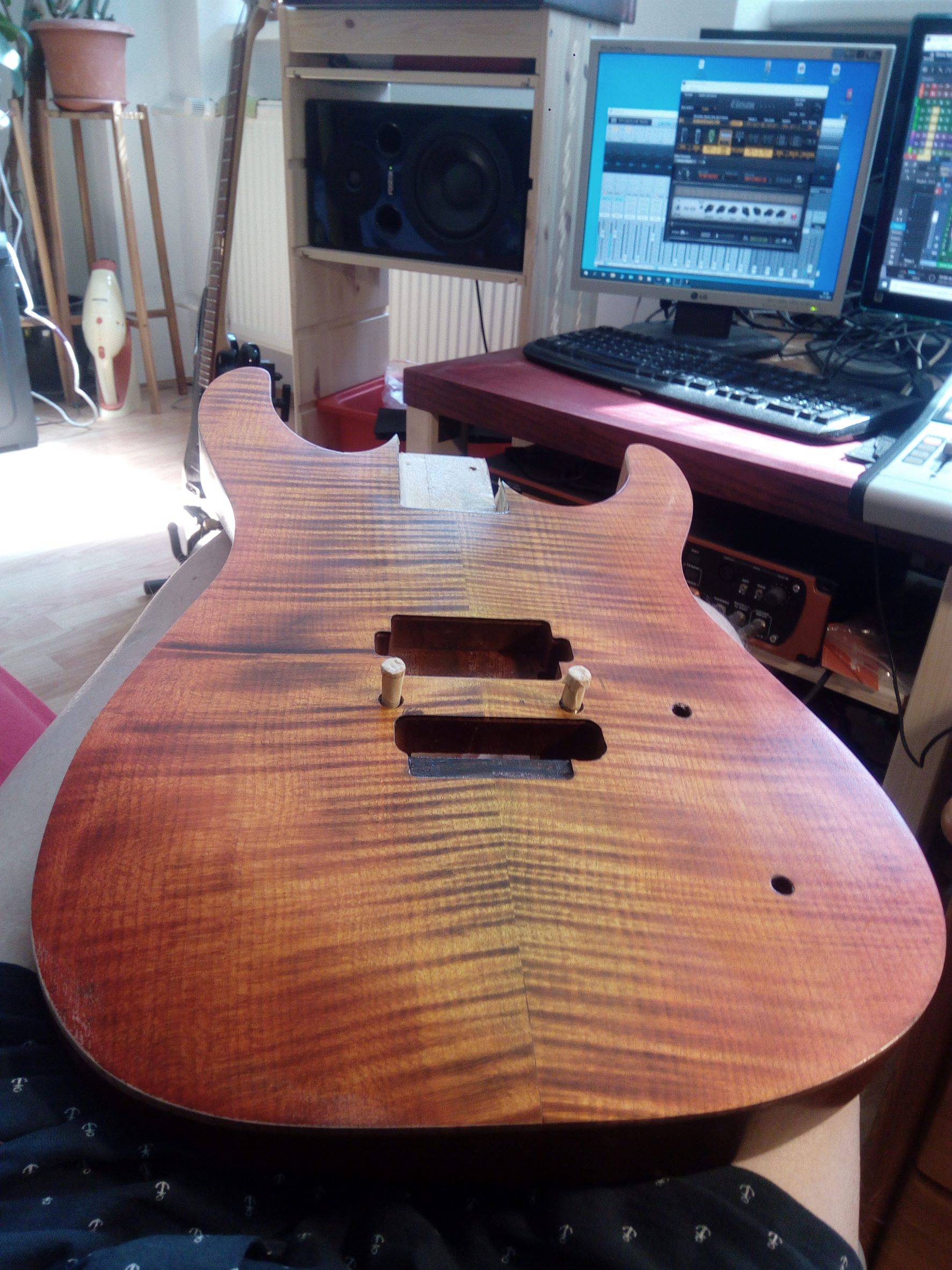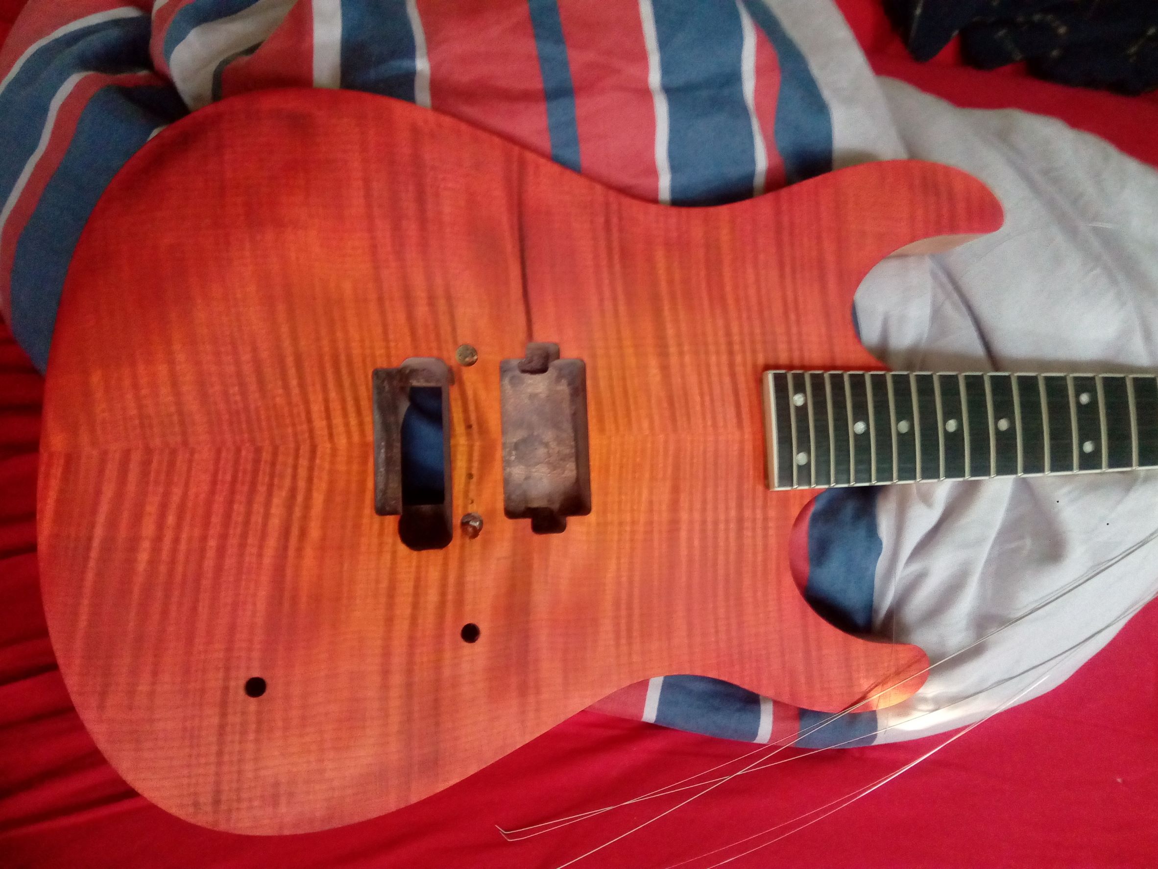 kde som místo lipového tela dal vyrobit Afro Mahagón, vrchná deska flame maple. Krk, Floyd je z Harleyky. Povrchovku som chcel čierno - bordovú, niečo takéto No, začal som morit čiernou a brúsit, aby zostali pruhy, potom som začal morit červenou a následne žltou a oranžovou a vzniklo toto