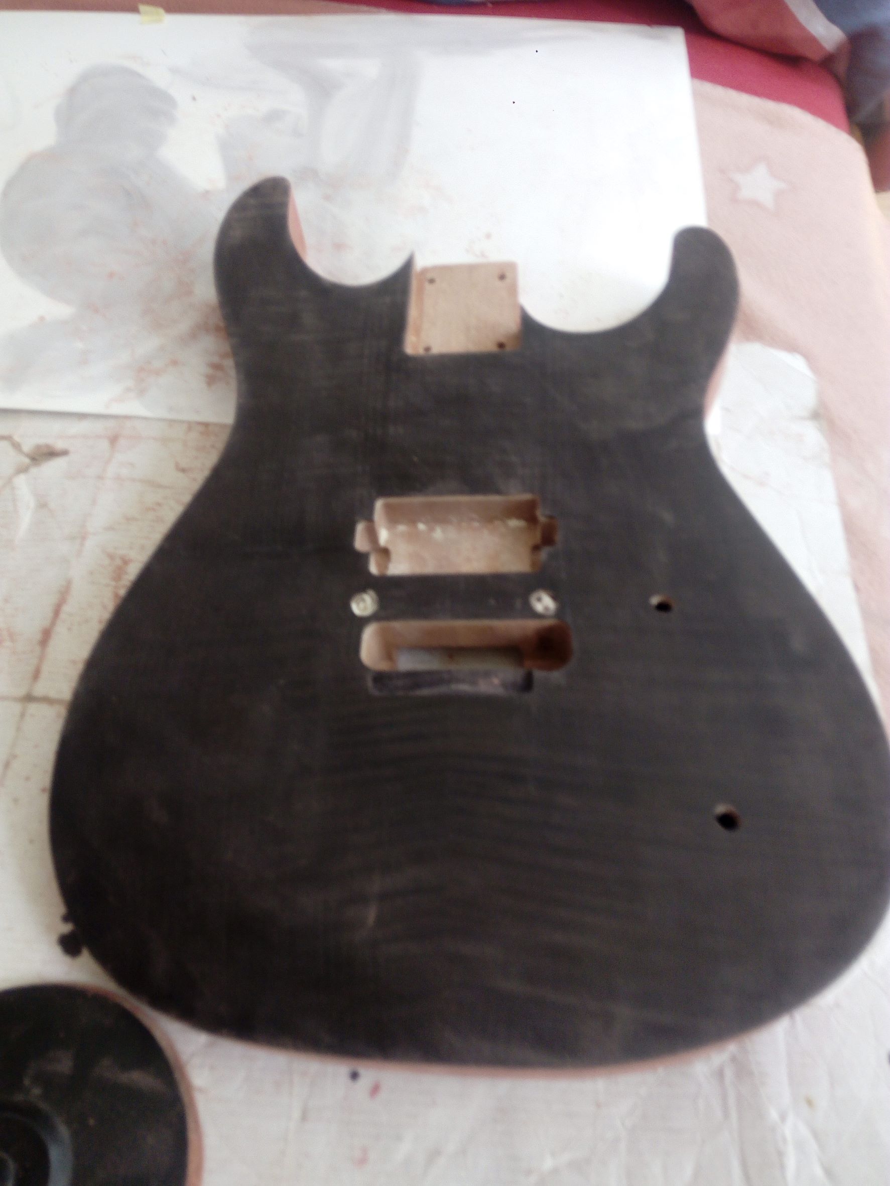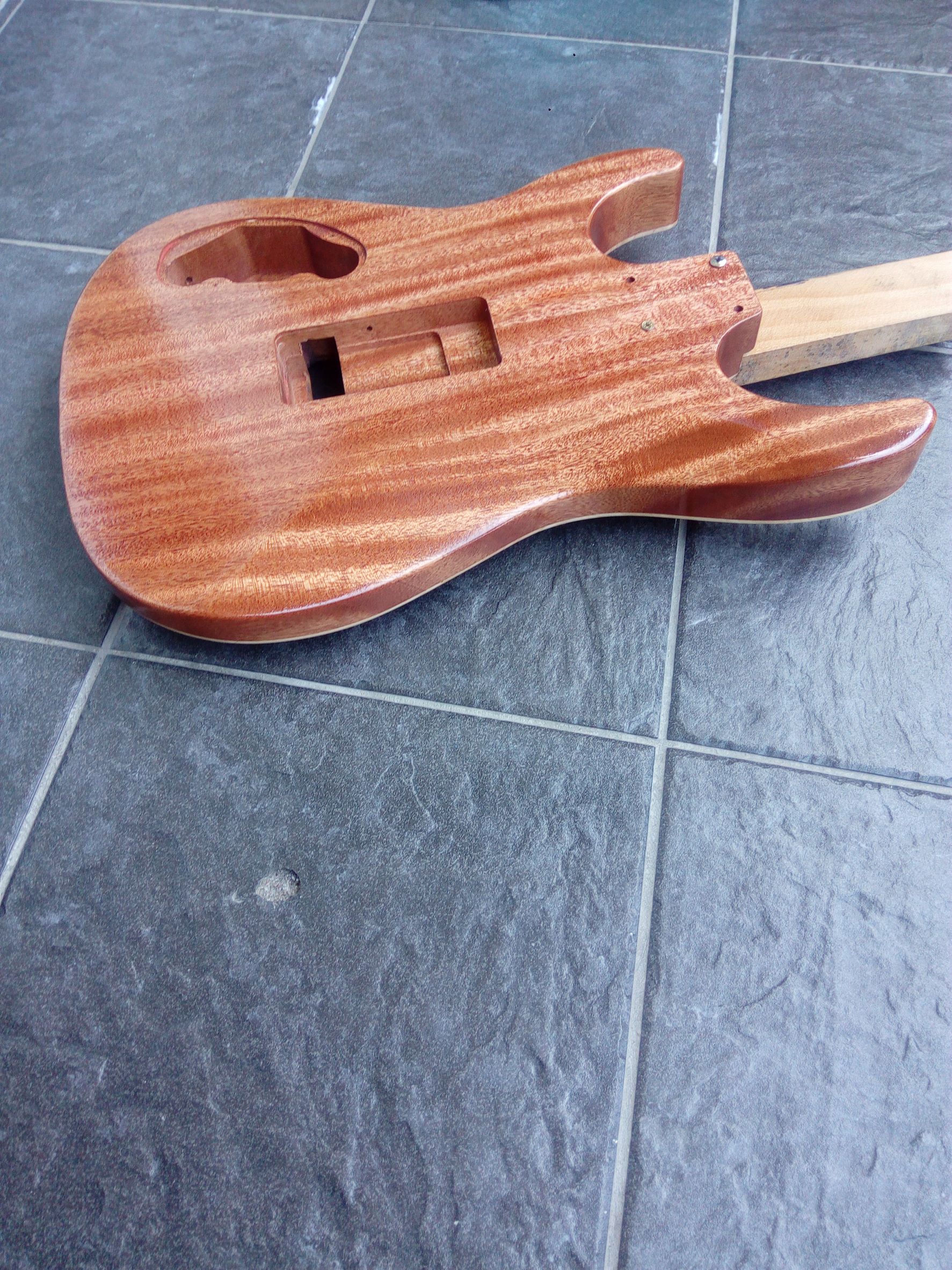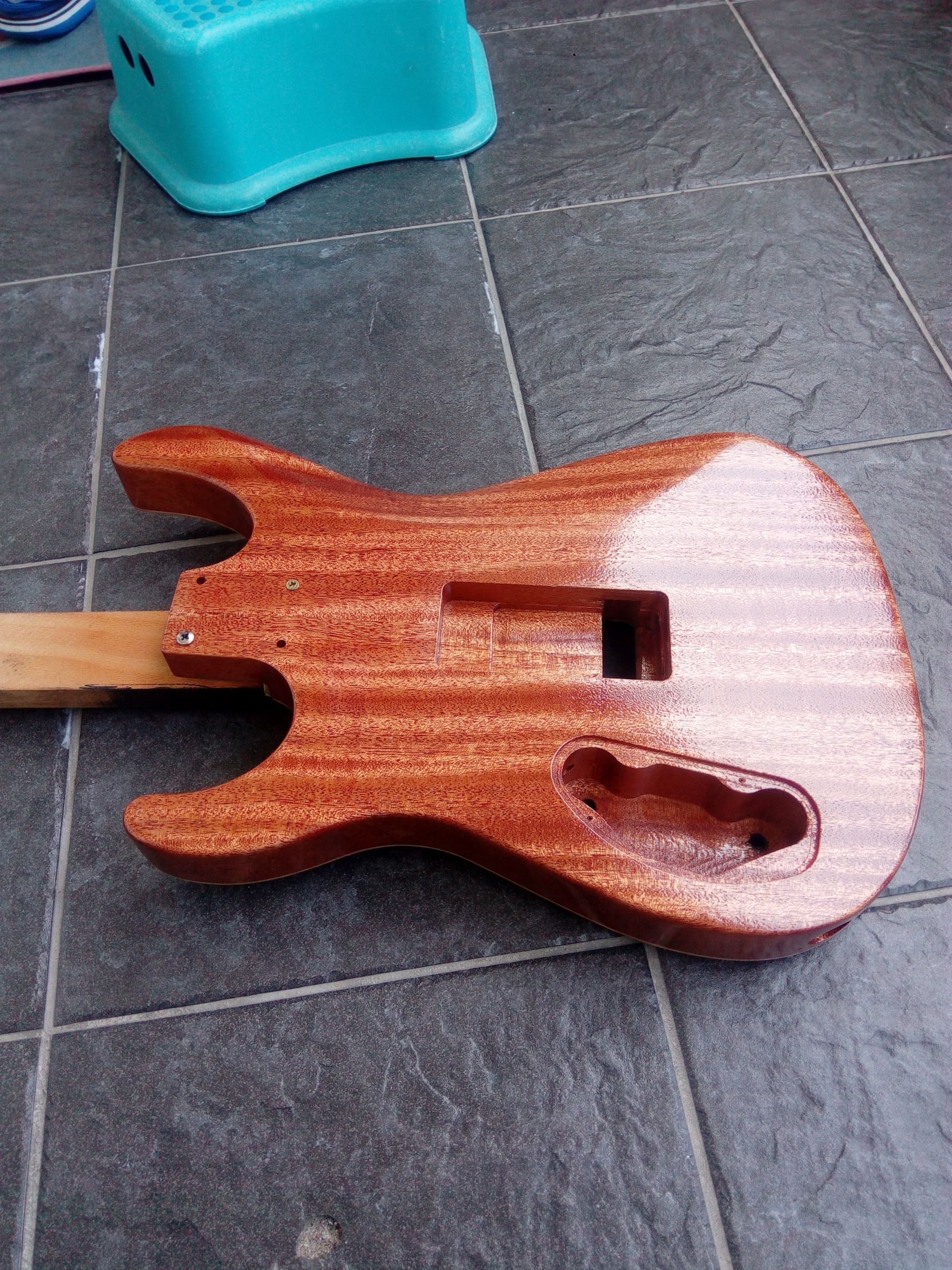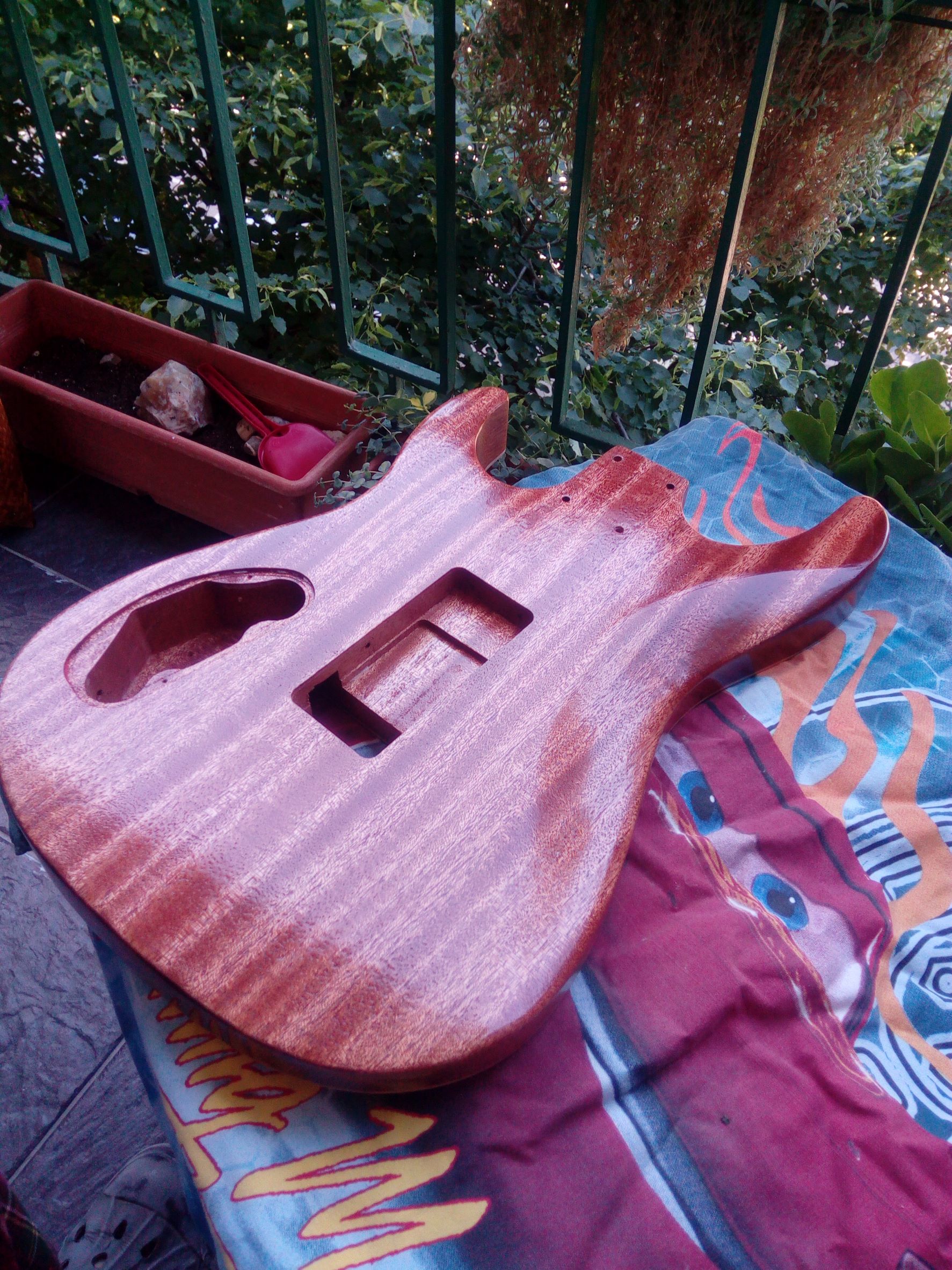 Dnes ráno som gitku trocha prebrúsil, tú lakovanú stranu a zadnú stranu a boky. Očistil a celú strekol.