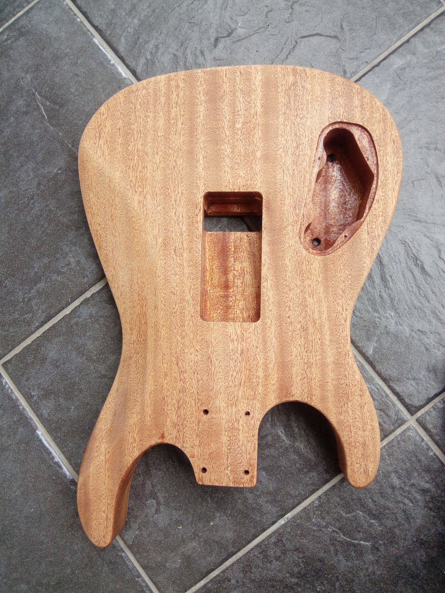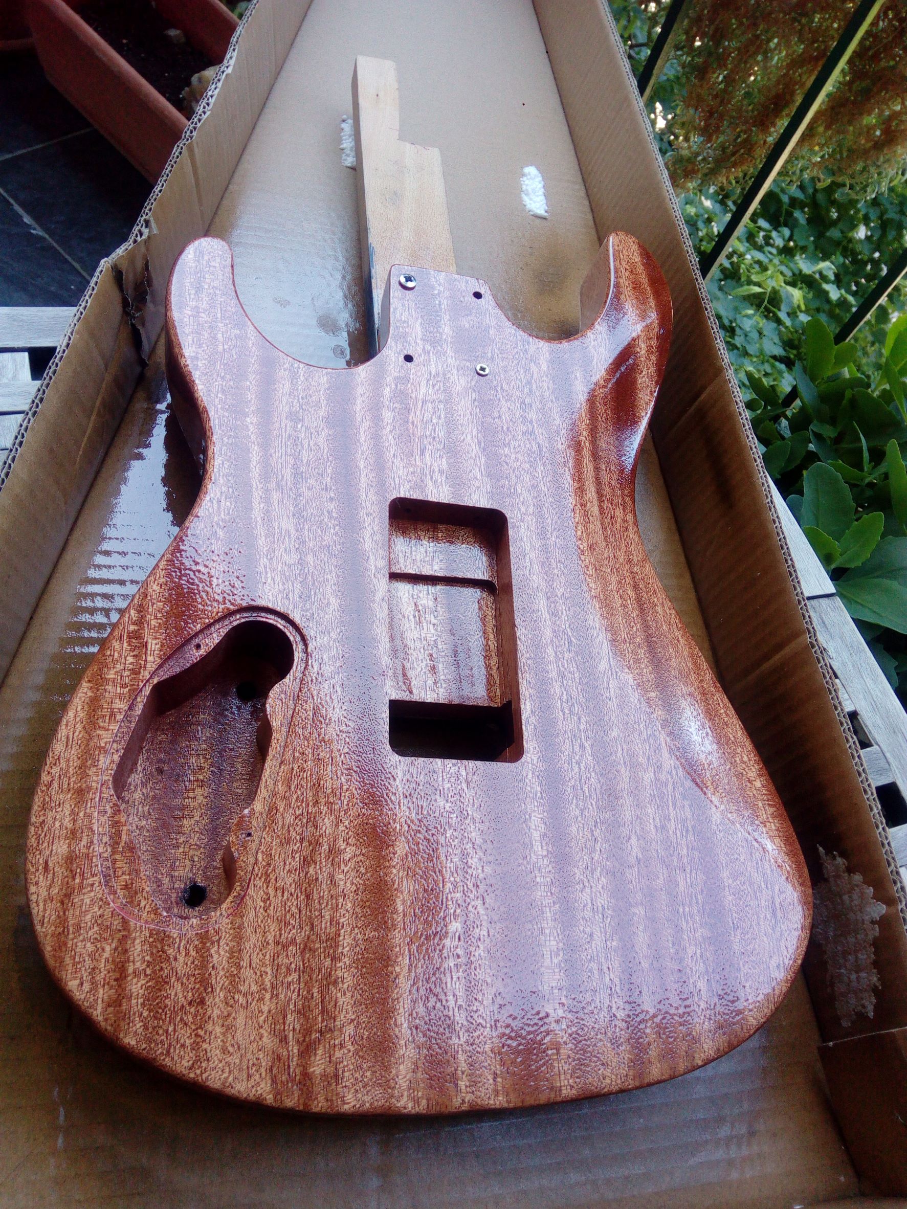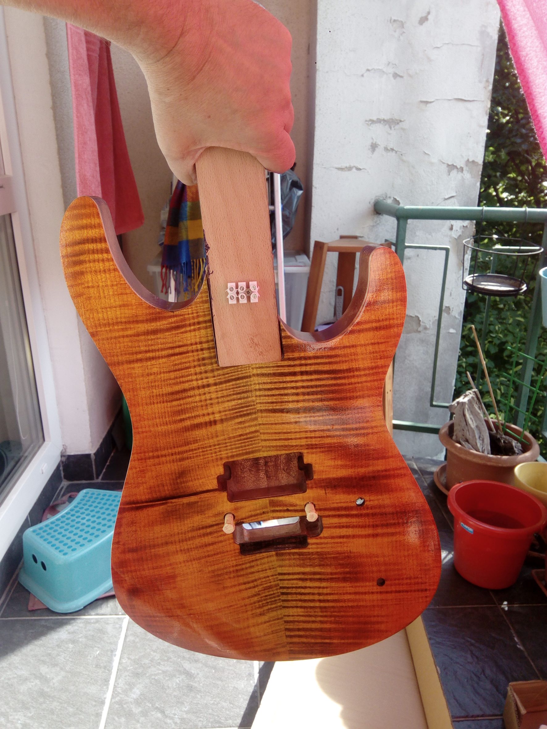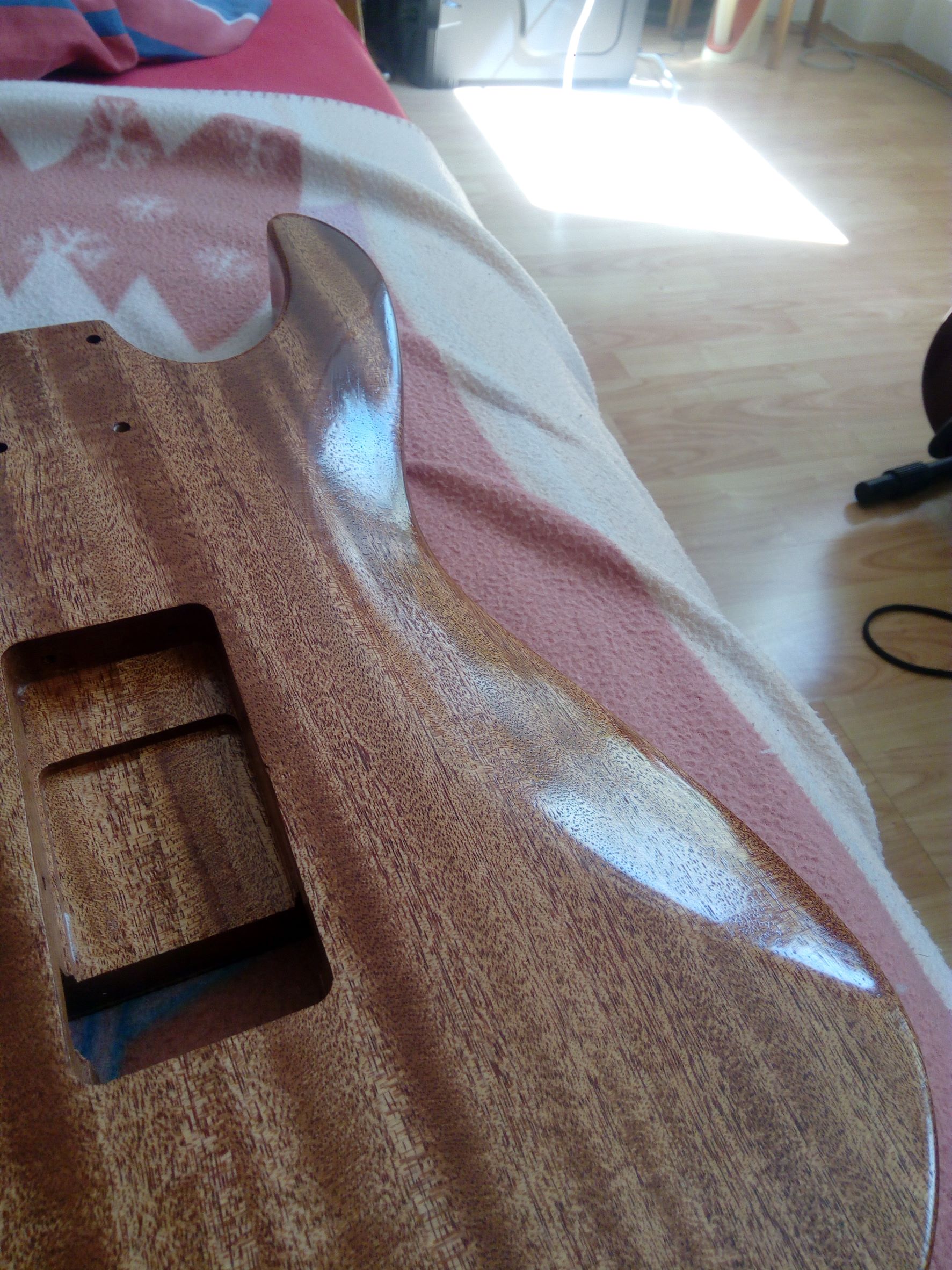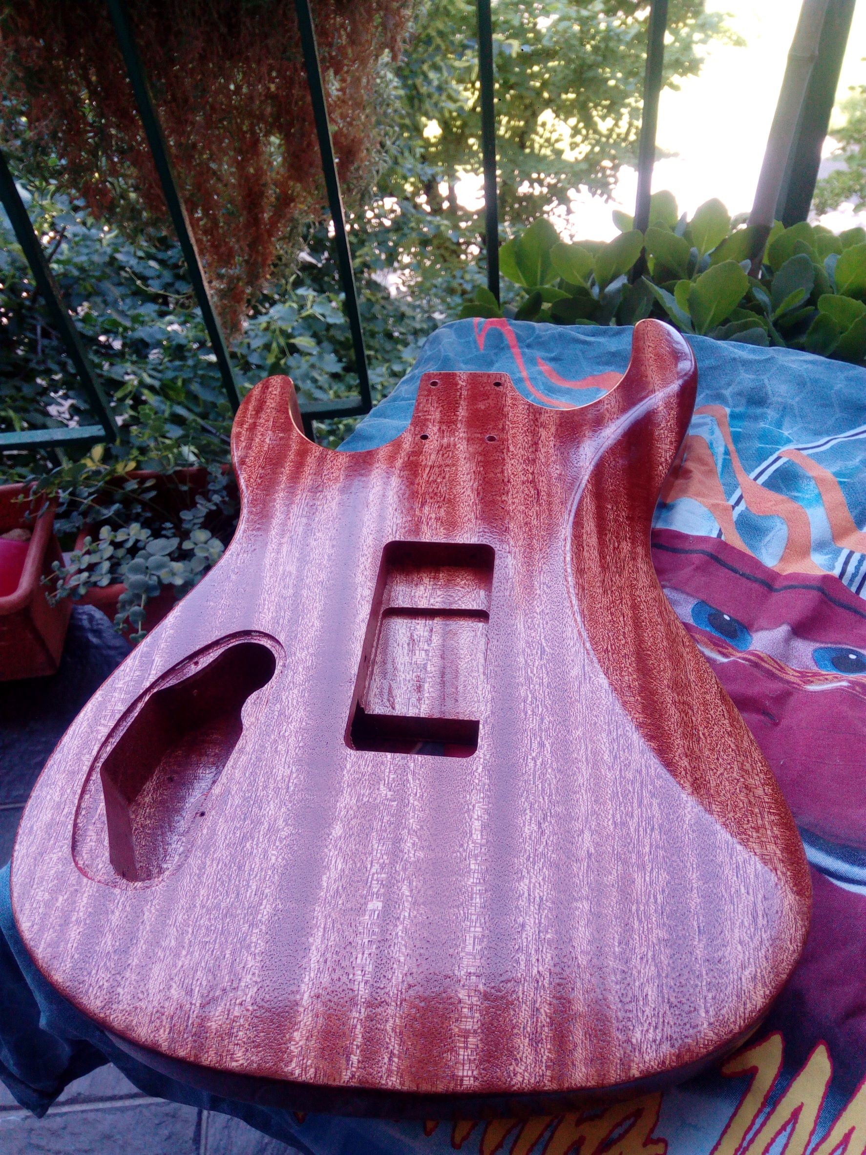 Dnes ráno som gitku trocha prebrúsil, tú lakovanú stranu a zadnú stranu a boky. Očistil a celú strekol.