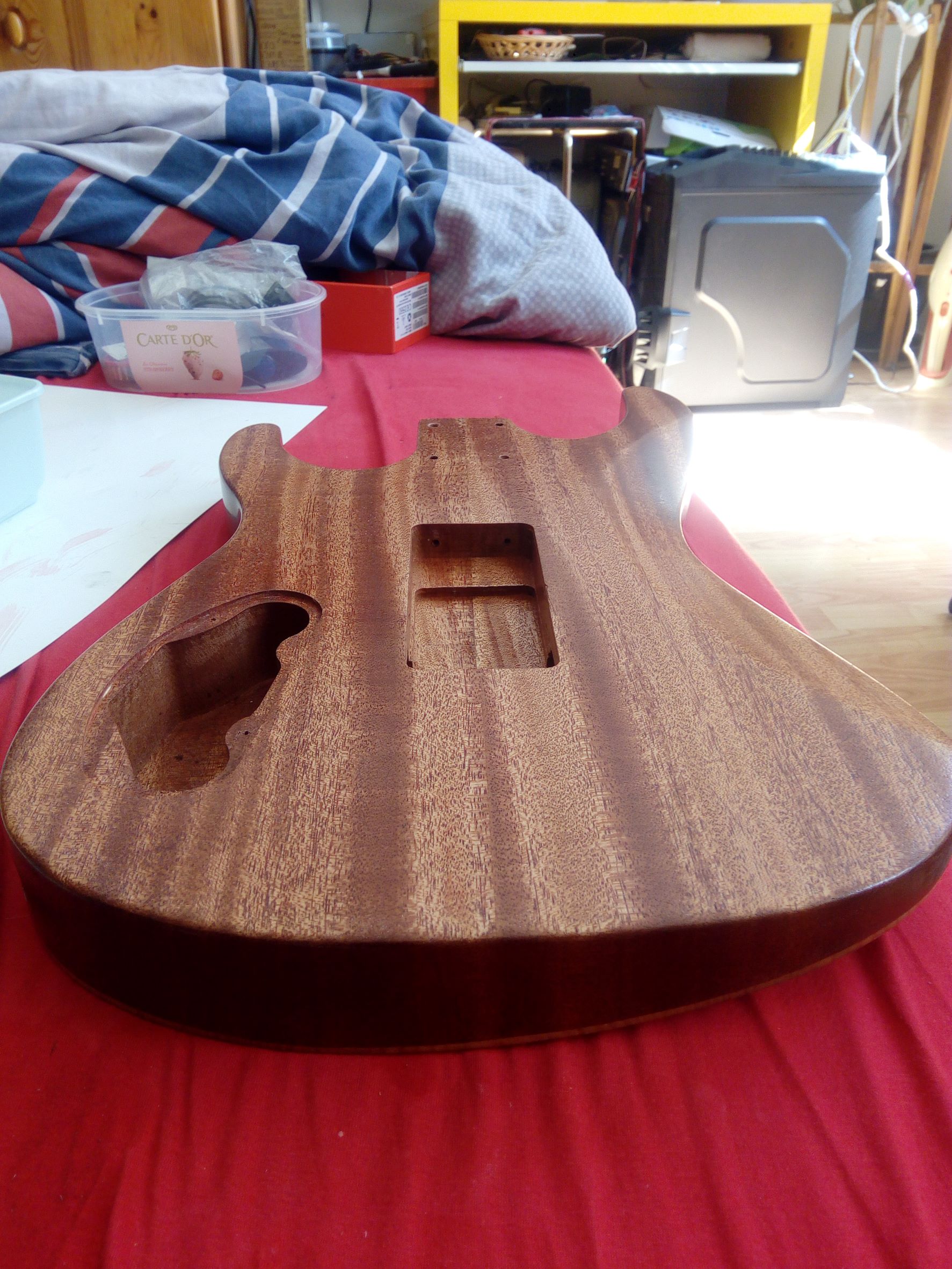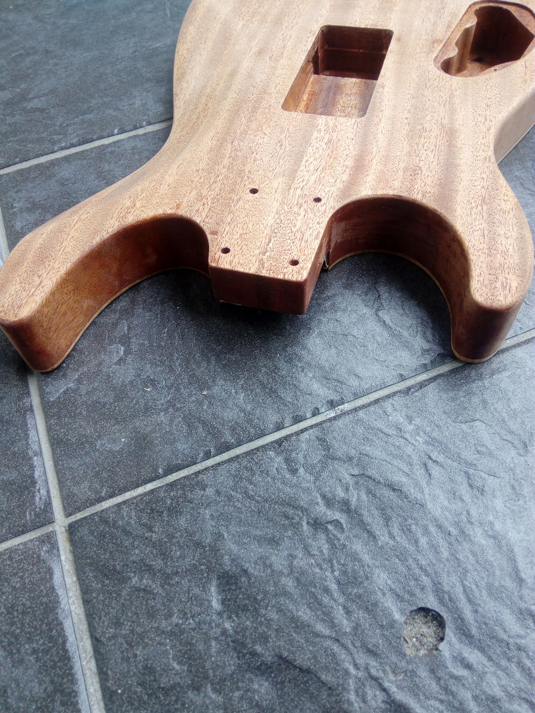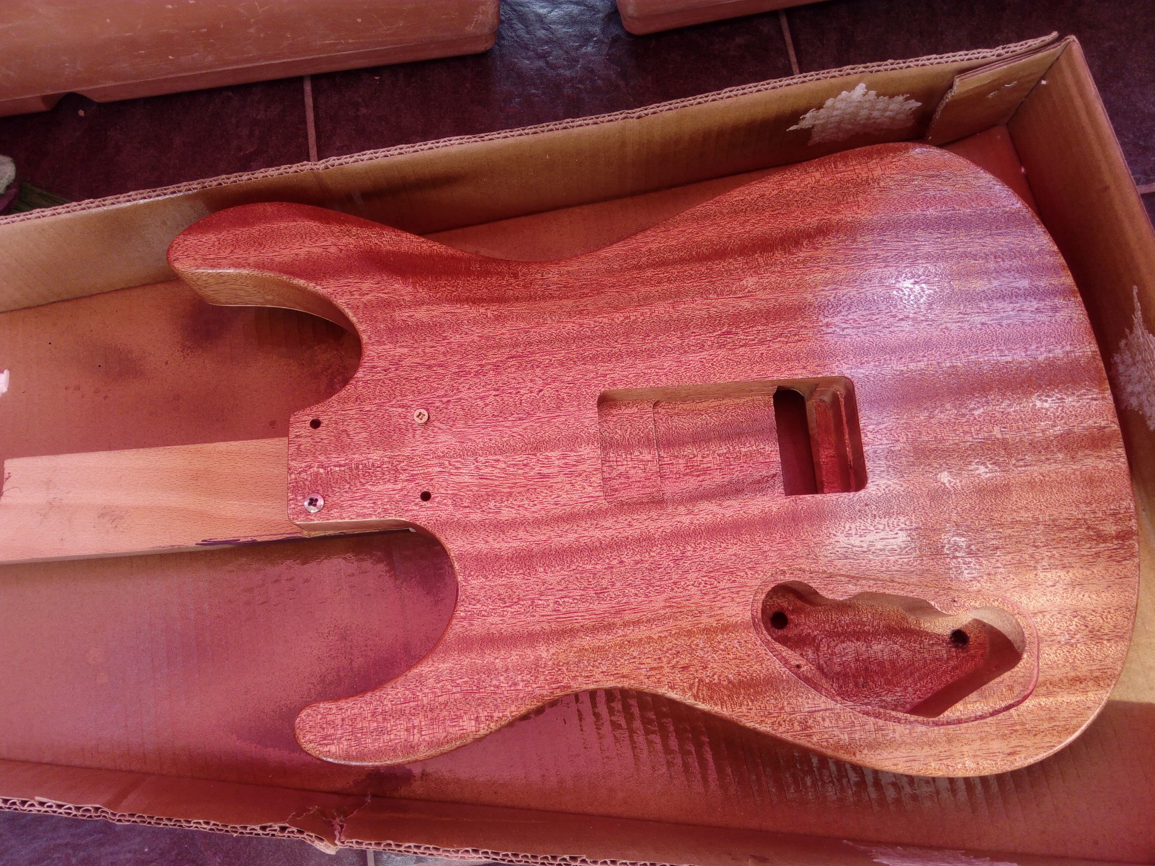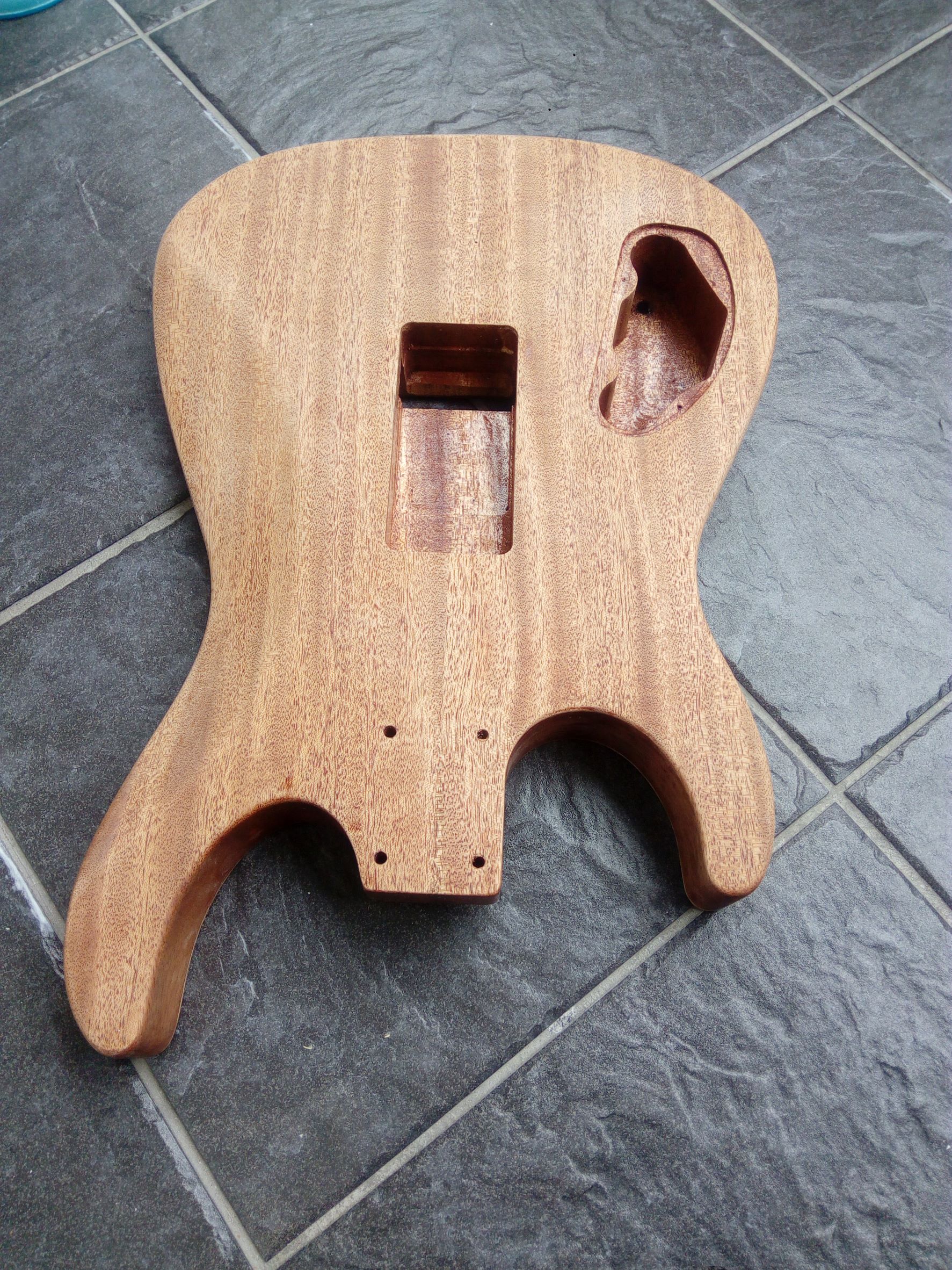 Dnes ráno som gitku trocha prebrúsil, tú lakovanú stranu a zadnú stranu a boky. Očistil a celú strekol.