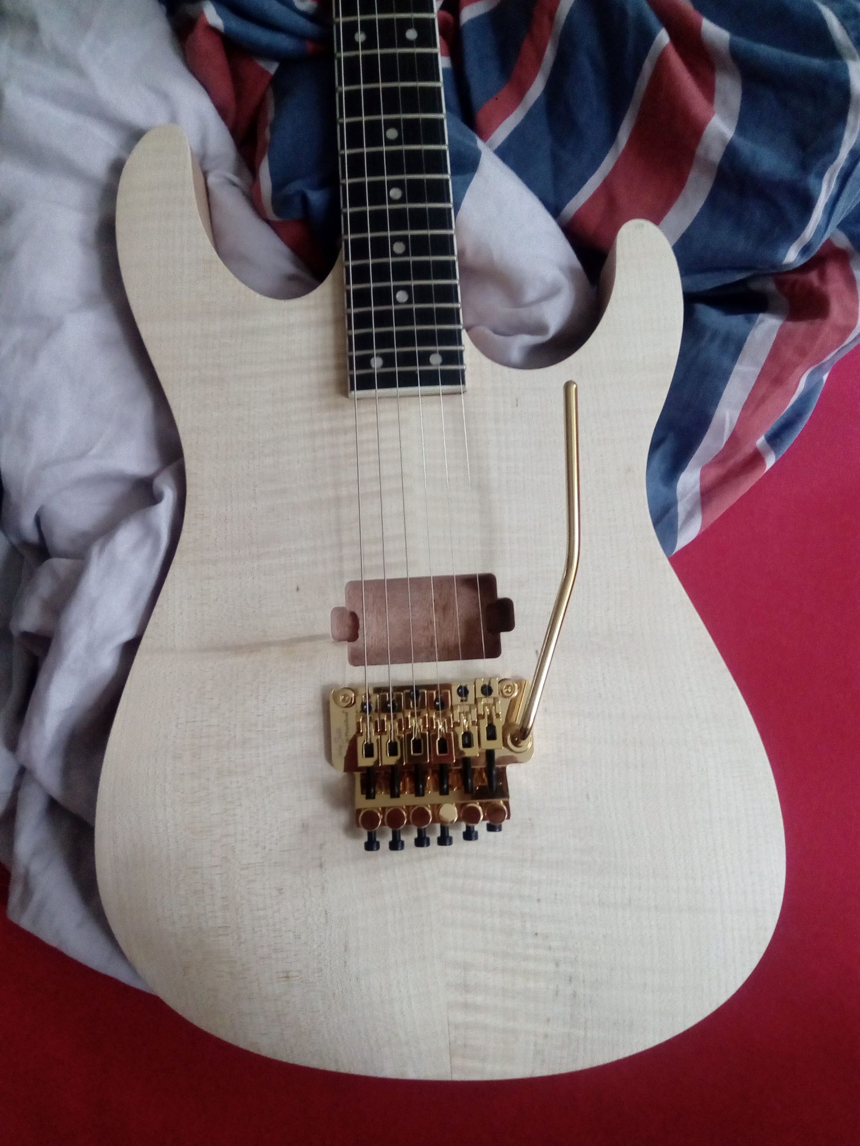 kde som místo lipového tela dal vyrobit Afro Mahagón, vrchná deska flame maple. Krk, Floyd je z Harleyky. Povrchovku som chcel čierno - bordovú, niečo takéto No, začal som morit čiernou a brúsit, aby zostali pruhy, potom som začal morit červenou a následne žltou a oranžovou a vzniklo toto