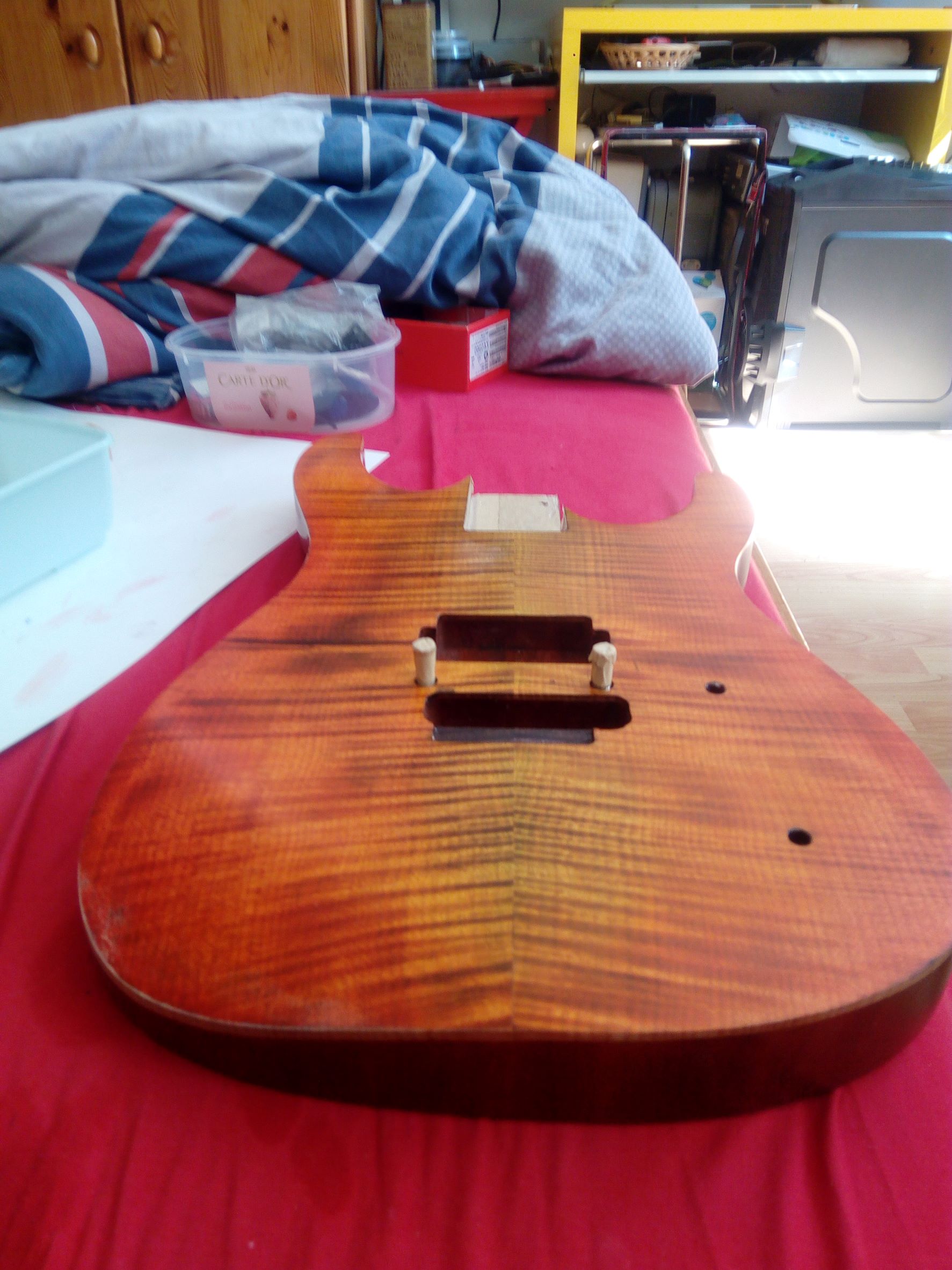 Dnes ráno som gitku trocha prebrúsil, tú lakovanú stranu a zadnú stranu a boky. Očistil a celú strekol.