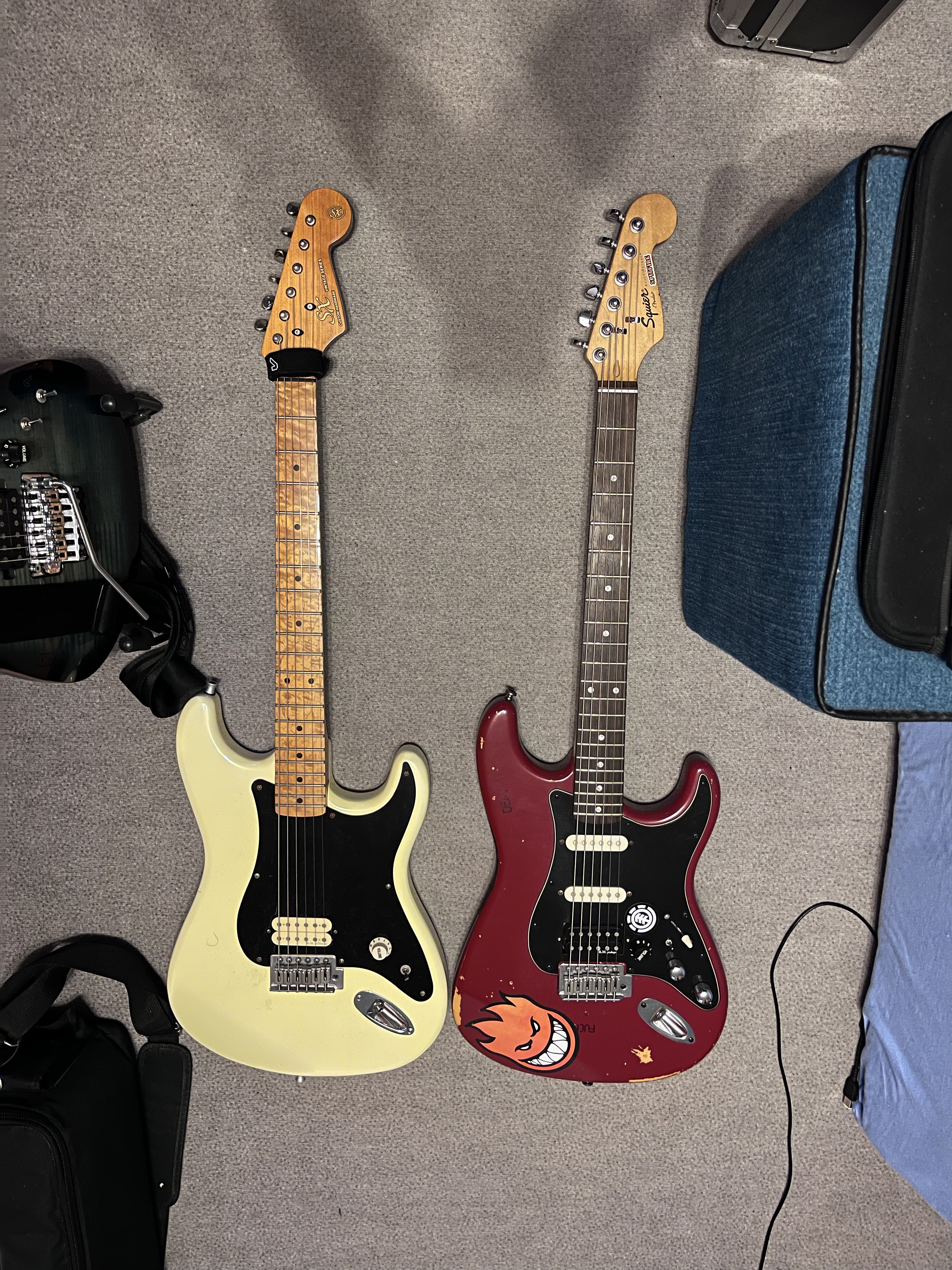 Zde je můj postřeh. Jedna kytara je Squier bullet strat z roku 2007 a druhá SX strat asi rok 2001.