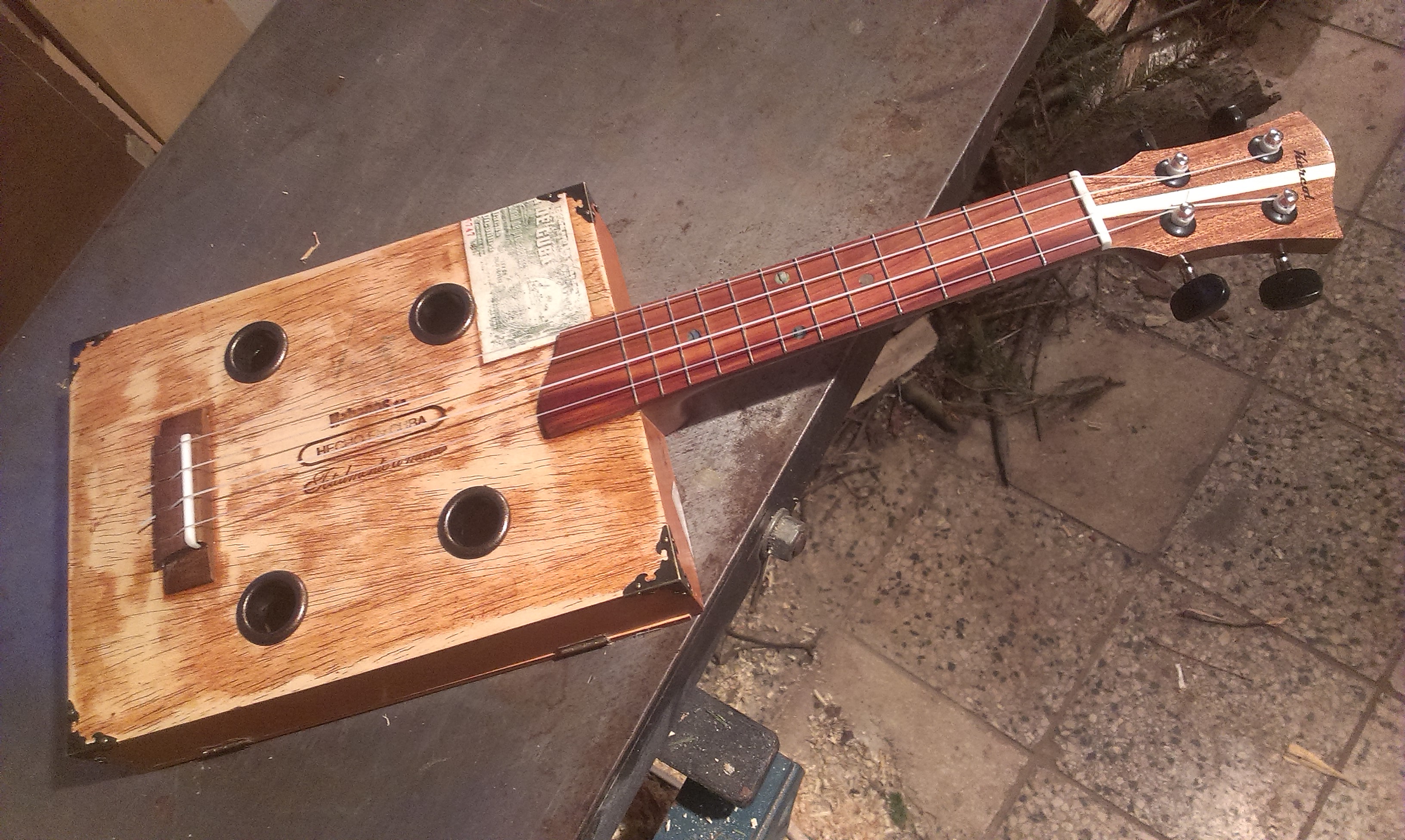 Pôvodne som chcel robiť cigarbox guitar s telecastrovskou elektrikou a telecastrovským krkom, ale krabička ktorú sa mi podarilo zohnať bola na to príliš malá, tak vzniklo toto :D