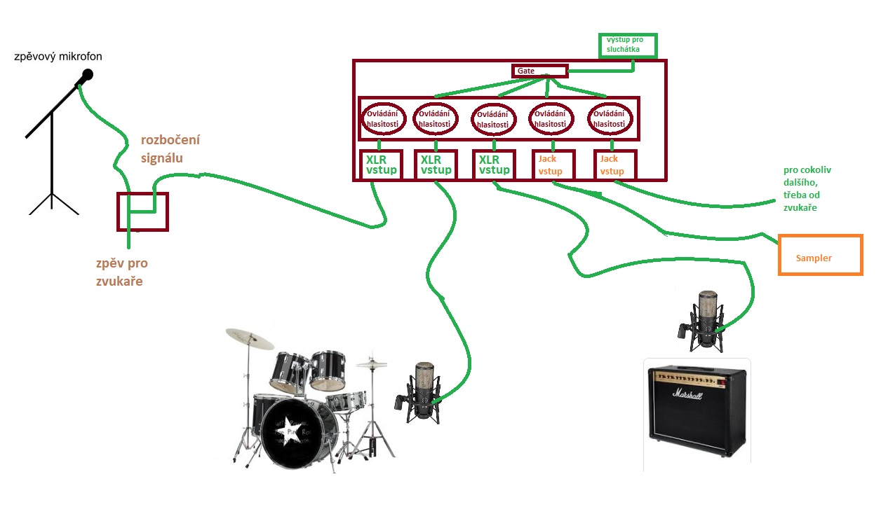 Ideální řešení je mít vlastní mix a splitter. Mikrofony zůstávají na zvukaři a funguje to takto: