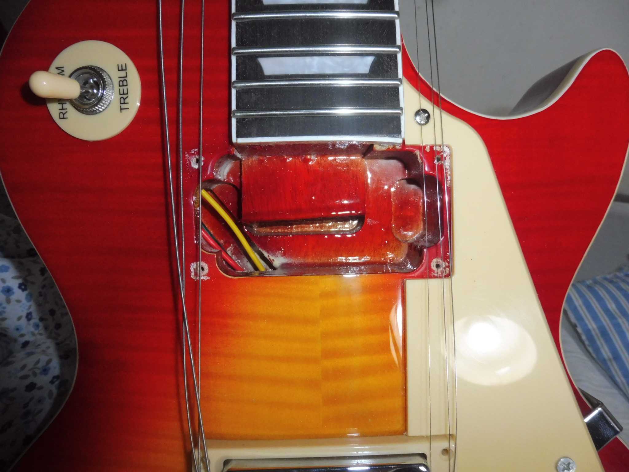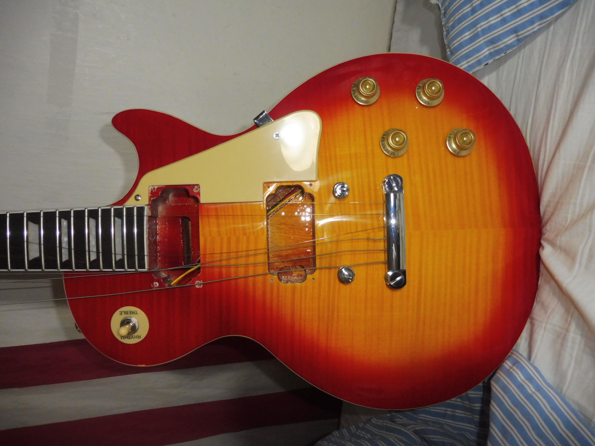 Včera jsem měnil snímače u čínského Gibsona za keramiku Bach. Nepomohlo jí to, hraje stejně. Ale zaujal mne způsob vlepení krku a pak také, jak barva v šachtách kopíruje sunburst na javorovém vršku!