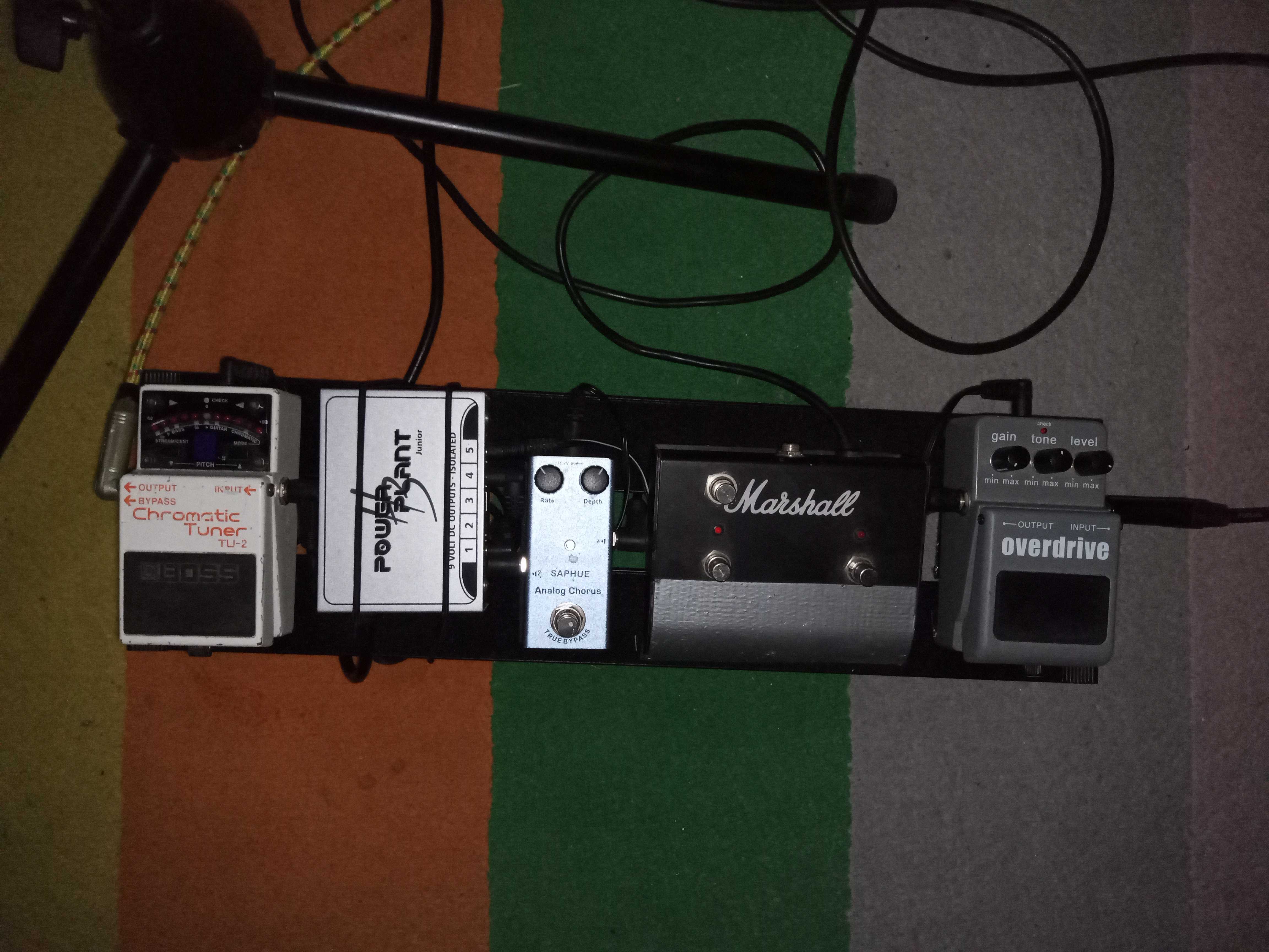 Od posledně žádné větší změny, jen jsem vyměnil oktáver za lepší a místo looperu jsem dal reverb, protože looper stejně v pedalboardu nepotřebuju (a vlastně tam byl jenom aby tam nebylo prázdné místo). Taky jsem trochu zjednodušil pár věcí - MIDI pedál na přepínání presetů na RE-202 jsem nepoužíval. Na level buffer kašlu - ať každá kytara hraje jinak, nepotřebuju srovnávat hlasitosti aby všechny měly stejný výstup. Vyměnil jsem ladičku, protože TU-2 má buffer. Dost jsem v poslední době přemýšlel a ujasňoval si priority a tak nějak si myslím, že tohle bude na delší dobu beze změny.