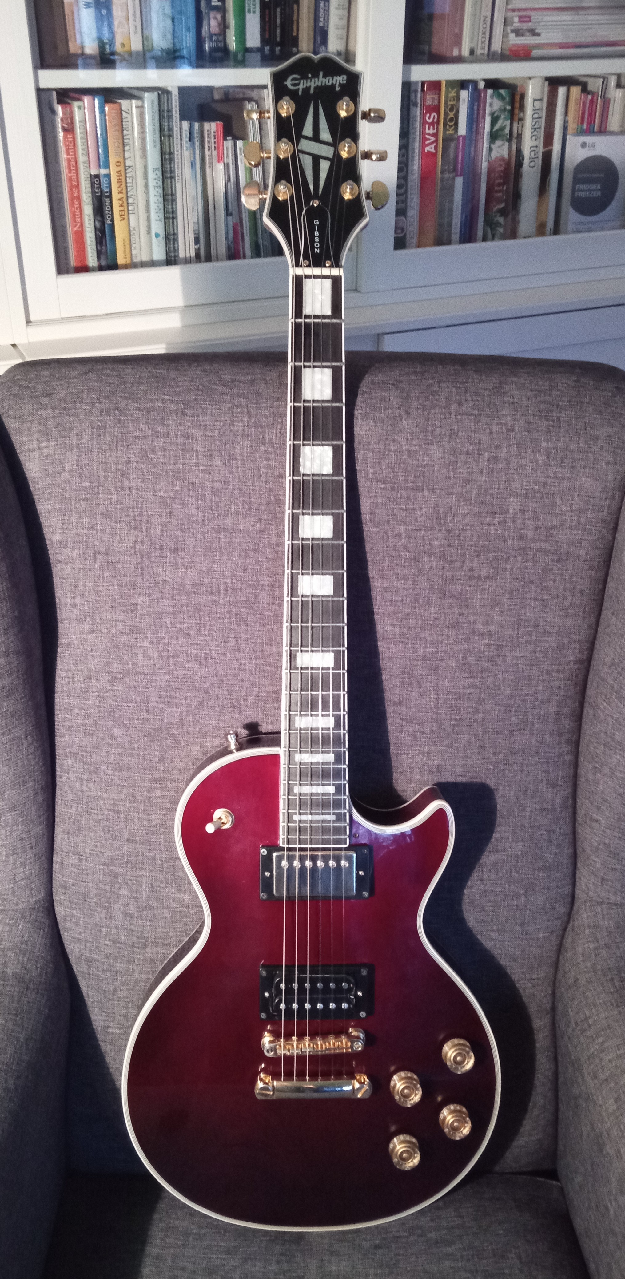2 cid: Wino mě fakt baví - pokud ti krk padne do ruky (což mě moc ne, tak jsem musel brousit) a design nástroje se ti zoufale líbí (jako mě), nemáš na originál Gibson Wine Red Custom (jako já), tak jsou to, myslím, rozumně investované peníze. Navíc je to relativně lehká kytara, čímž mě baví dvojnásob. 98T má být údajně kopie 498T (vyrobená jen a pouze pro Epi Wino, jinde se sehnat nedá, aspoň já to neumím, klidně bych si jeden přikoupil) a podle mne tak i hraje. Je to fakt povedenej snímač, pěkně tlačí, zpívá a má možná špetku víc basů než 498T, což se hodí (ten chlapík ve zmíněném videu na to myslím taky poukazuje). Krkáč je Alnico Classic Pro, takže ten novější Classic, pokud zvoní víc než starší Classic Alnico, tak jsem si toho nevšiml, nebo jsou výšky spíš maskované tím zlatým krytem, který na ostatních Les Paulech nemám, takže nemůžu porovnat. Každopádně ta dvojice na Wino hraje pěkně vyrovnaně a měnit jí nebudu. Třípolohový switch je na Wino bohužel stejně špatný jako na kterékoliv jiné Epině, chodí hodně ztuha, zatím ale funguje a nevynechává, tak ho tam nechávám a vyměním za Switchcraft až začne zlobit. Co se týče ebenového hmatníku, tak je trochu světlejší, méně hustý a lesklý než má moje Studio 1993, ale žádné velké póry, celkově vyrovnaná textura a po průběžném olejování vypadá čím dál líp, řekl bych. Co jsem musel měnit hned, to byl výstupní jack, byl na něm dokonce stržený závit. Konce pražců jsem dobrousit (a dolepit) musel, ale nebyla to nějaká tragédie, měl jsem Gibsona s horšími. P.S. jinak já kytary taky nesbírám, aktuálně jich mám pět, šest, a ty všechny používám - pravda, občas něco koupím, dám do kupy, chvilku se pomazlím a zase pošlu dál... člověk se musí trochu vzdělávat, že :D .