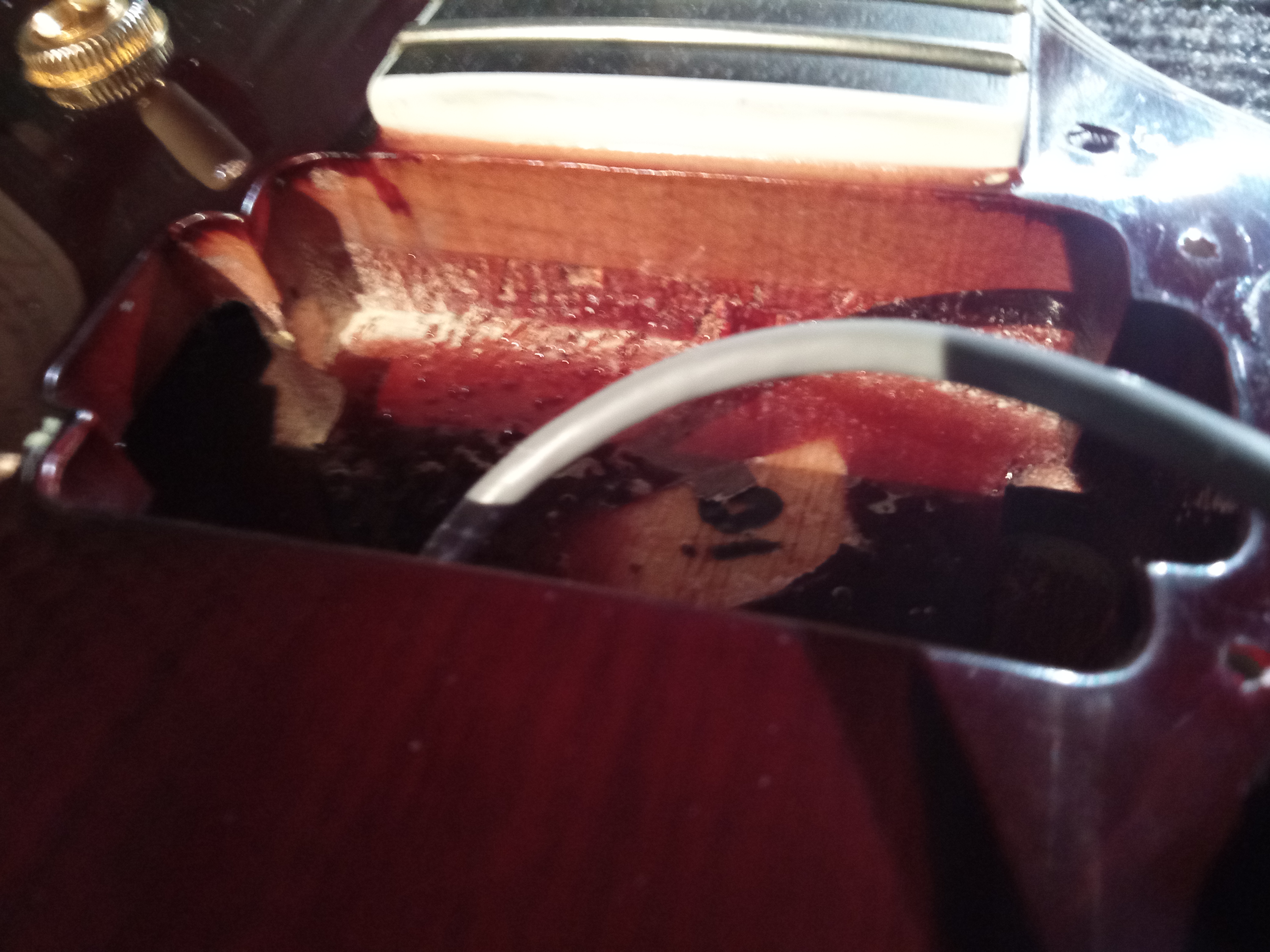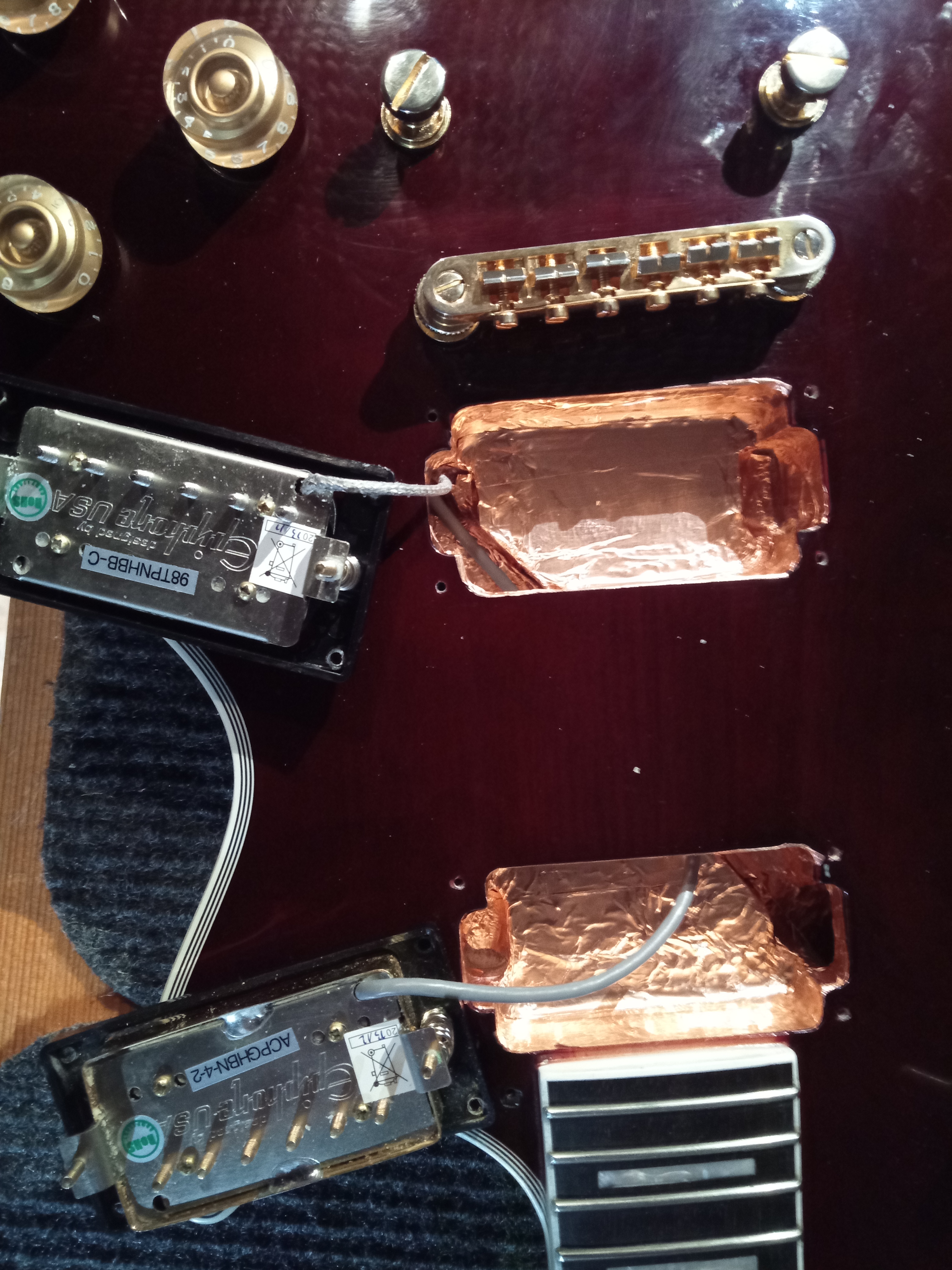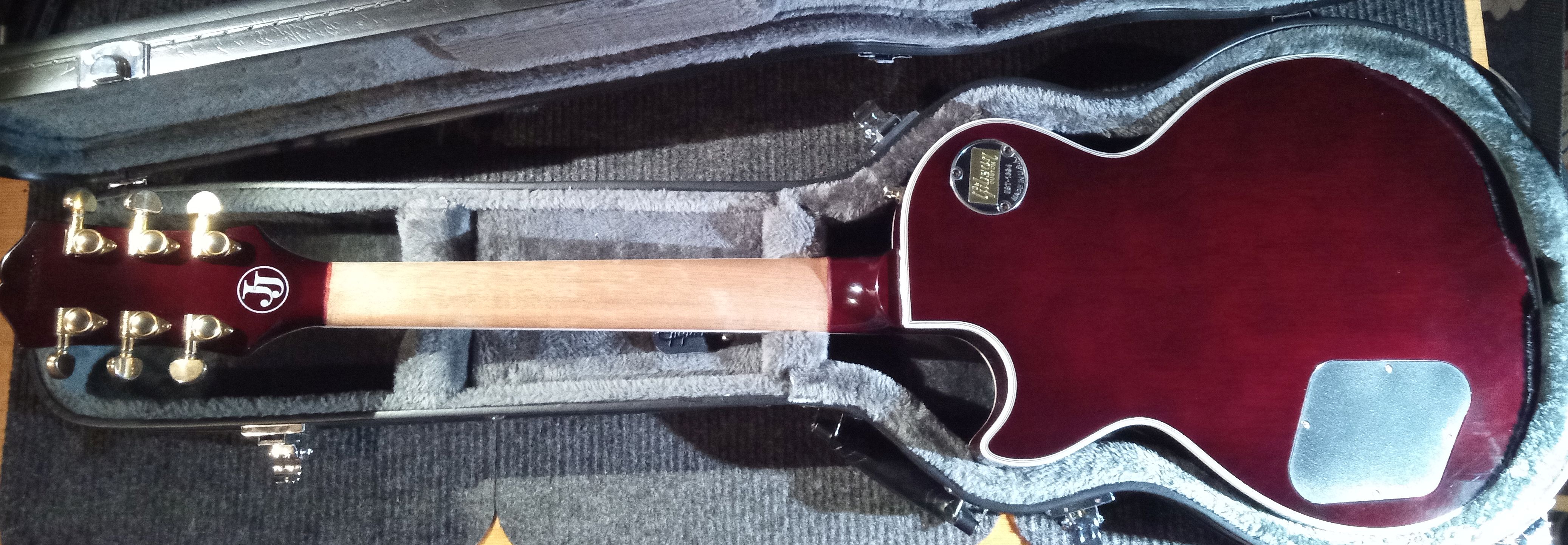 Přihodím do mlýna pár čerstvých zkušeností s (poměrně) drahým Epiphonem. O svátcích jsme se trochu víc oťukávali s novým přírůstkem Epi LP Jerry Cantrell Wino. Kytaru jsem koupil z druhé ruky v prakticky netknutém stavu, nová stávala bratru 22k, takže na Epi vcelku dost. Tovární setup nebyl úplně špatný, ale po výměně strun za hybridy a nutném povolení výztuhy začaly vylézat drobnosti - krk byl mírně do vrtule, takže proběhl fret levelling, rovnou jsem dolepil a zabrousil konce pražců, které trochu kousaly, a sundal jsem poly na zadní straně krku. Po elektrické stránce kytara bručela trochu víc než mi bylo milé, takže jsem elektriku komplet vyndal a dutiny vystínil měděnou fólií. Kytara je teď i při higainu úplně tichá (co se ruchů týče), snímače hrají výborně, dohmat i pocit ze hry jsou super. Zvuk je mocný - adept na hlavní kytaru, pokud na ní ještě někde narazíte, vyzkoušejte. P.S. javorový top je fakt tlustý, viz foto, tenon je short, ale sustainu hromada.