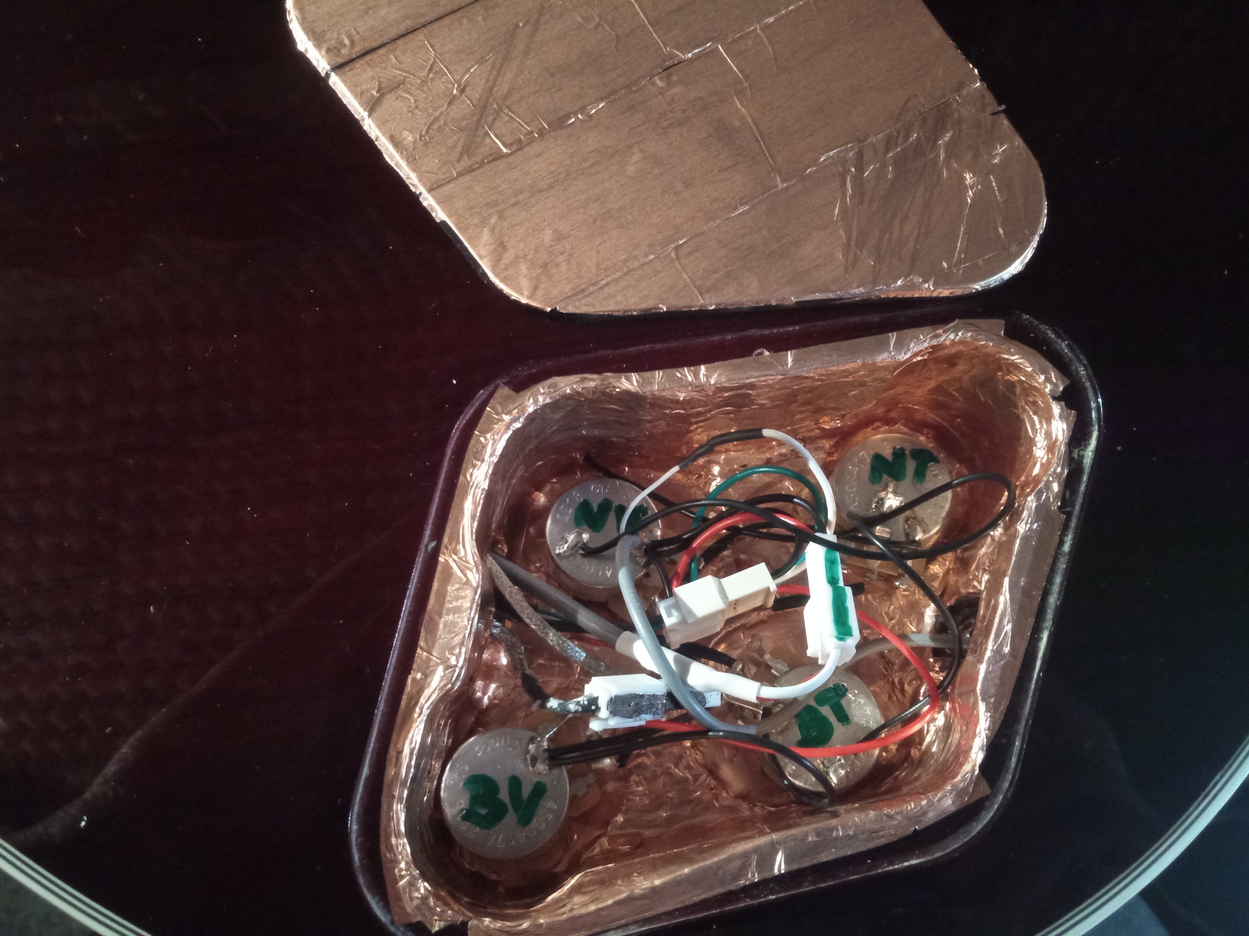 cid: děkuju za pochvalu! Kondíky jsou tam malé oranžovo-hnědé kapky, jako na potvoru jsou na fotce skryté pod konektory snímačů, nejsou ale uvnitř konektorů, visí normálně na zaizolovaných packách připájených k potenciometrům. Kytara hraje krásně, nevím nakolik mají kondy a CTS poty vliv na zvuk, ale elektriku ani snímače měnit nebudu, oproti originál Gibsonům 490/498 neslyším rozdíl. Samozřejmě je tam ten plechový kryt na neck pickupu, který zvuk ovlivňuje, ale v téhle kytaře to funguje, zvuk není pod dekou, kytara krásně rezonuje nasucho i plugged. Hezké video s těmi kondy - chlapík si s tím vyhrál :D .