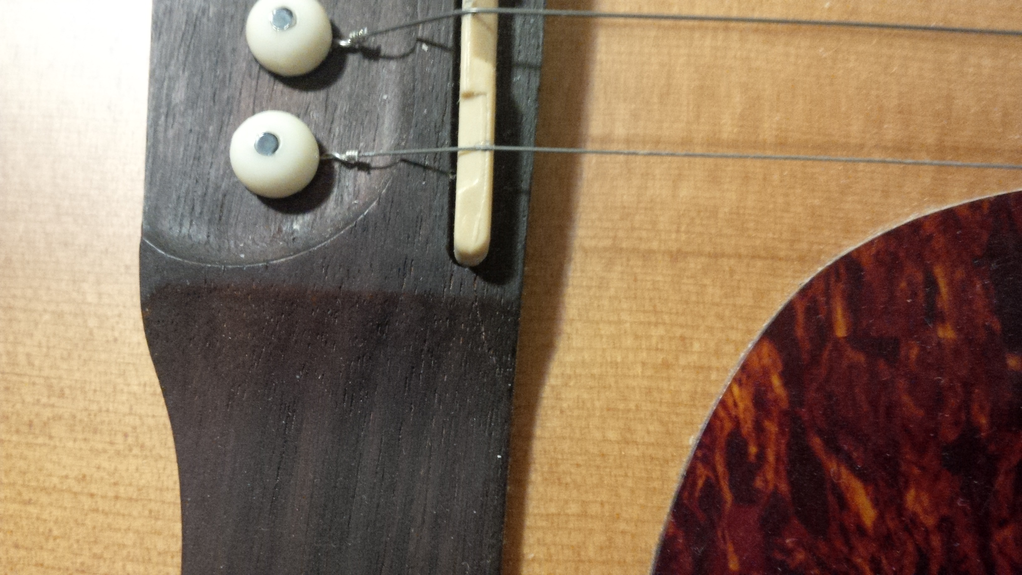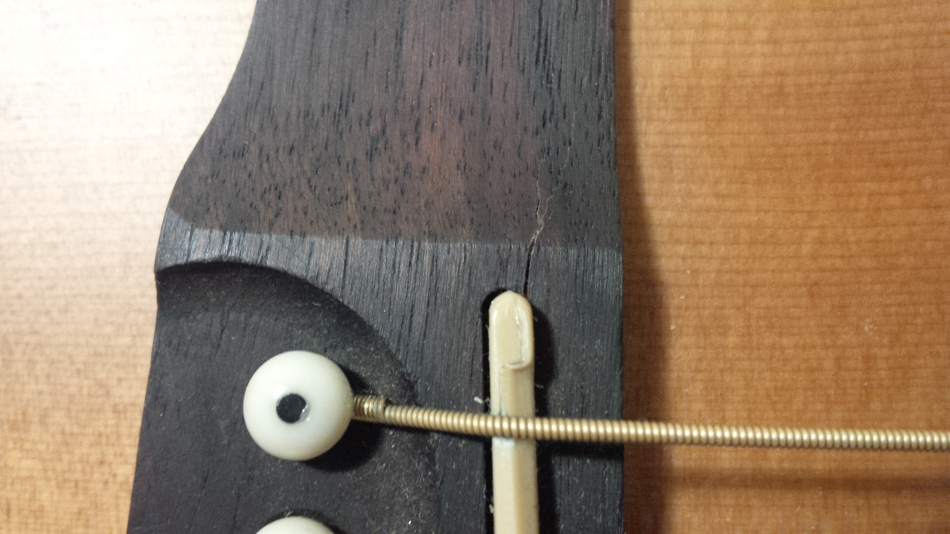rád bych Vás požádal o radu ohledně mé kytary a případně využil Vašich služeb. Můj problém je následující: plastový plátek v kobylce, který mám na své akustické kytaře Cort Earth 70 W NS (dreadnought) pravděpodobně příliš tlačí na otvor ve kterém je usazen směrem ke krku (opravdu je o tu stranu silně opřen). Dochází tak k praskání kobylky, ačkoliv kobylka se neodlepuju, ale dřevo se rozštěpuje. Vše je názorně vyfoceno. Na kytaře jsem měl střídavě struny 0.11 a 0.12, aktuálně 0.12. Kytara je rok a půl stará. Kobylka vyrobena z palisandru, stejně tak hmatník. Přední deska masivní smrk, zadní a luby mahagon, to samé krk. Pro upřesnění přikládám fotografie.