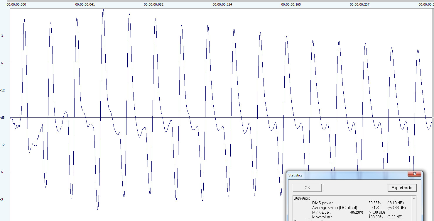 RMS power je -14,27dB (19,35%), tady má ten můj prográmek chybu, mělo tam být uvedeno jenom RMS. Během těch 6s záznamu by se mi rafička/zobrazení na multimetru motalo kolem hodnoty jen 7,7V =(0,1935*40). Chvilku by tam bylo víc, chvilku míň.