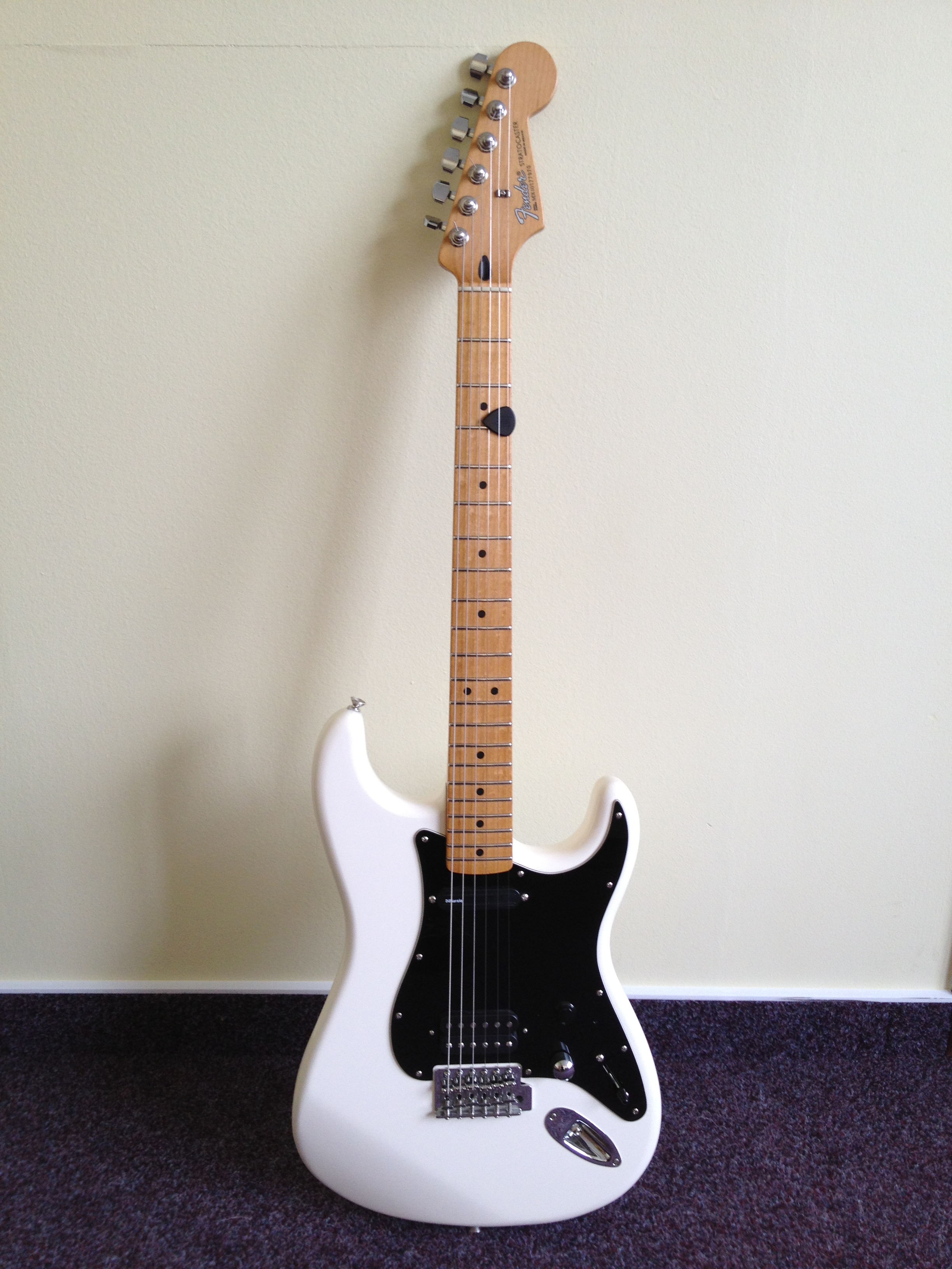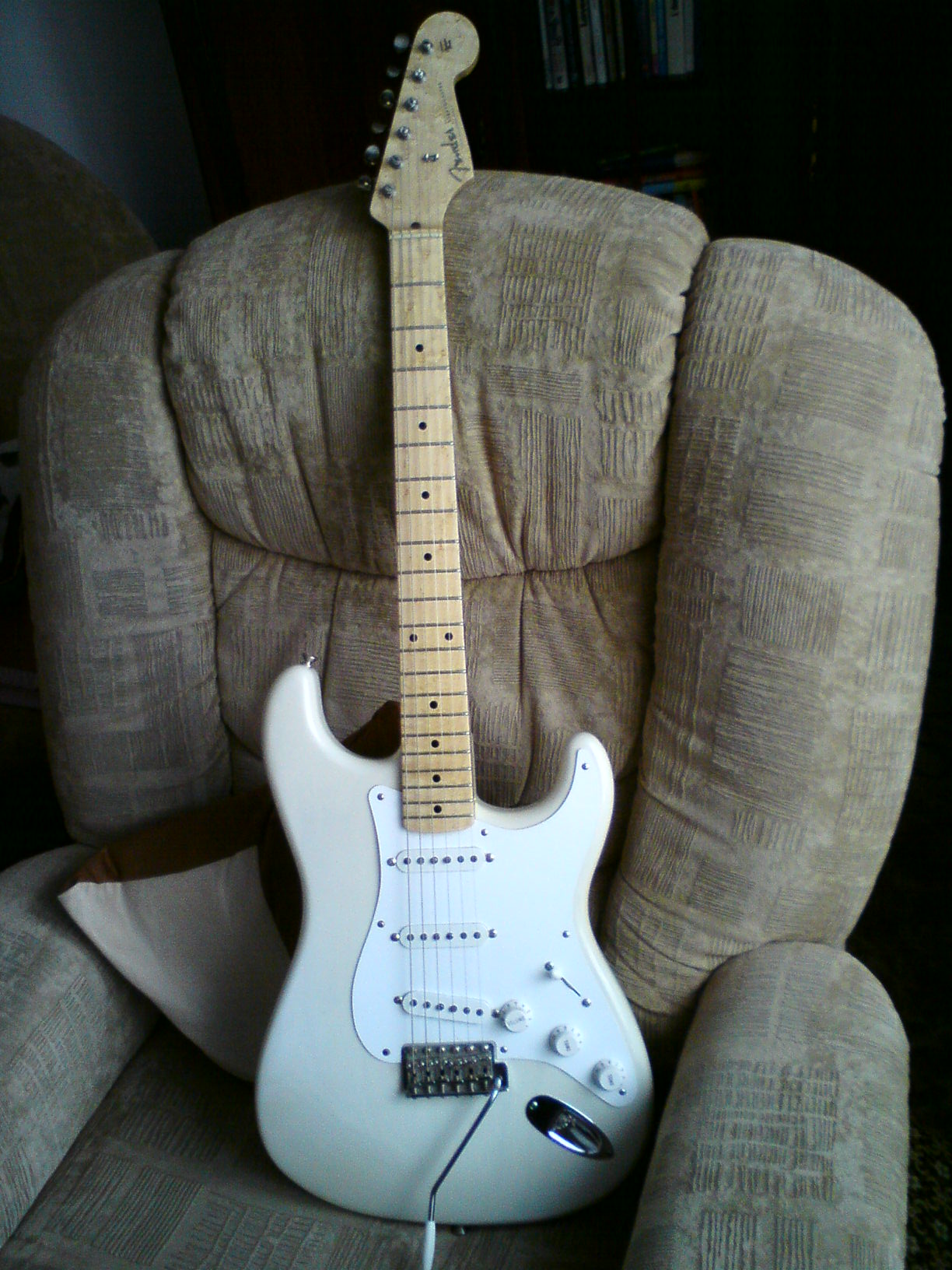 Mám slabost na bílý kytary a když jsem si pořídil tohohle strata,tak jsem hrozně řešil pickguard.Že ho vyměním za černý.Nakonec jsem si zvykl na zlatý a už bych asi neměnil.Je to prostě to co je na téhle kytaře zajímavý a neobvyklý.Kromě bílé se mně ještě líbí straty v Lake Placid Blue s javorovým hmatníkem