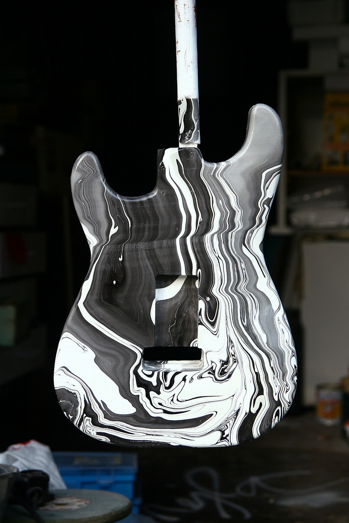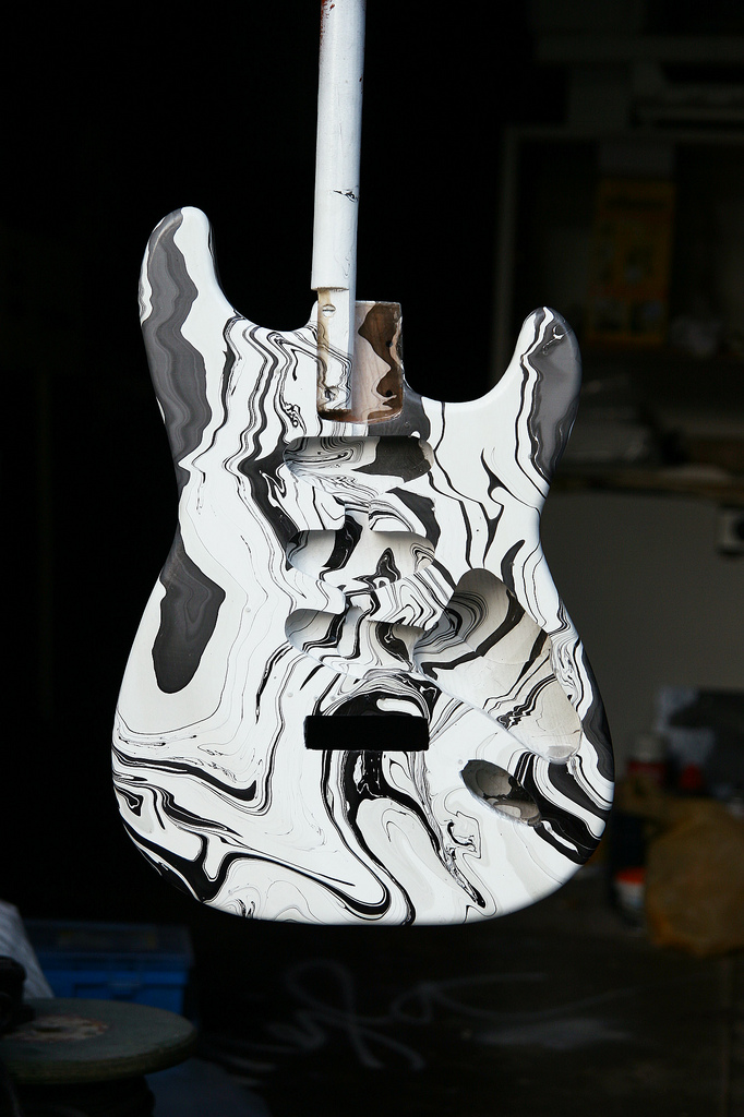 ..trosku to zabralo, ale porad to chtelo zmatnit..tak sem se na vysral, vzal cerny matny lak co mi cirou nahodou lezel ve skrini a proste to prestrikal:D...no...byl to rychleschnouci takze za chvilku vklidu tak sem sel swirlovat..naredil sem ty barvy co sly..cervena bylo vpoho, ta pekne plavala na hladine ovsem cerna nejak zlobila...idyz byla uuuplne rozredena, porad padaly kapicky barvy dolu na dno sudu a nahore zbyl jen taky sedy opar(:D)ale tak sem si rekl ze mam cerny zaklad a nak to dopadne..tak sem to tam strcil..rozmichal barvu vyndal..a ejhle, neni to zas tak zly...pak to tri dny schlo a potom sem kazdy den v prubehu dne dal dycky tak tri vrstvy bezbarveho laku..je tam tak 7-8 vrstev tusim...kdyz sem brousil loze krku potom, tak sem to vzal normalne raspli(smirglem sem fakt nemel sanci)dostal se na drevo, tam uz sem to smirglem hezky dorovnal a ujebl sem kousicek laku...aspon sem zjistil ze mi to udelalo pekny film....no..pak sem to dal dokupy..a to je tak secko...