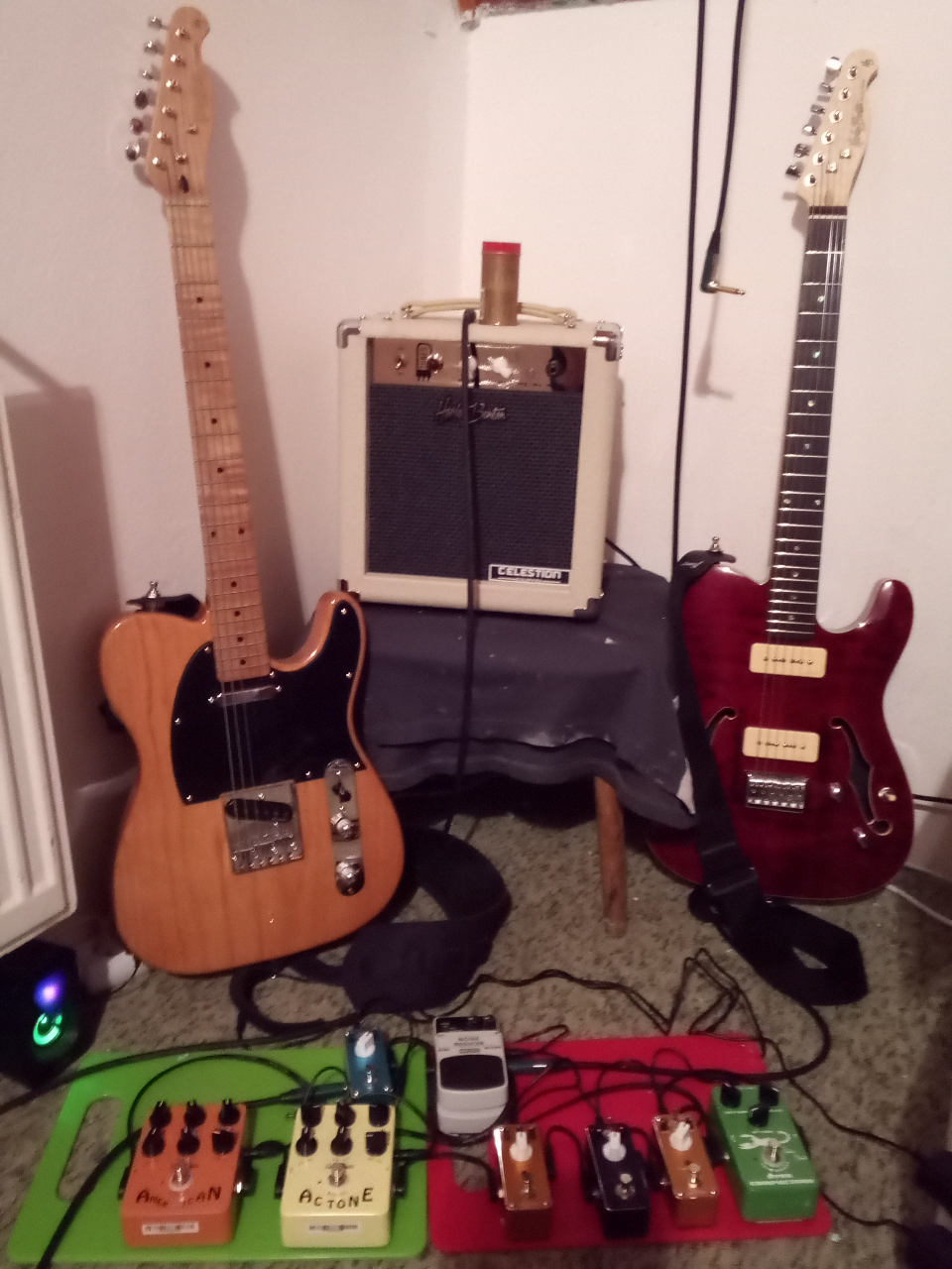 Docela se mi líbí i čistý zvuk jenom přes kompresor a reverb přímo do toho malinkatého HB Tube5, to je docela měkký a teplý zvuk jazzové kytary, ovšem nejradši hraju nějaký lehký crunch. Jako bluesový nástroje v porovnání ty dvě telata asi takhle: TE-52 je taková zaplivaná putyka v dělnické čtvrti Chicaga (prostě tvrdé, ostré a řinčivé Tele bez kompromisů), TE-90 hospoda páté cenové skupiny v deltě Mississippi, za dusného podvečera (výrazně teplejší a barevnější zvuk, ovšem pořád je v tom cítit ta telecí"syrovost")