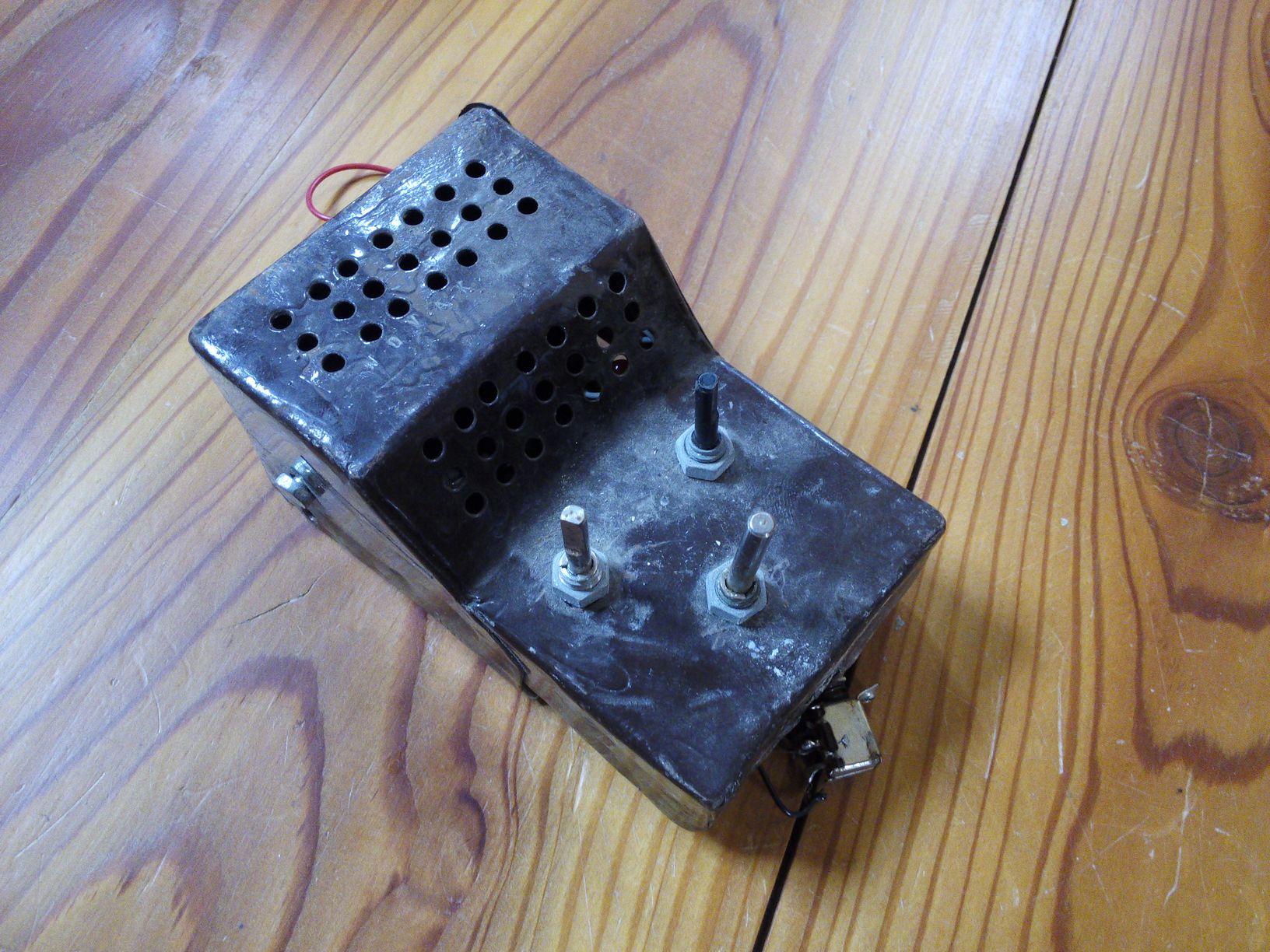 Punková povrchová úprava vznikla tak, že krabička ležela nekolik týdnů v mokru poté, co ve zkušebně prasklo topení a při úklidu se na ní někde v koutě zapomnělo (původní vnitřek byl komplet na vyhození). To si pak přímo říkalo o to, se s tím už moc nepárat a jen tak halabala to popsat fixem....