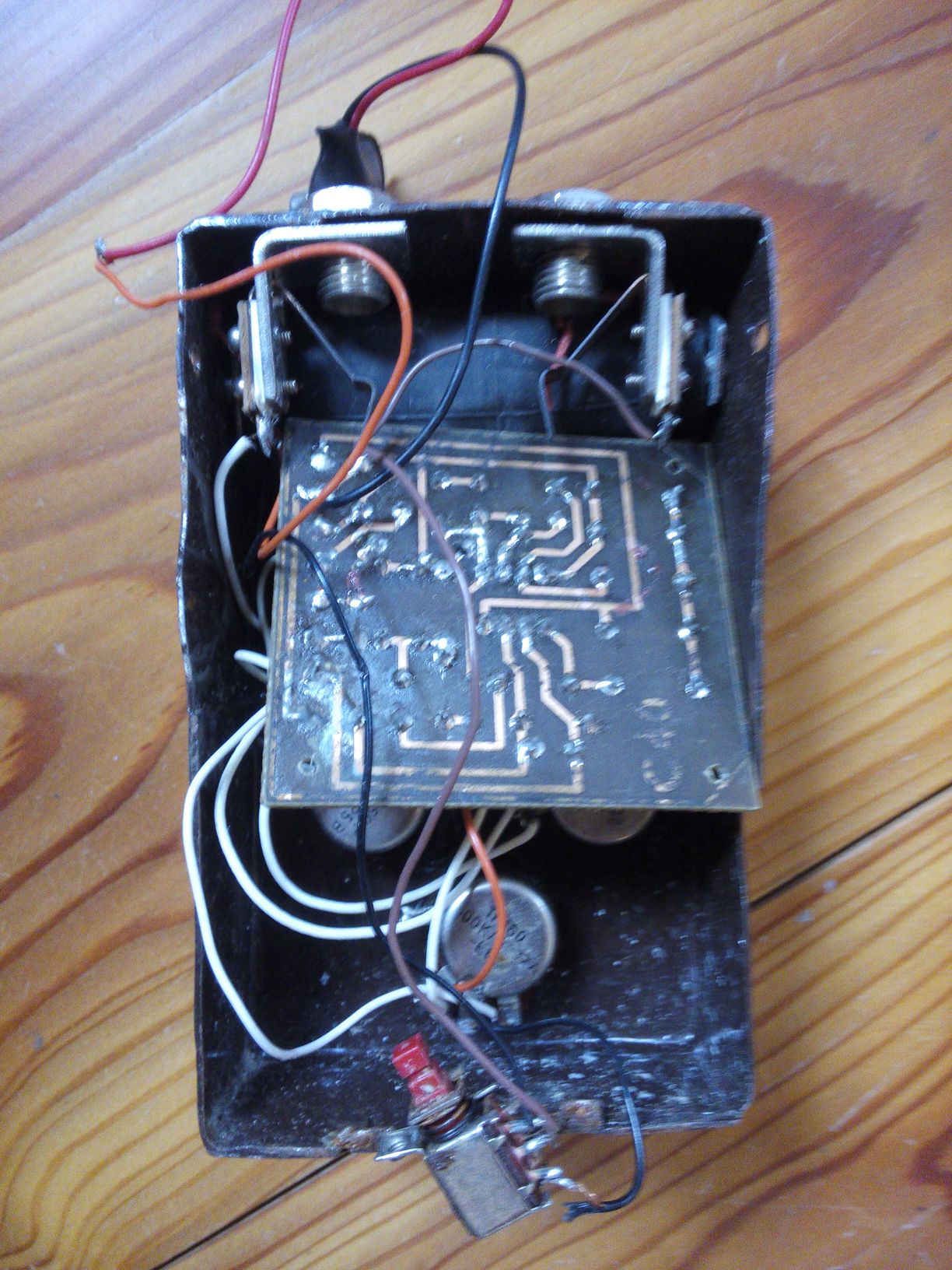 Spolu s nefunkčním wahem GD (opraveno) jsem koupil i nedokončený overdrive. Velice zajímavé, kvalitní zpracování. Žádná levná plechovka, ale je to poctivě svařeno z cca 1,5 mm oceli! Včera jsem na to vlít, efekt byl funkční, stačilo jen připojit. Vlastně ještě vyvrtat a osadit zdířku 9V. A dirku na LED. S tou byl největší problém, nefungovala, tak jsem to nějak proklemoval a už šlape, i když slabé světlo. Není TB, má interní spínání, tedy tlačítkem (buffered bypass?). Zvukově dost povedený, od jemného drivu, skoro SD-1 (ale ten je slyšitelně zemitější, ve středech) až ke zpívajícímu leadu - modern Marshall. Nejvíce se zvukem podobá BOSS dualoverdrive, oběma kanálům. Dvoupásmové korekce fungují trochu nezvykle, jedna jako pásmový eq., ale dá se nastavit normální drive. Trochu lupe spínač při vypnutí.