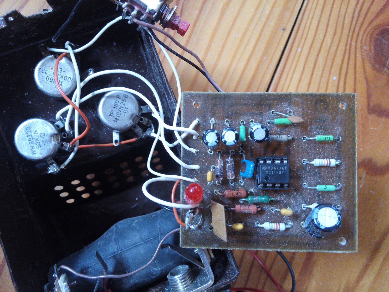 Nepoznáte někdo svůj výtvor? Nebo co je to za stavebnici? Předpokládám něco z Amára, ale konkrétně toto jsem nenašel. Je to overdrive s dvojitým operákem 1458 a Ge diodami, na PCB velký nápis C40. Je to nález z elektroodpadu, opraven a nějak hraje.