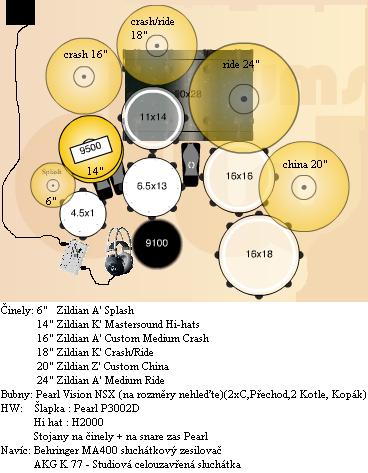 Bicí GRETSCH Catalina Maple, snares MAPEX, drumrack a ostatní HW GIBRALTAR, double Mapex falcon, plechy ANATOLIAN, blány REMO, paličky R-STICK custom signature model, in-ear Shure + bezdrát LD, .. a ruce i nohy k nezaplacení:)))