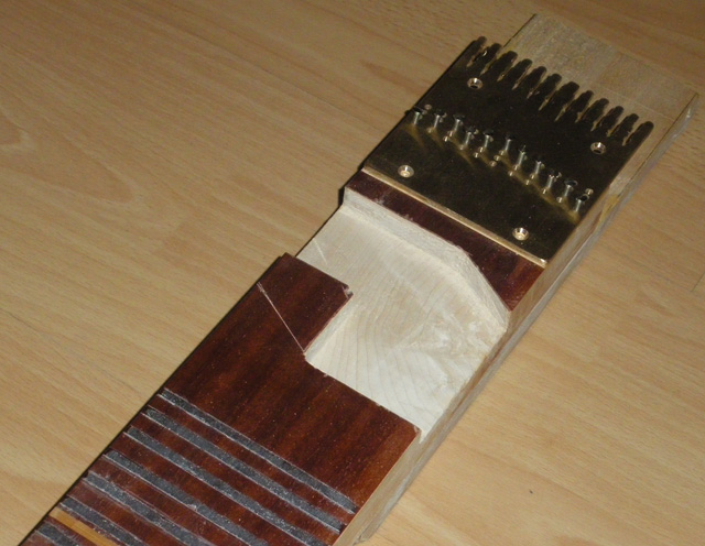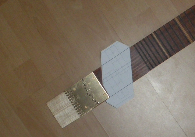 trochu dost jsem se zdržel řešením rovinné plochy hmatníku před osazením pražců. Kontrola neprůhledným pravítkem proti světlu ukazovala mírné nepravidelnosti, ale hlavně skoro 1 mm "břicho". S výztuhou se to dalo udělat ještě "břichatější". Nechci spoléhat na protitah strun a tak jsem se rozhodl vyrovnat břicho následovně:
