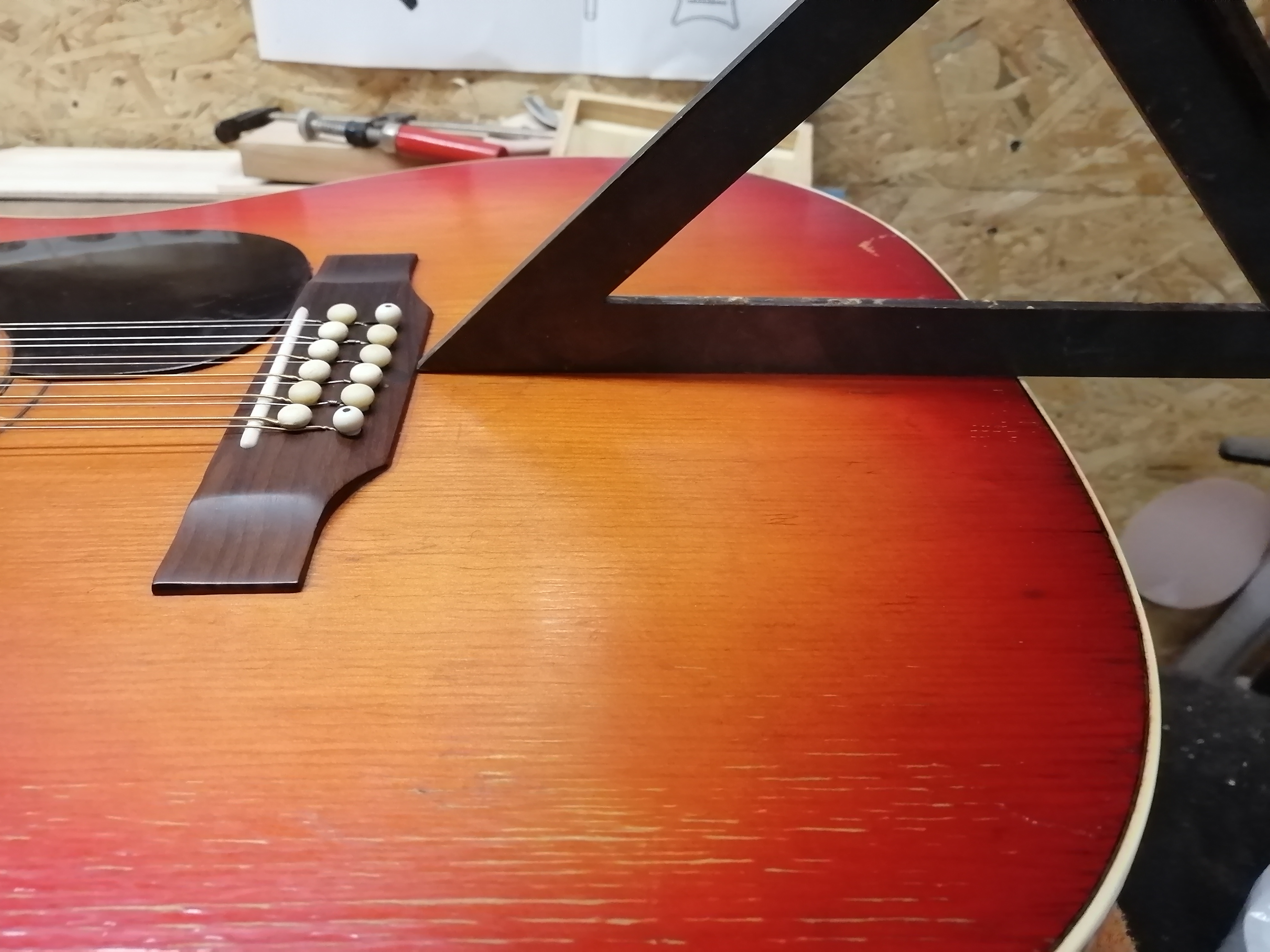 Ahoj, přispěju také jak jsem opravoval zborcenou desku u 12 ti strunky. Kobylka prasklá a napůl utržená, boule cca 5mm. Vrchní desku se mi podařilo srovnat takřka do ideální roviny, původní kobylku jsem také vyspravil a zachránil. Po těchto úpravách radši také instaluji po domluvě se zákaníkem Bridgedoctor vlastní výroby.