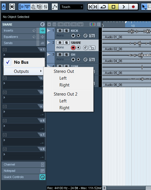 Nevím jestli jsem tě dobře pochopil. Pokračoval jsem tedy dále a snažil se u každé stopy nastavit OUTPUT. Jenže tam lze vybrat BUĎ Stereo 1 a NEBO stereo 2 (bohužel né oba zároveň). Viz obr.