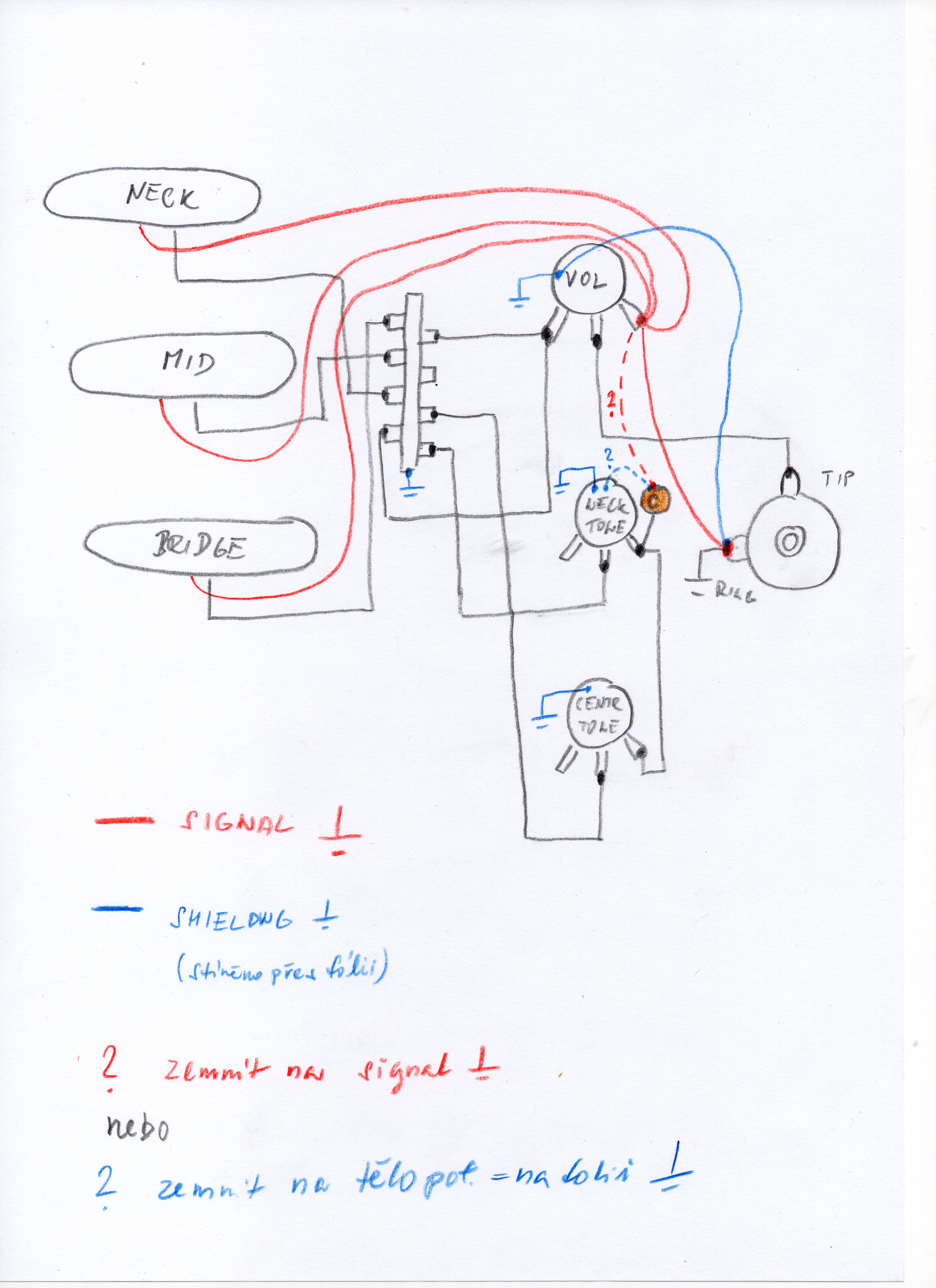 Signálové země ze všech snímačů svedu na pravý kontakt volume potenciometru a odtud pak rovnou na zem jacku, Ok ? Pokud je signálová zem takto zvlášť, kam se potom připojuje kondenzátor u tónové clony ?