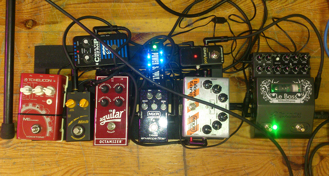 Mini switch Widara, TC Polytune mini II (nafotce jeste I), ISP Decimator Gstring II (na fotce jeste I), Analogman BiComp mini,Ibanez TS808 (vintage JRC4558DV chip), Boss CH1 (pink edition, analog), Boss GE7 (black edition, japan), Boss DD3 (japan, big chip), Cusack Tap-A-Whirl (version I), Dr Scientist Reverberator, Electro Harmonix Small Stone (vintage USA), Truetone Pure Tone Buffer, True bypass lišta 7x Smrčka, 8x10v smrčka, Harley Benton Power Plant Junior, Diago Gigman, Picolino mini DI-Box (pro piezo snimac)