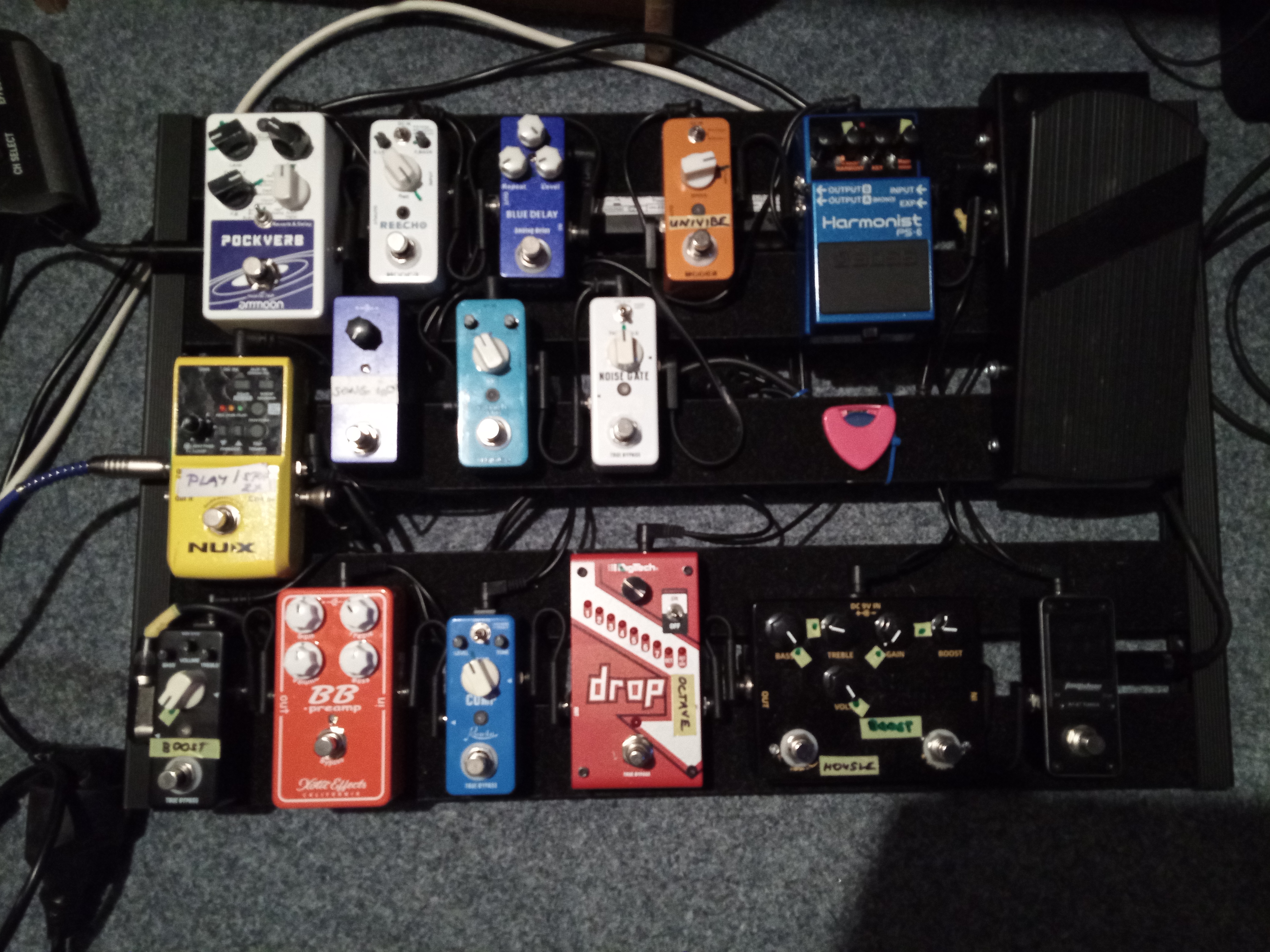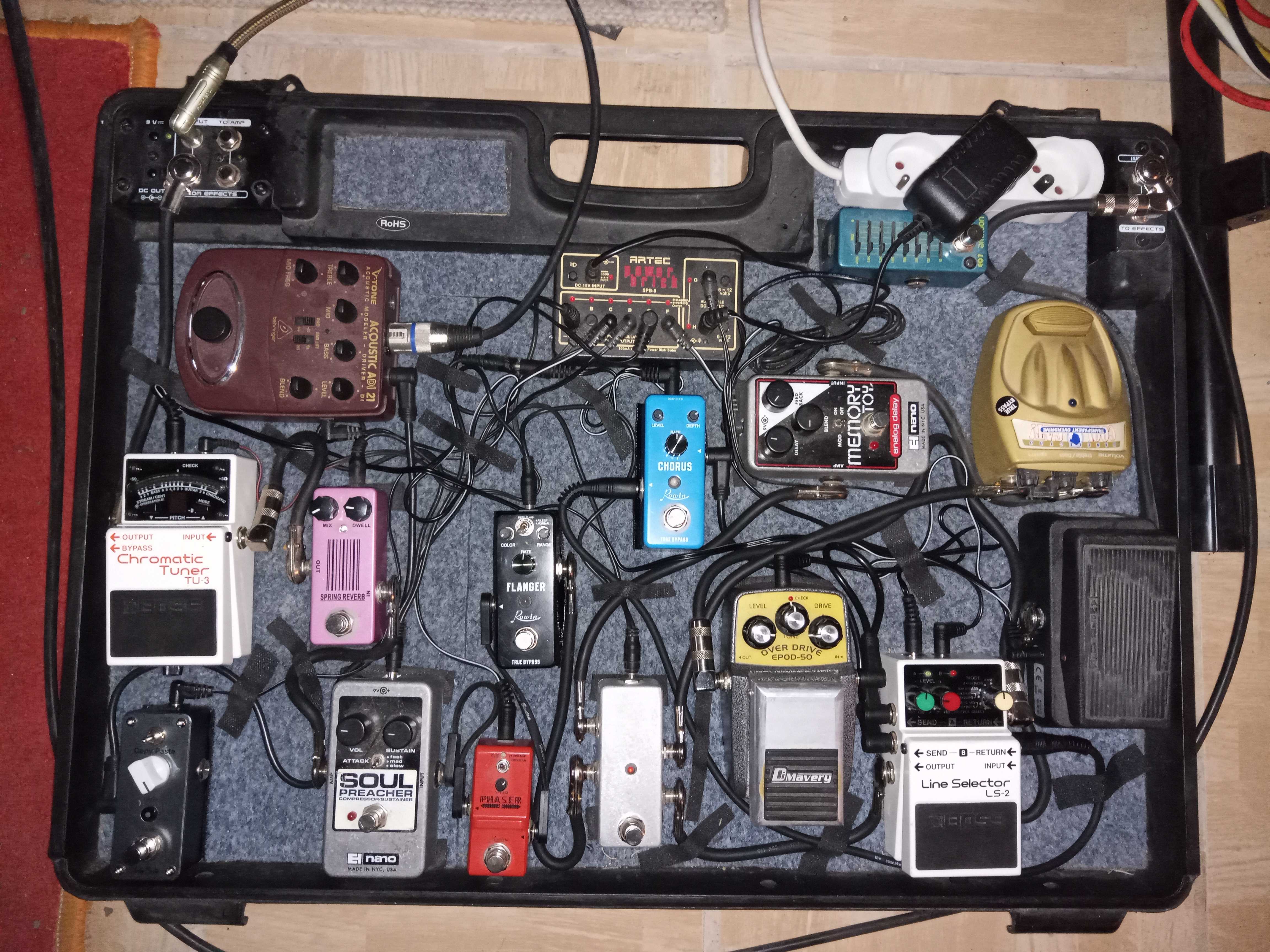 Od posledně žádné větší změny, jen jsem vyměnil oktáver za lepší a místo looperu jsem dal reverb, protože looper stejně v pedalboardu nepotřebuju (a vlastně tam byl jenom aby tam nebylo prázdné místo). Taky jsem trochu zjednodušil pár věcí - MIDI pedál na přepínání presetů na RE-202 jsem nepoužíval. Na level buffer kašlu - ať každá kytara hraje jinak, nepotřebuju srovnávat hlasitosti aby všechny měly stejný výstup. Vyměnil jsem ladičku, protože TU-2 má buffer. Dost jsem v poslední době přemýšlel a ujasňoval si priority a tak nějak si myslím, že tohle bude na delší dobu beze změny.