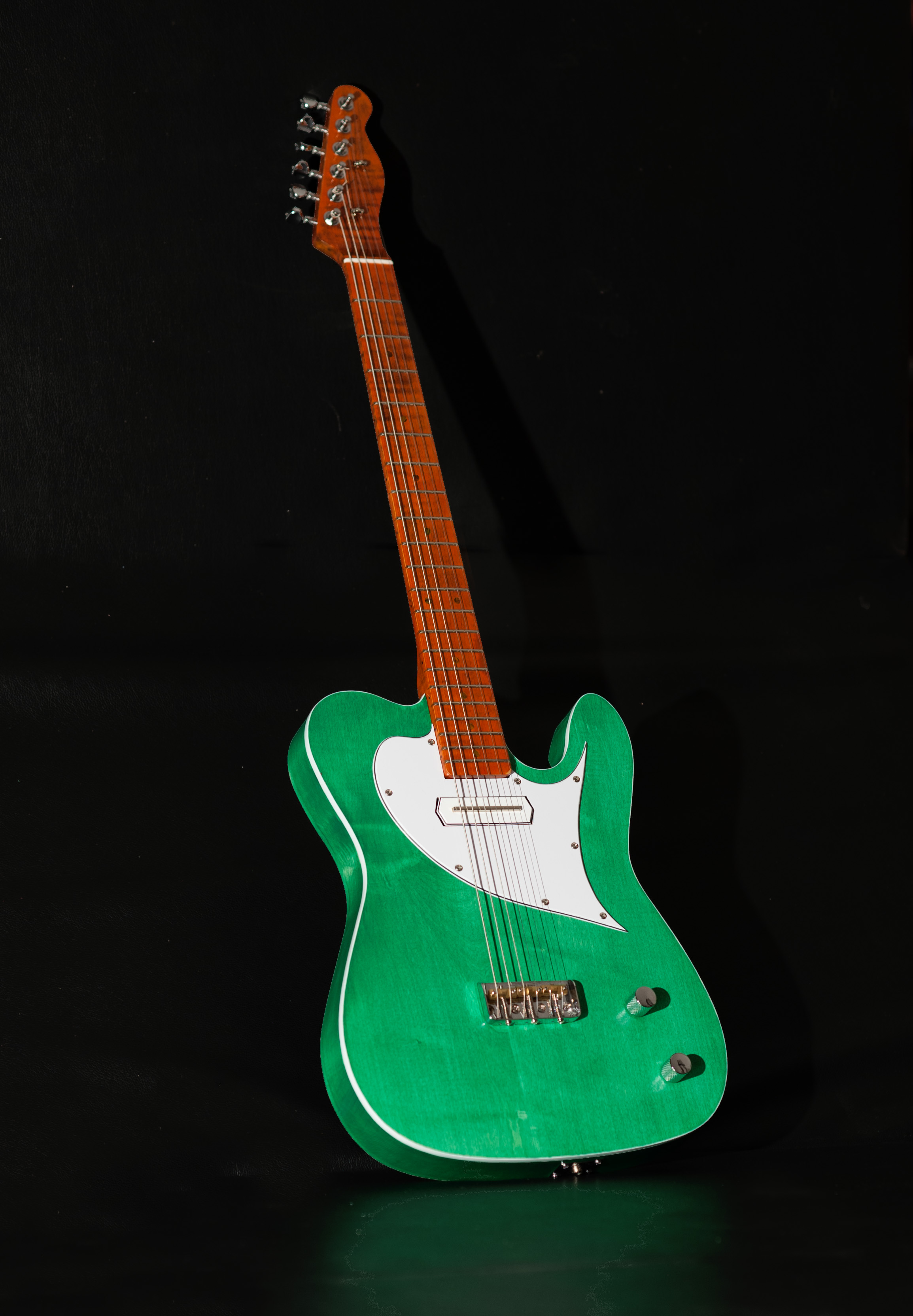 Tělo je z obyčejného javoru, silnější (50mm), duté prakticky všude kromě místa pod kobylkou (struny jdou skrz, tělo je vyfrézované a přilepená zadní deska). Vyzkoušel jsem si lemovku, jakousi nehodou jsem si vyzkoušel výrobu kostěného nulťáku (od nuly z kvádru), vyzkoušel jsem si výrobu pickguardu (to mě otrávilo úplně maximálně). Povrchová úprava je pigmentovaný olej + tvrdovoskový olej transparentní.