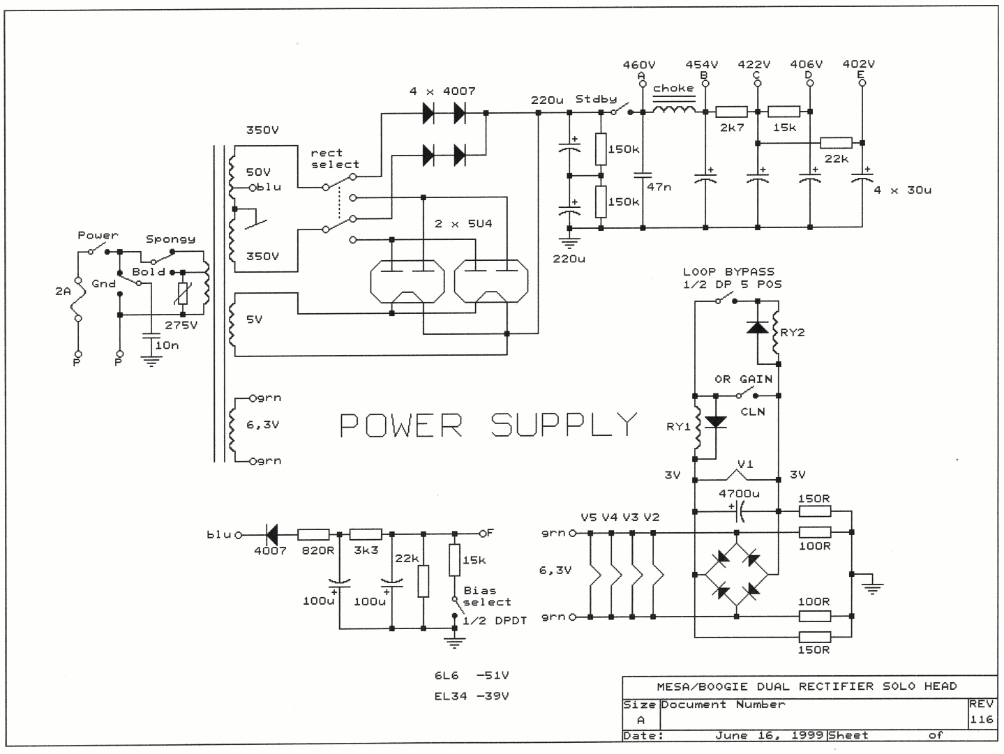 . Když chceš nějaká čísla, tak pro Mesu sice nemám, ale Peavey mívají u higainů nastavený stock bias na 28mA, což dělá při daném Ua cca 44%. Jak správně napsal core88, údaj Ti bude asi k ničemu, protože Mesa DR nemá bez úpravy možnost nastavování biasu, má pouze přepínač 6L6GC - EL34. Když to chce mít extra cold, může použít nf generátor a osciloskop a nabiasovat jen tolik, aby zmizely zářezy na sinusovce při přechodu "nulou", neboť nevěřím, že by se někomu mohlo líbit ve zvuku přechodové zkreslení. Tak vypadá napájecí zdroj včetně zdroje -Ug1: