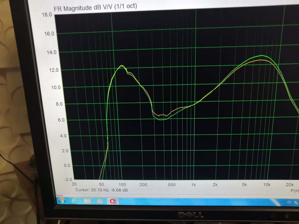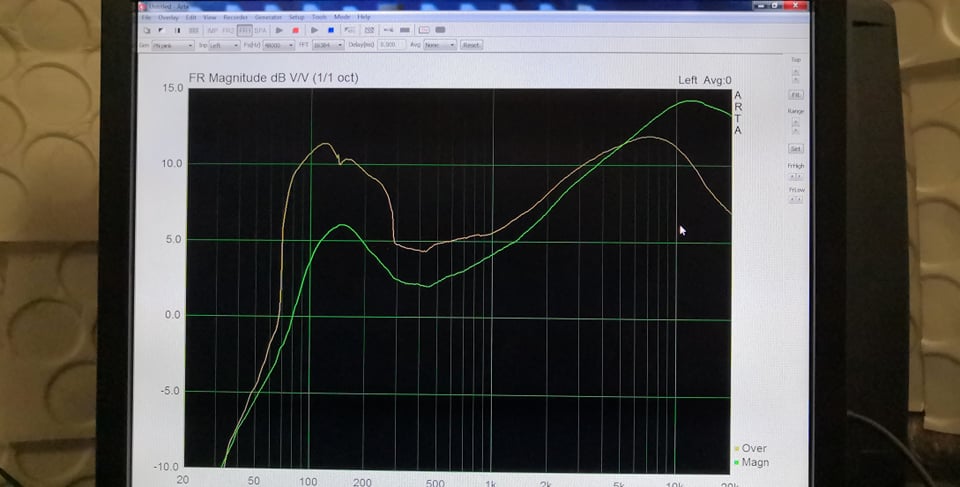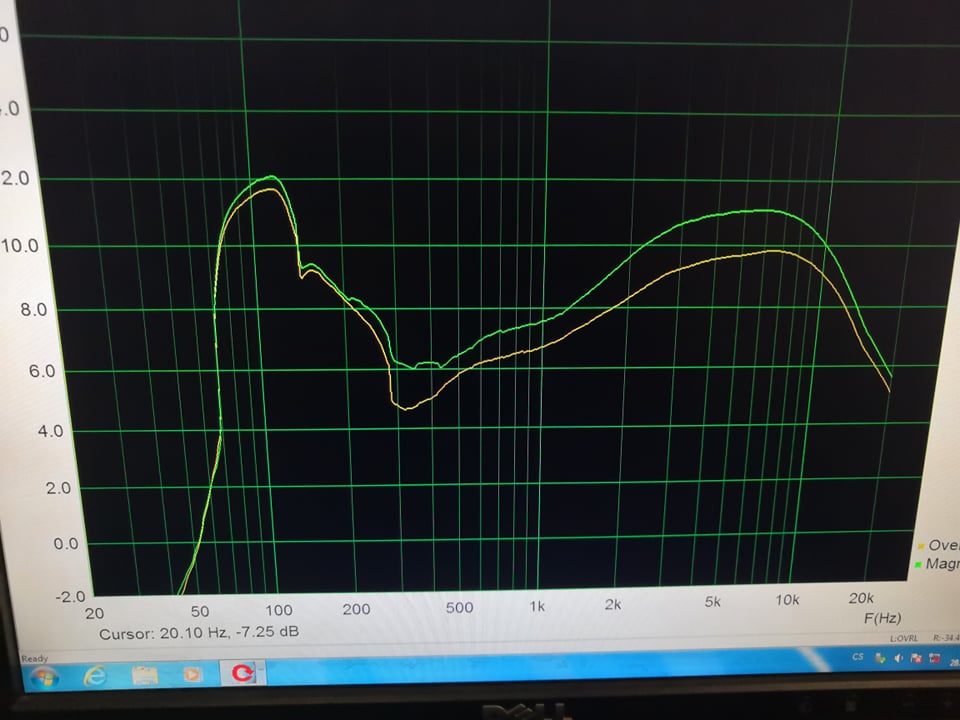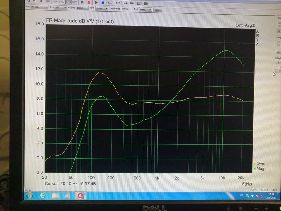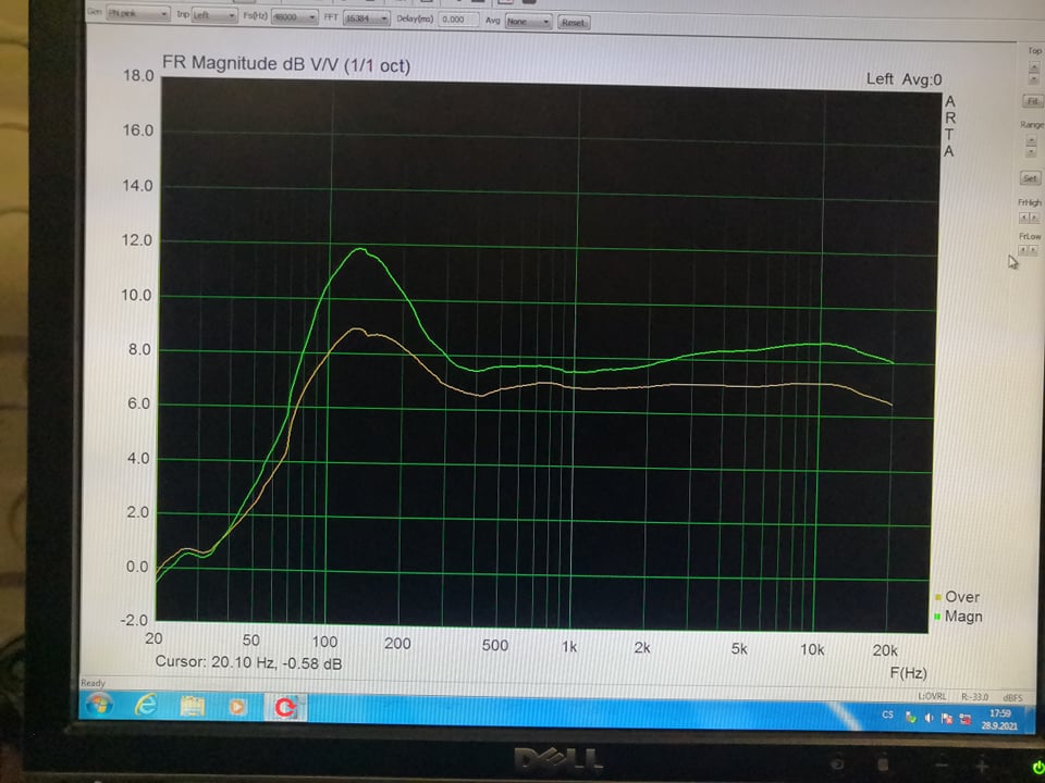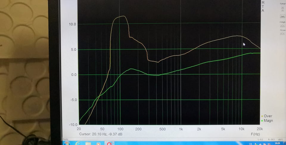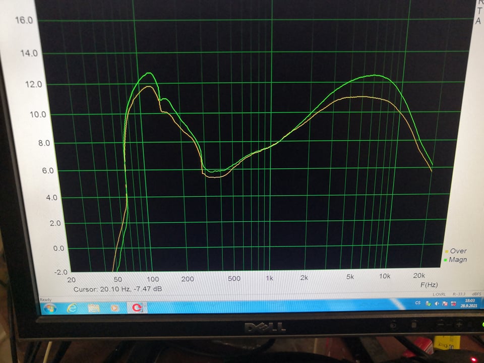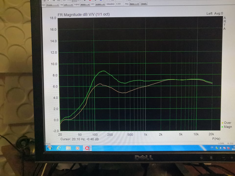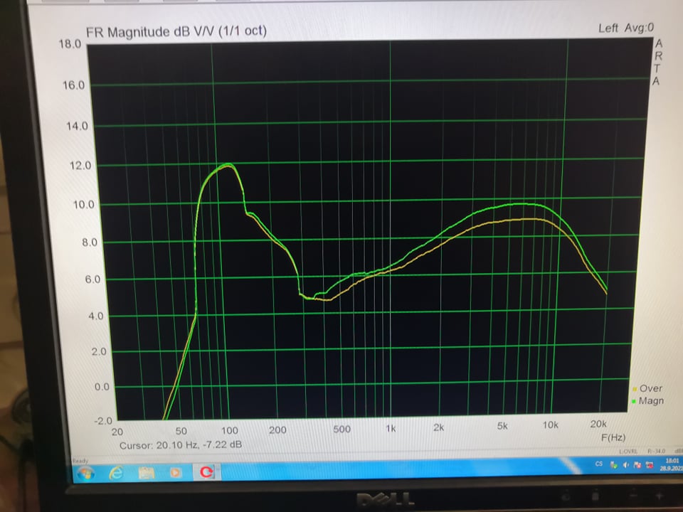 Z výstupu zvukovky v PC jsem zapojil kabel, kterej ved do returnu aparátu. Mezi aparát a reprobox jsem připojil DI box Behringer GI100 ULTRA-G, na kterym byly veškerý přepínače(spínače) vypnutý. Z xlr výstupu DI boxu (značenýho output to mixer) jsem to zapojil zpět do vstupu zvukovky v PC. V něm jsem pustil program ARTA, kterej generuje bílej šum a vylezly mi ty grafy, který jsem fotil vejš. Sice telefonem, ale přečíst se to dá