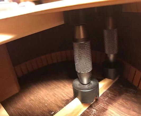 V poslední době jsem často opravoval odlepená žebra v akustických kytarách. Závada se projevuje drnčením přední nebo zadní desky o uvolněné žebro. Někdy se to projevuje jen při určité frekvenci, například drnčení rozvibruje pouze jeden konkrétní akord. Poklepáváním a přitlačováním desky se pak určí místo defektu. Když člověk nemá příliš velké ruce, většinou to lze opravit skrze otvor v ozvučnici. Lepidlo do místa opravy dostávám pomocí injekční stříkačky s hadičkou. Na zafixování žebra je třeba mít rozpěrky nebo mini hever, který žebro přitáhne k desce. Vše ve velikosti, která projde otvorem v ozvučnici. Obyčejnou rozpěrku jsem si vyrobil ze dřeva se závitovou vložkou a stavěcí nohy s plastovým otočným koncem. Pak také používám mini hever co je z oblasti modelářství, na ten jsem za pár korun nedávno narazil. Pak jsou tu originální pomůcky co se dají koupit (rozpěrky, nůžkový hever, píst s balonkem atd.) Přidávám nějaké foto k inspiraci.